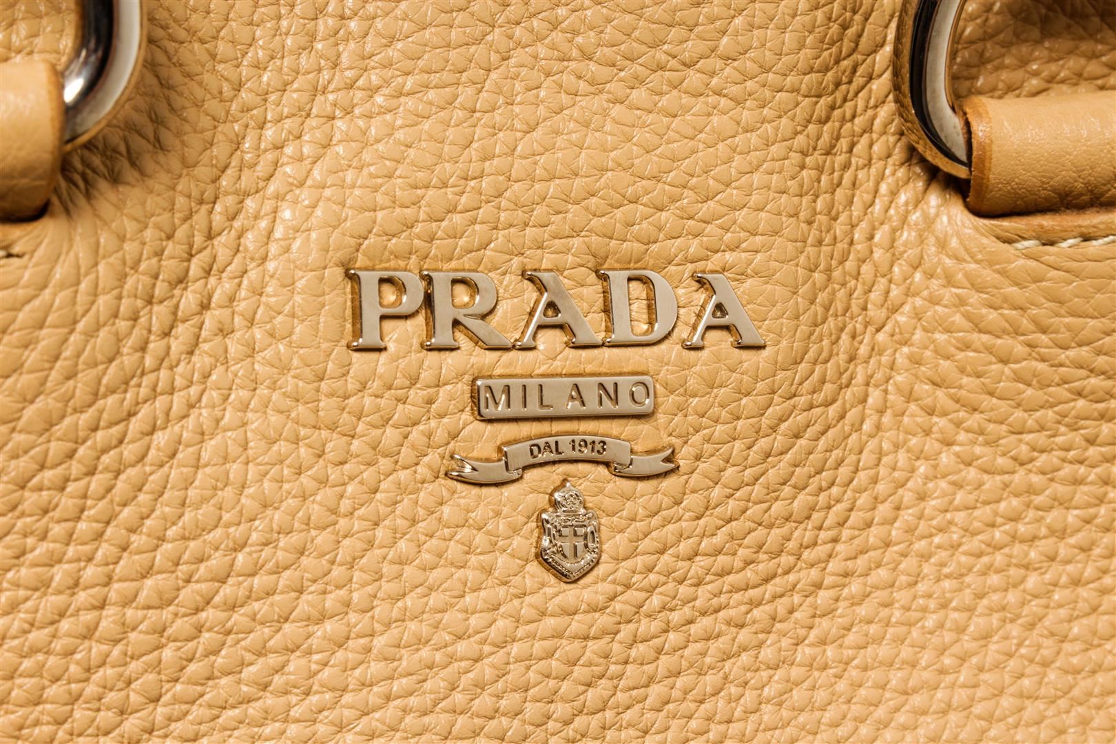 One Prada Beige Grained Leather Vitello Daino Large Convertible Shopper Tote Bag. Item is sold AS-IS. All available information is listed in the description and shown in the photo. Prada Beige Grained Leather Vitello Daino Large Convertible Shopper Tote Bag with gold-tone hardware, leather bag tag hang on the handles, metal Prada logo at the front, Prada scripted logo beige fabric lining, interior slip pocket, dual leather top handles, detachable leather shoulder strap, and zip closure at the top. .