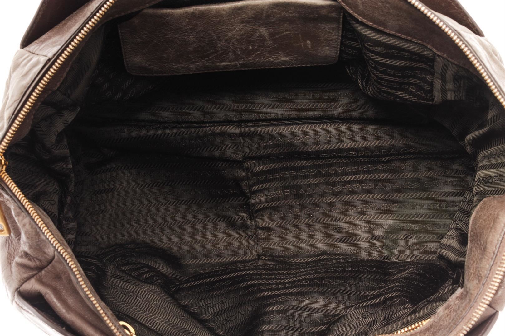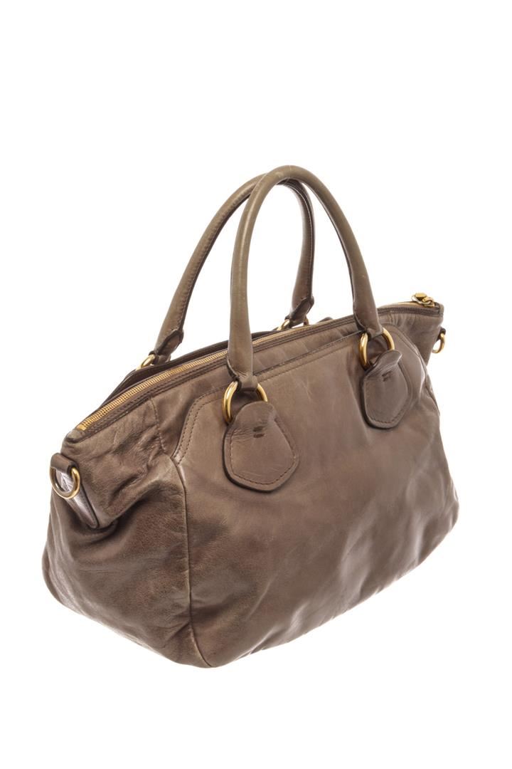 Prada Beige Leather Two Way Bag. All available information is listed in the description and shown in the photos. Prada Beige Leather Two Way Bag with gold-tone hardware, interior zip pocket, Dual rolled top handles, adjustable leather shoulder strap, zip closure.