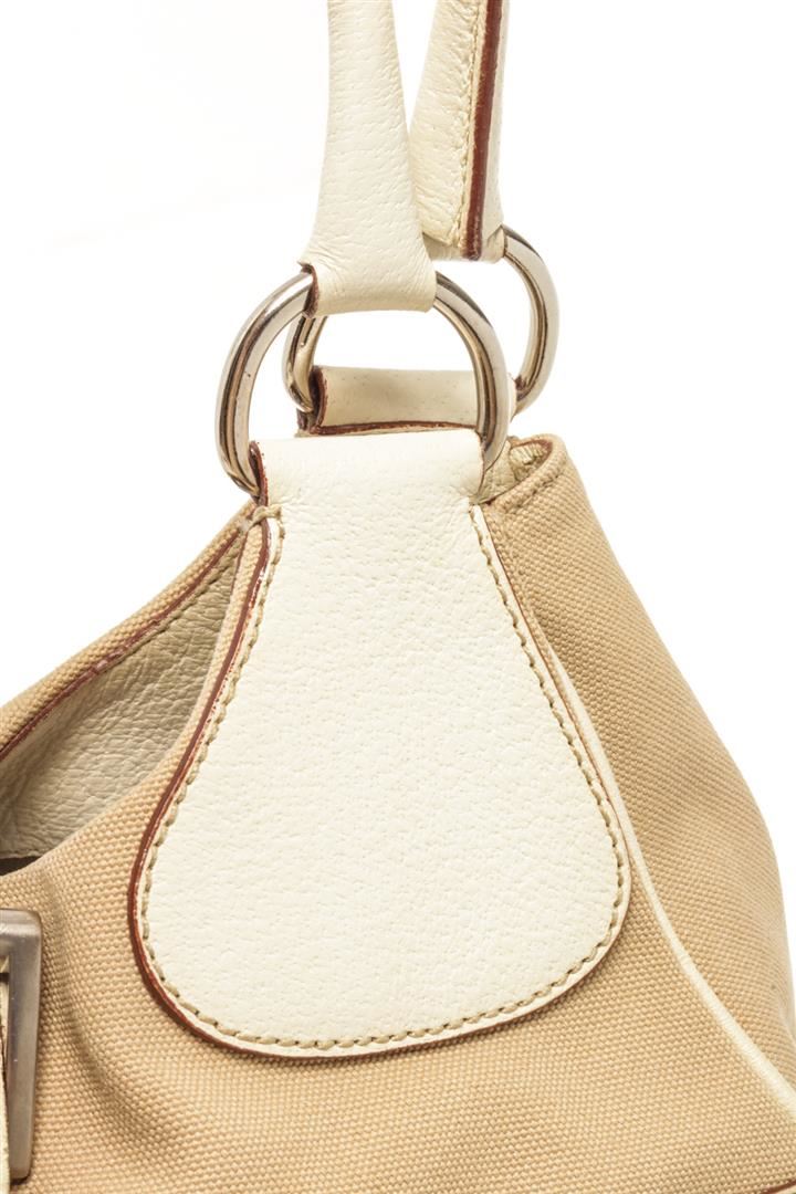 One Prada Beige Nylon Leather Shoulder Bag. Item is sold AS-IS. All available information is listed in the description and shown in the photo. Prada Beige Nylon Leather Shoulder Bag with this shoulder bag features a canvas body with leather trim, rolled leather handles, a top strap with a buckle closure, interior zipper pocket, Prada fabric lining, silver hardware. Height: 11" Width: 13.8" Depth: 4.7", Handle Drop: / 27.94 x 35.05 x 11.93 Cm
