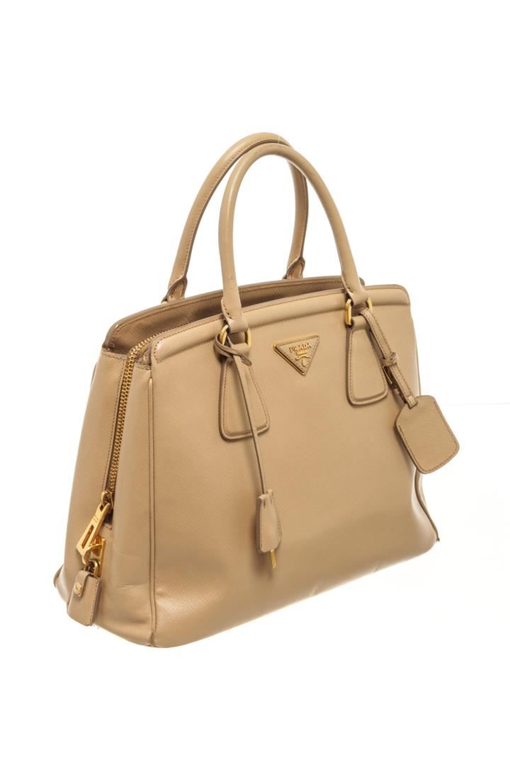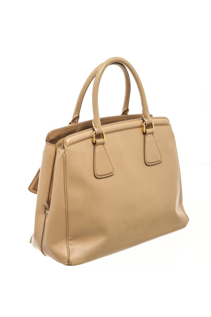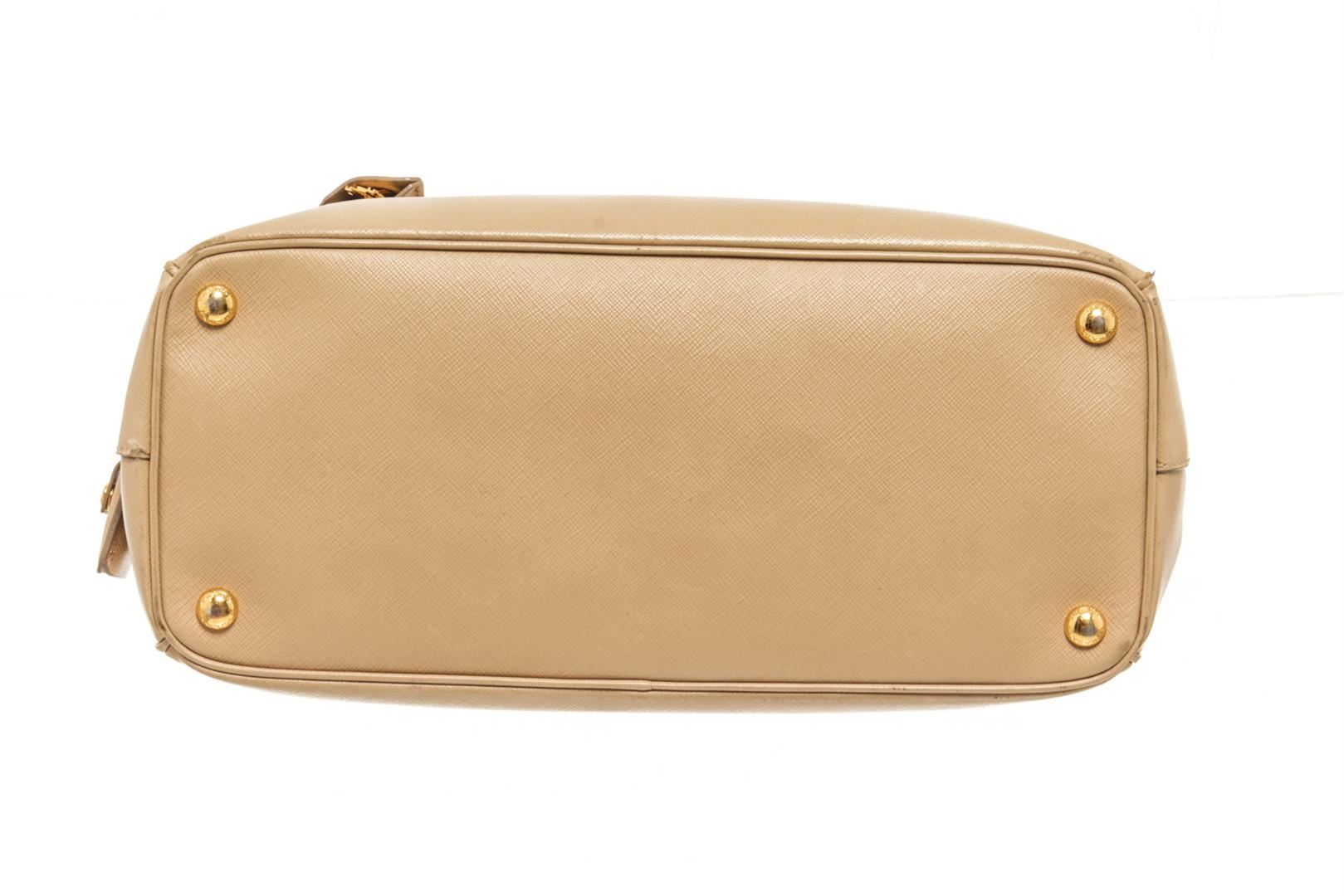 One Prada Beige Saffiano Lux Leather Galleria Tote Bag. Item is sold AS-IS. All available information is listed in the description and shown in the photo. Prada Beige Saffiano Lux Leather Galleria Tote Bag with two top handles, the triangular brand logo at the front, shoulder strap, gold tone hardware, zipper closure, Prada fabric lining, interior zipper/slip pockets. Height: 23" Width: 15" Depth: 34", Handle Drop: / 58.42 x 38.1 x 86.36 Cm