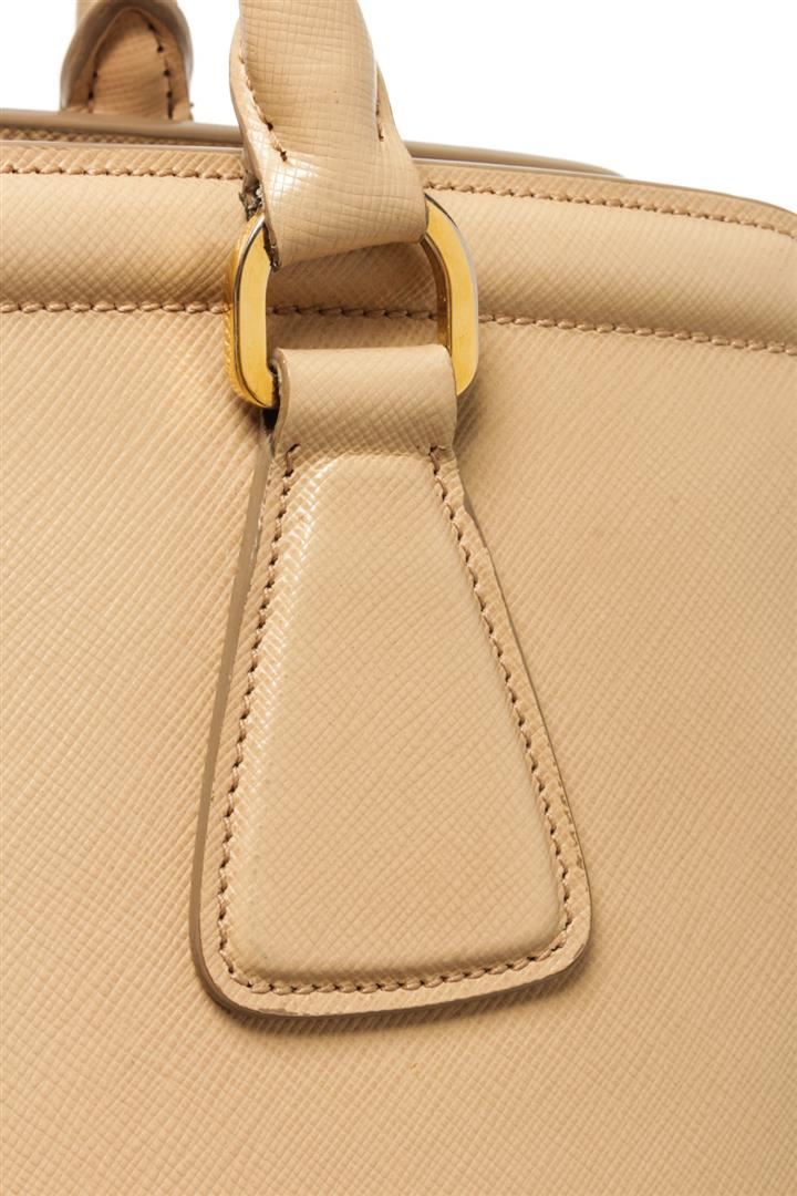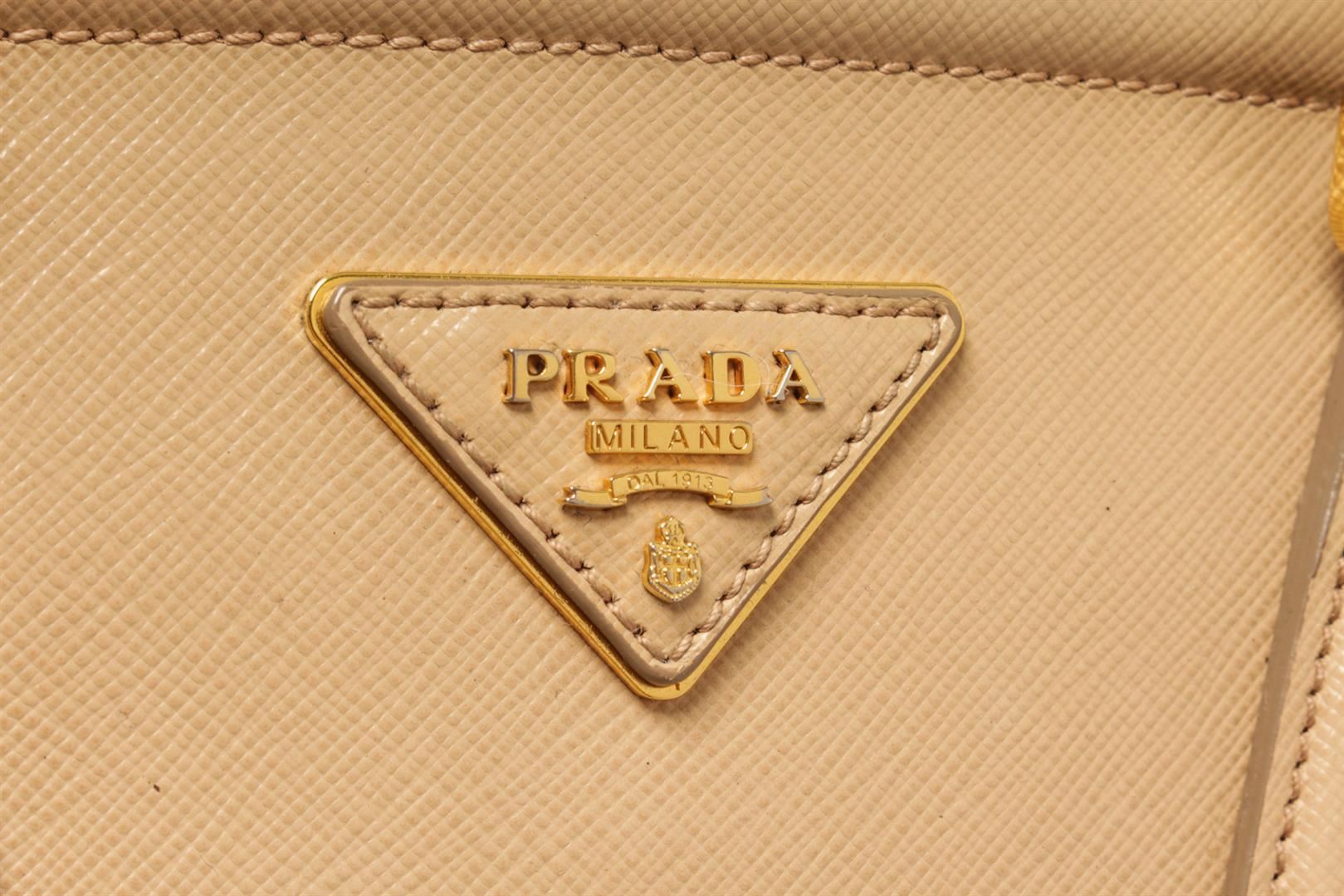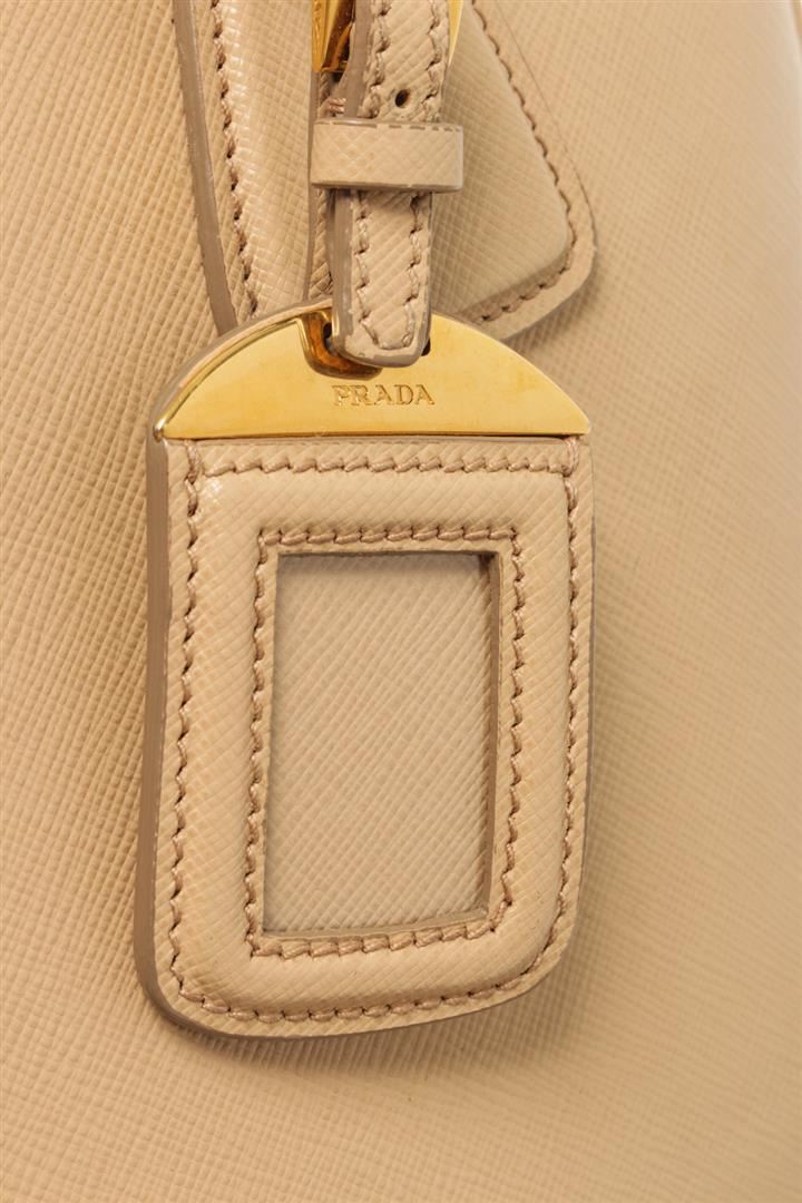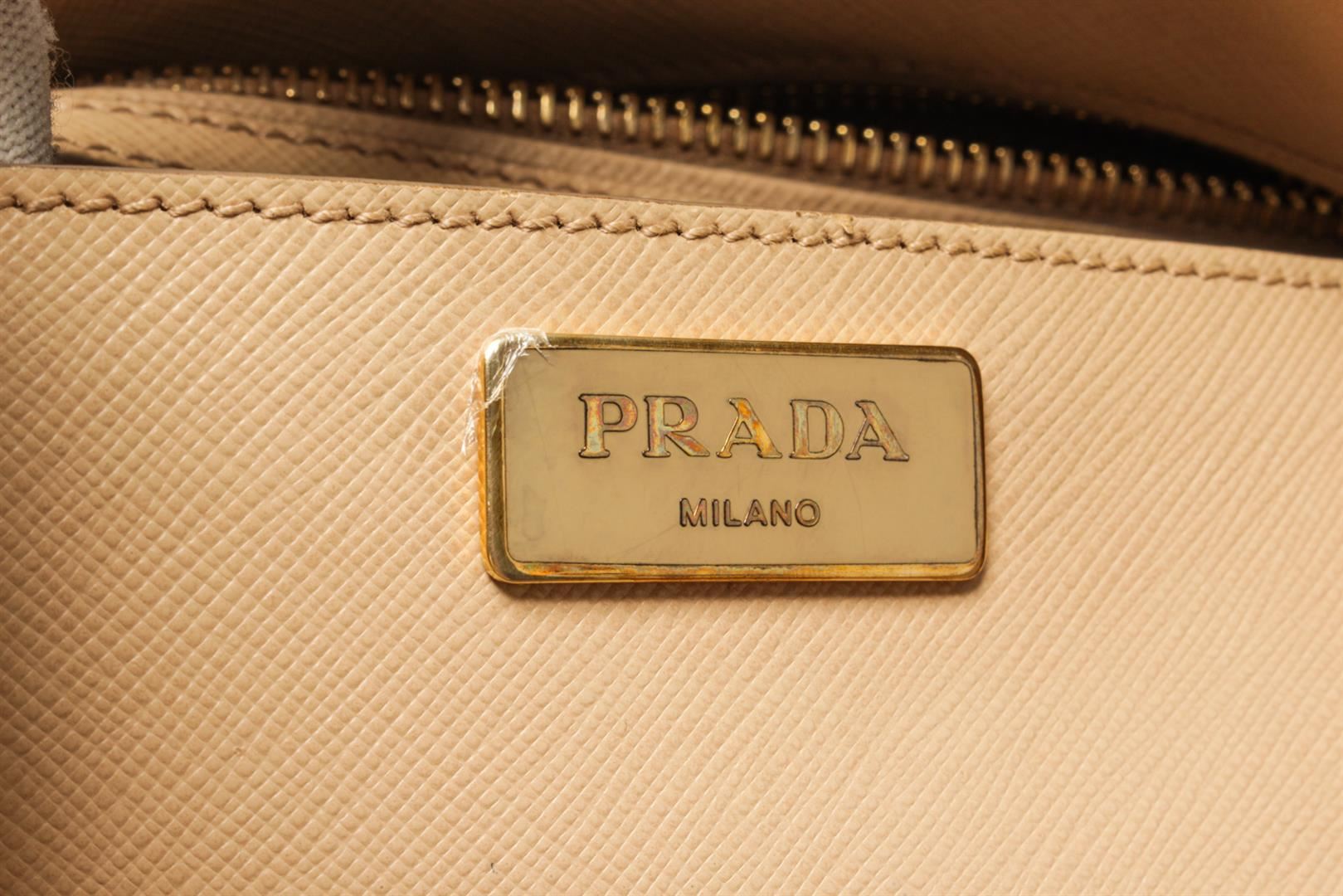One Prada Beige Saffiano Lux Leather Galleria Tote Bag. Item is sold AS-IS. All available information is listed in the description and shown in the photo. Prada Beige Saffiano Lux Leather Galleria Tote Bag with two top handles, the triangular brand logo at the front, shoulder strap, gold tone hardware, zipper closure, Prada fabric lining, interior zipper/slip pockets. Height: 23" Width: 15" Depth: 34", Handle Drop: / 58.42 x 38.1 x 86.36 Cm