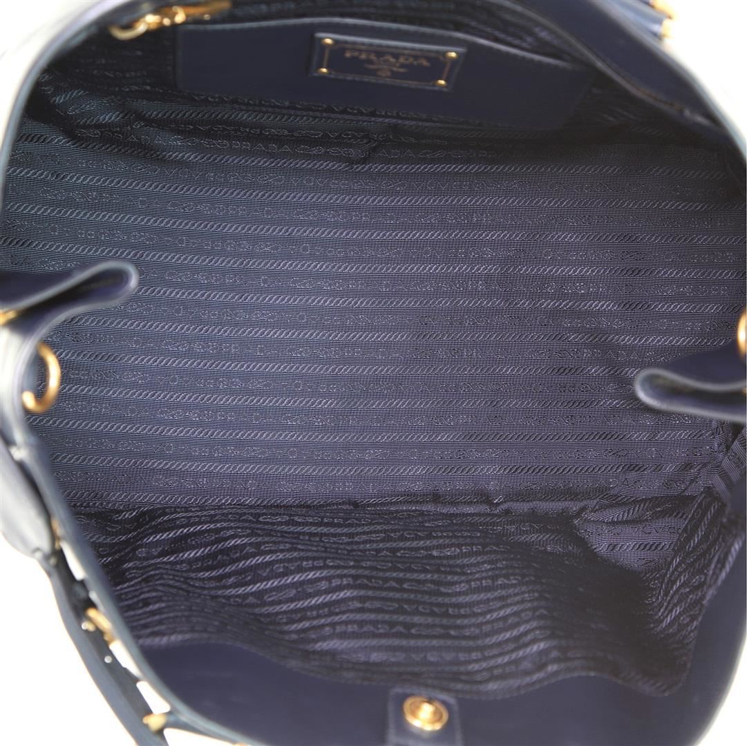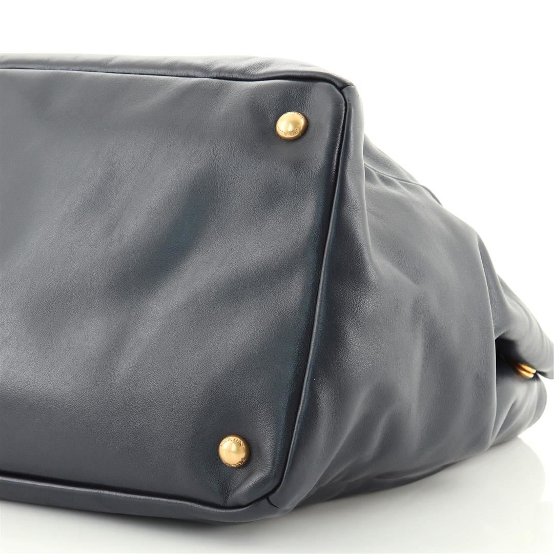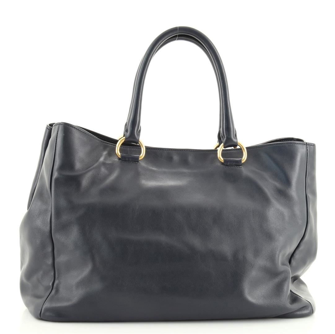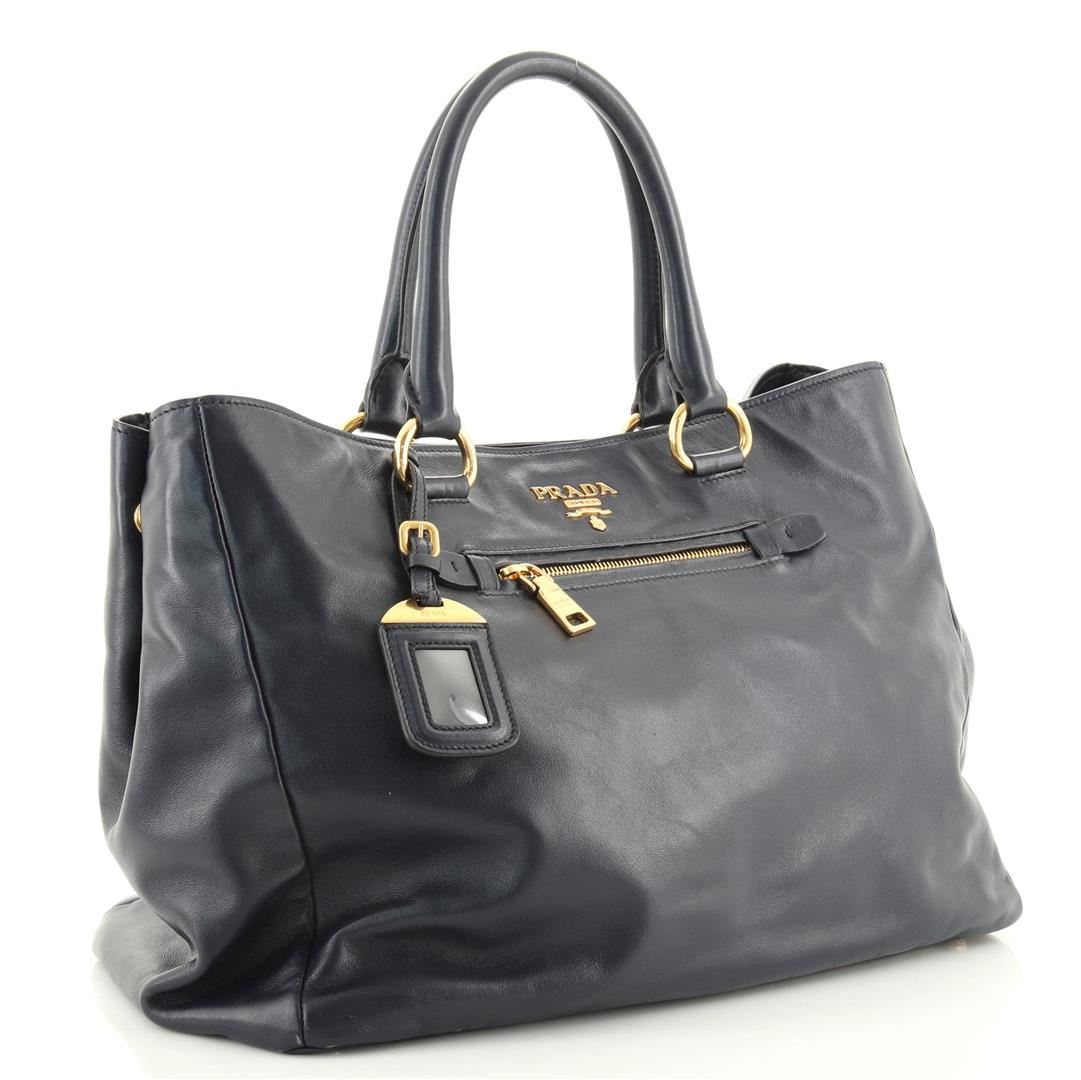 Prada Black Calfskin Leather Front Pocket Convertible Medium Tote Bag Condition Details: Moderate wear on front base corners, creasing and wear on exterior and strap, minor cracking on opening corner wax edges. Light wear on handles, small scuffs on op