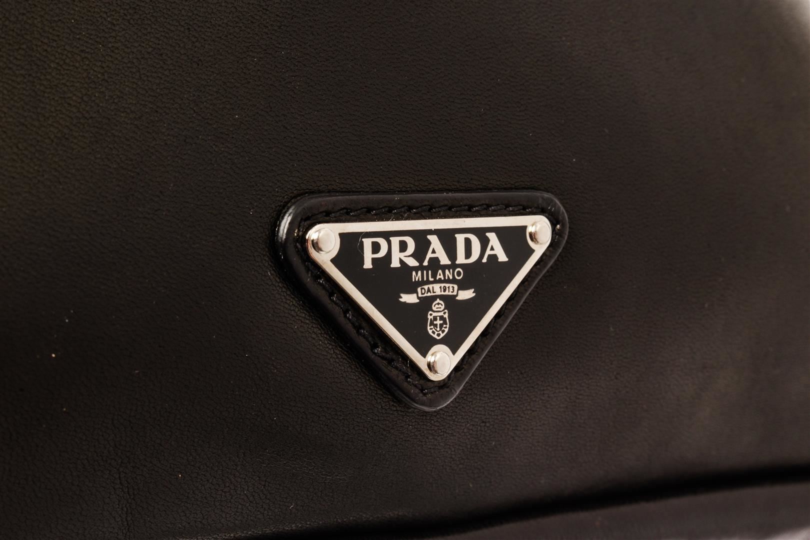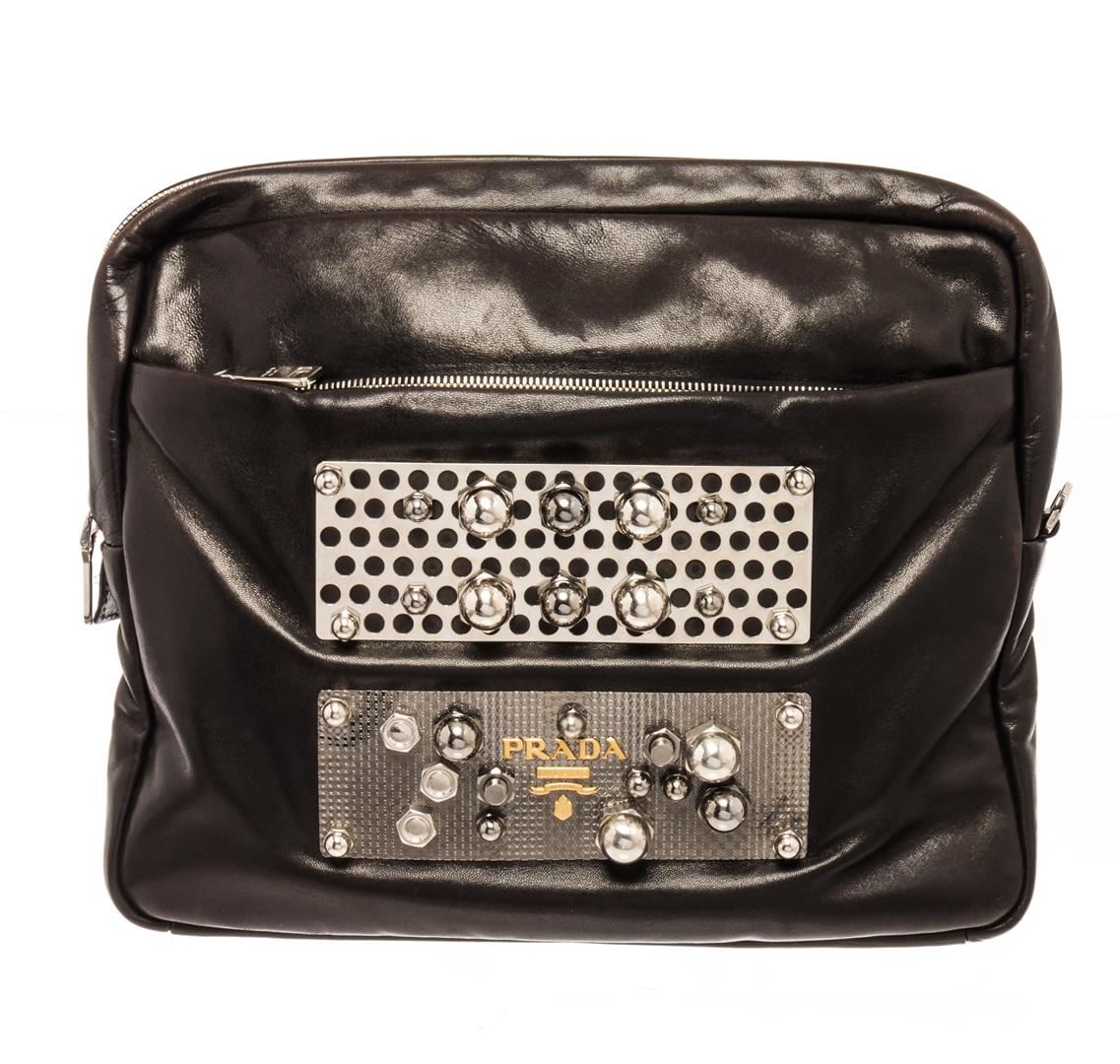 Prada Black Leather Clutch Bag. All available information is listed in the description and shown in the photos. Prada Black Leather Clutch Bag with hardly used and in top condition prada black handheld stylish bag. can fit a small laptop or ipad and can be used as a large clutch or computer/work bag. it has no straps.