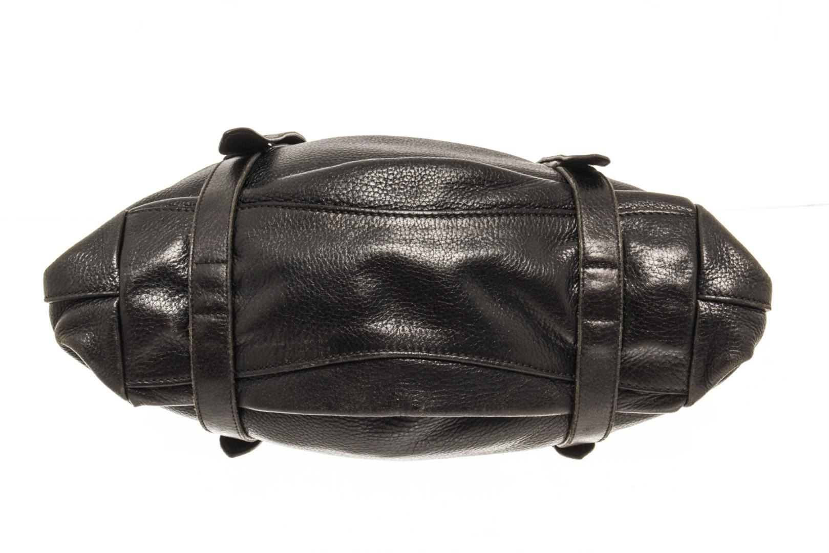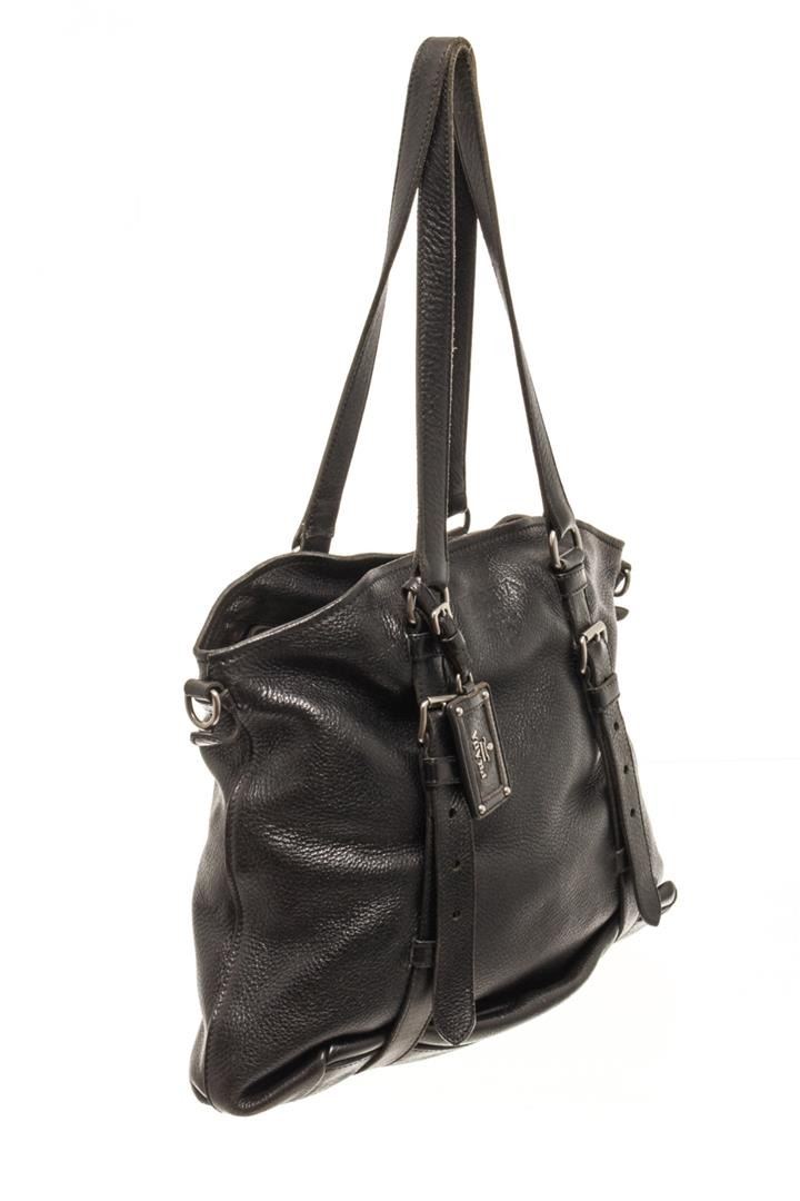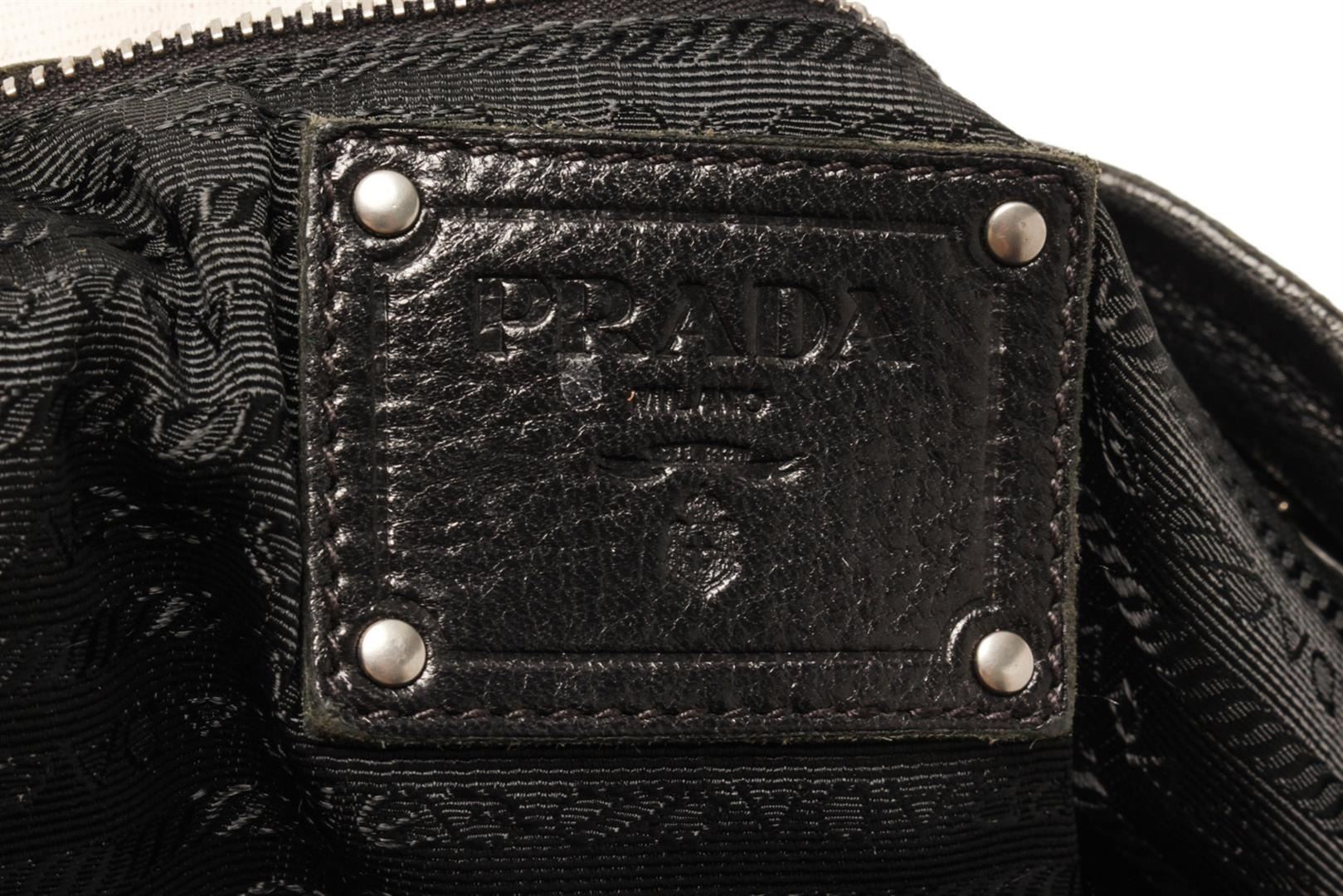 One Prada Black Leather Shoulder Bag. Item is sold AS-IS. All available information is listed in the description and shown in the photo. Prada Black Leather Shoulder Bag with shoulder strap, Prada fabric lining, interior slip pocket, silver tone hardware and magnet closure. Height: 15.74" Width: 17.32" Depth: 5.11" , Handle Drop: 7.87" / 40 x 44 x 13 Cm