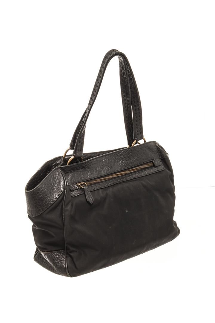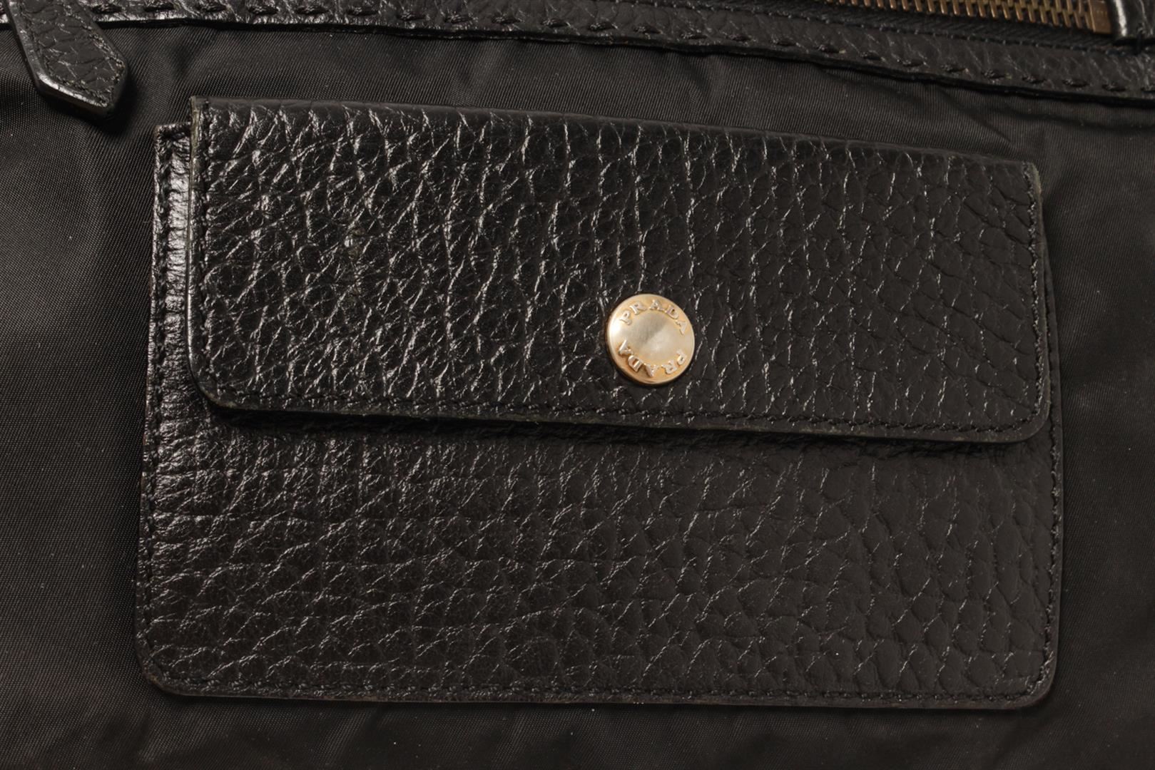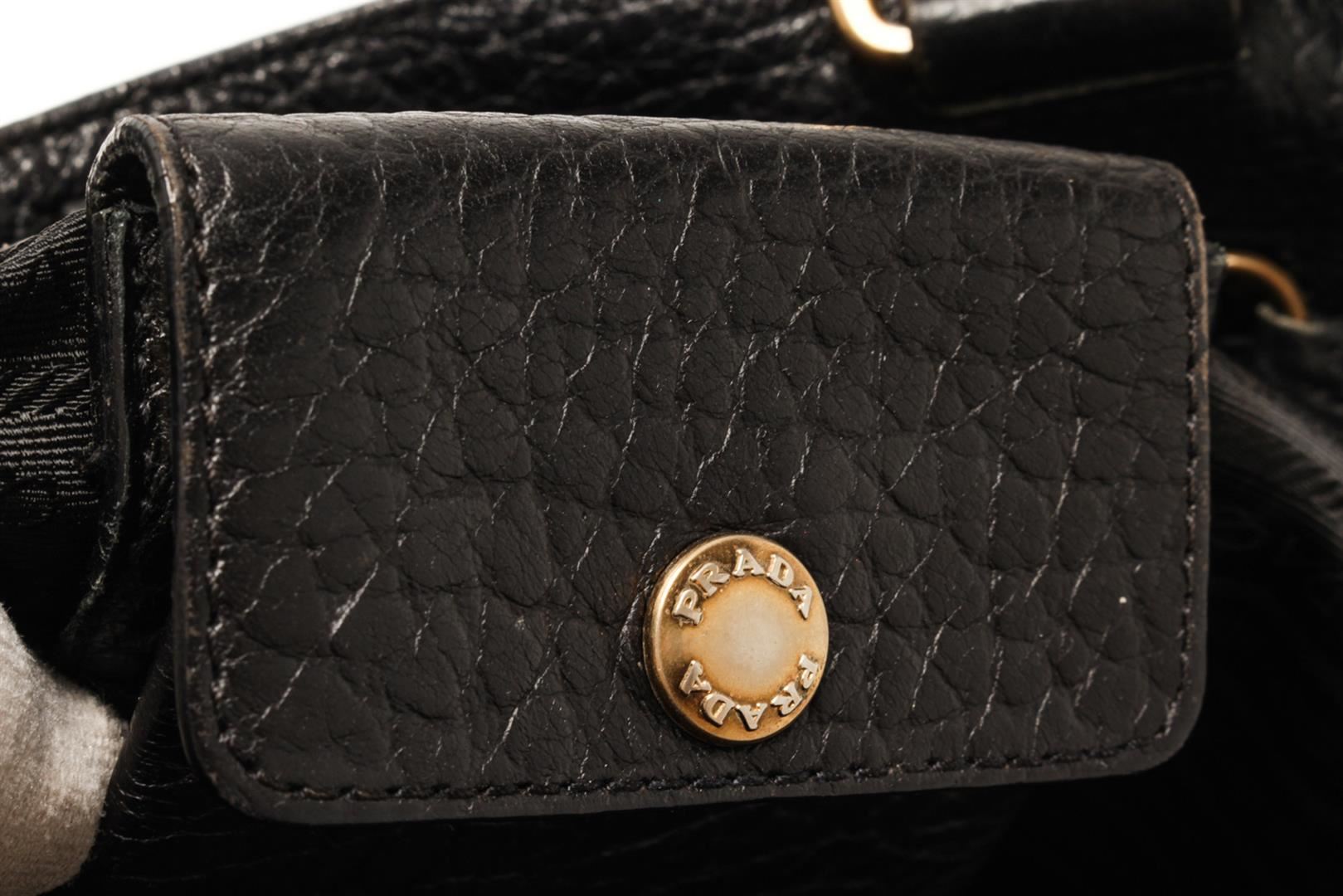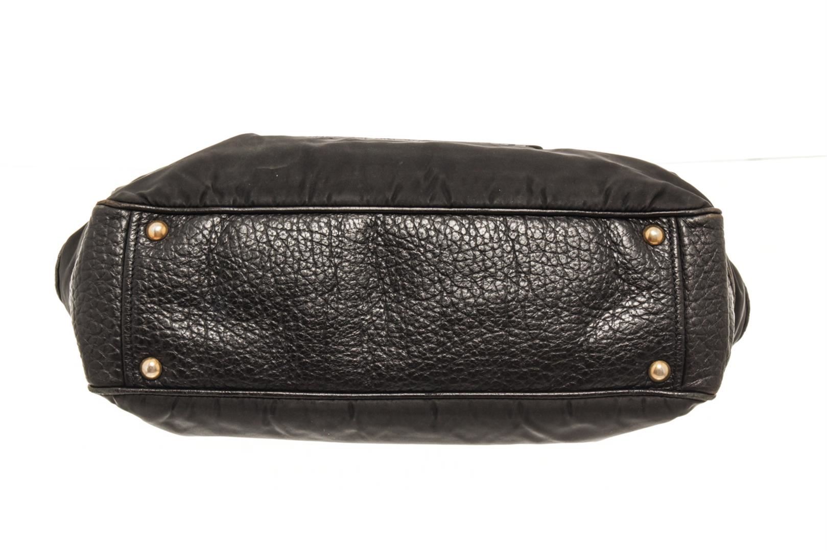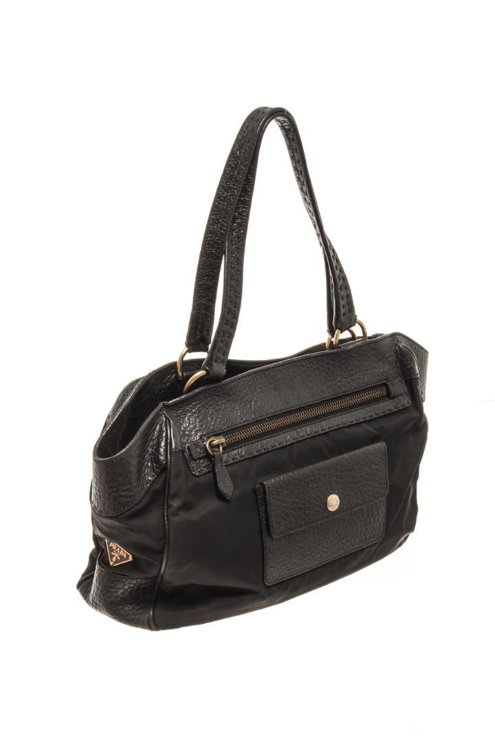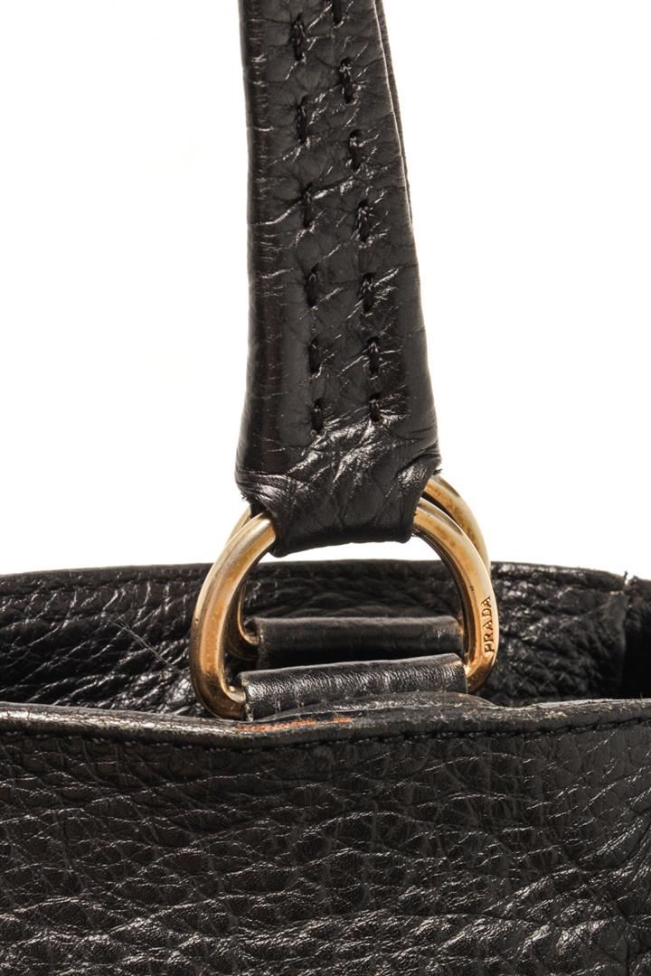 One Prada Black Leather Shoulder Bag. Item is sold AS-IS. All available information is listed in the description and shown in the photo. Prada Black Leather Shoulder Bag with shoulder strap, 2 exterior zipper pocket and snap pocket, Prada fabric lining, interior zipper pocket, snap pocket, gold tone hardware and magnetic closure. Height: 8.3" Width: 15.7" Depth: 3.7", Handle Drop: 7" / 21.08 x 39.87 x 9.39 Cm