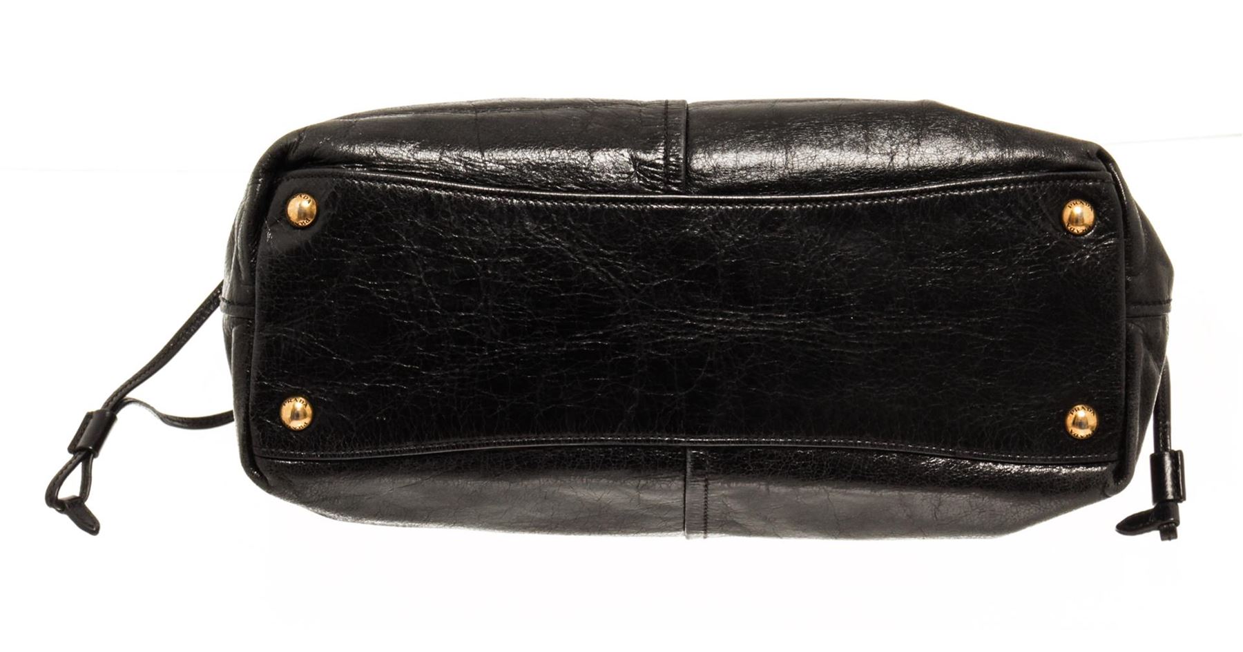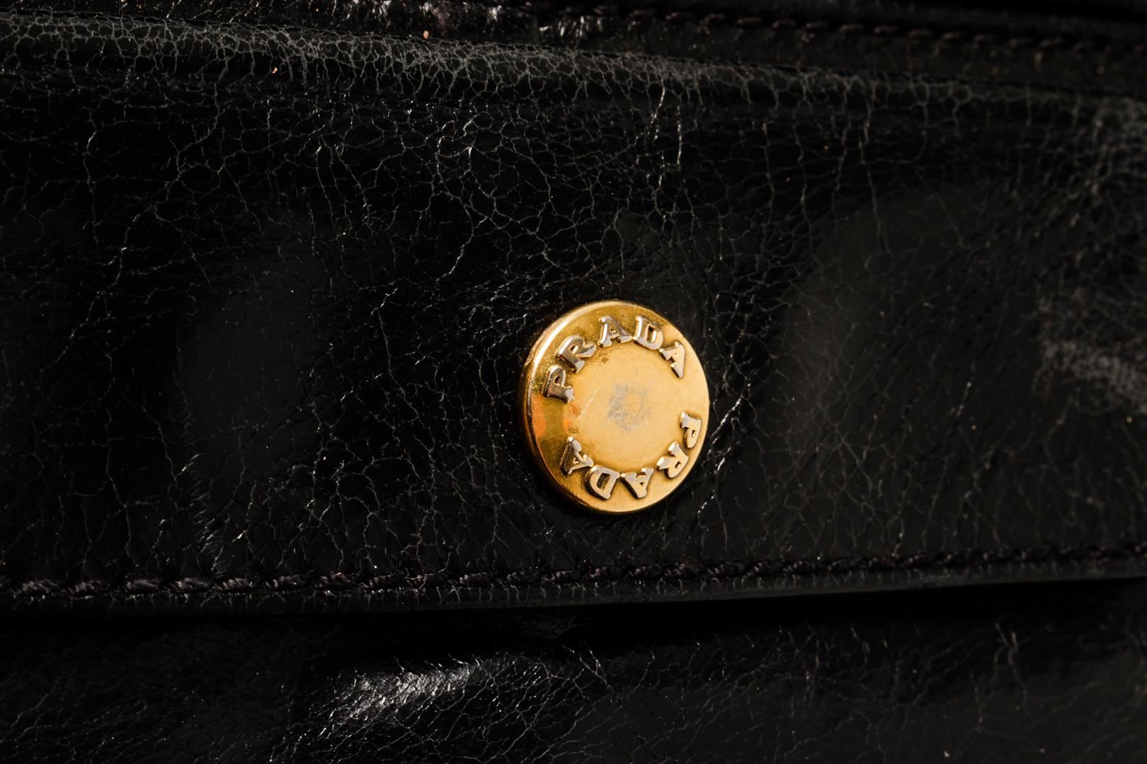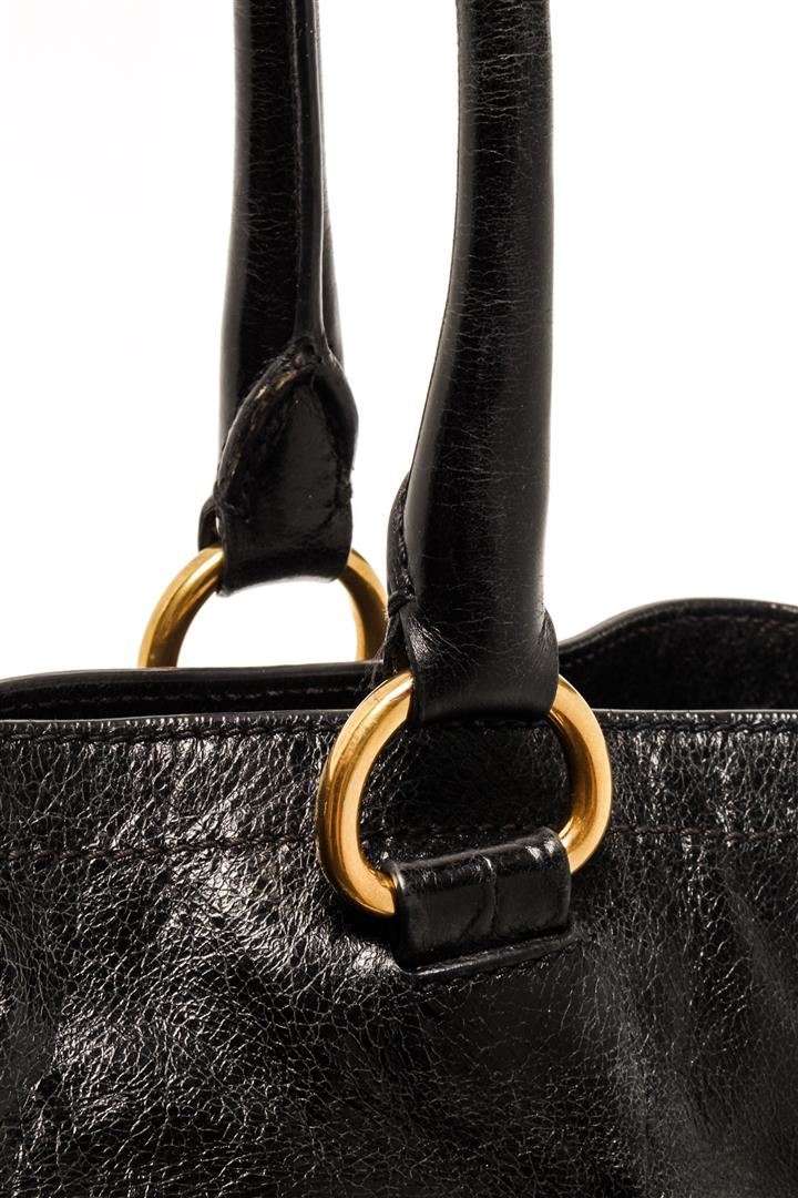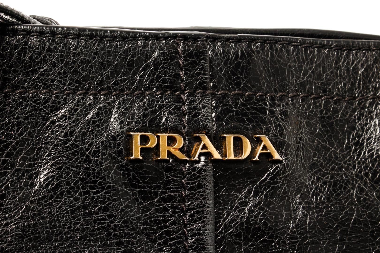 One Prada Black Leather Tote Bag. Item is sold AS-IS. All available information is listed in the description and shown in the photo. Prada black leather tote bag with gold-tone hardware, zip pocket, dual handles and logo on the front. Please note: Lining is very peely.