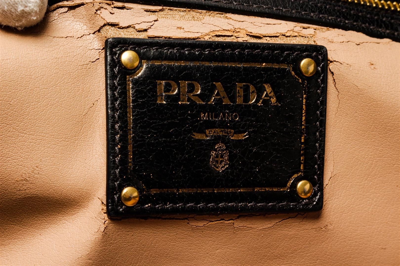 One Prada Black Leather Tote Bag. Item is sold AS-IS. All available information is listed in the description and shown in the photo. Prada black leather tote bag with gold-tone hardware, zip pocket, dual handles and logo on the front. Please note: Lining is very peely.