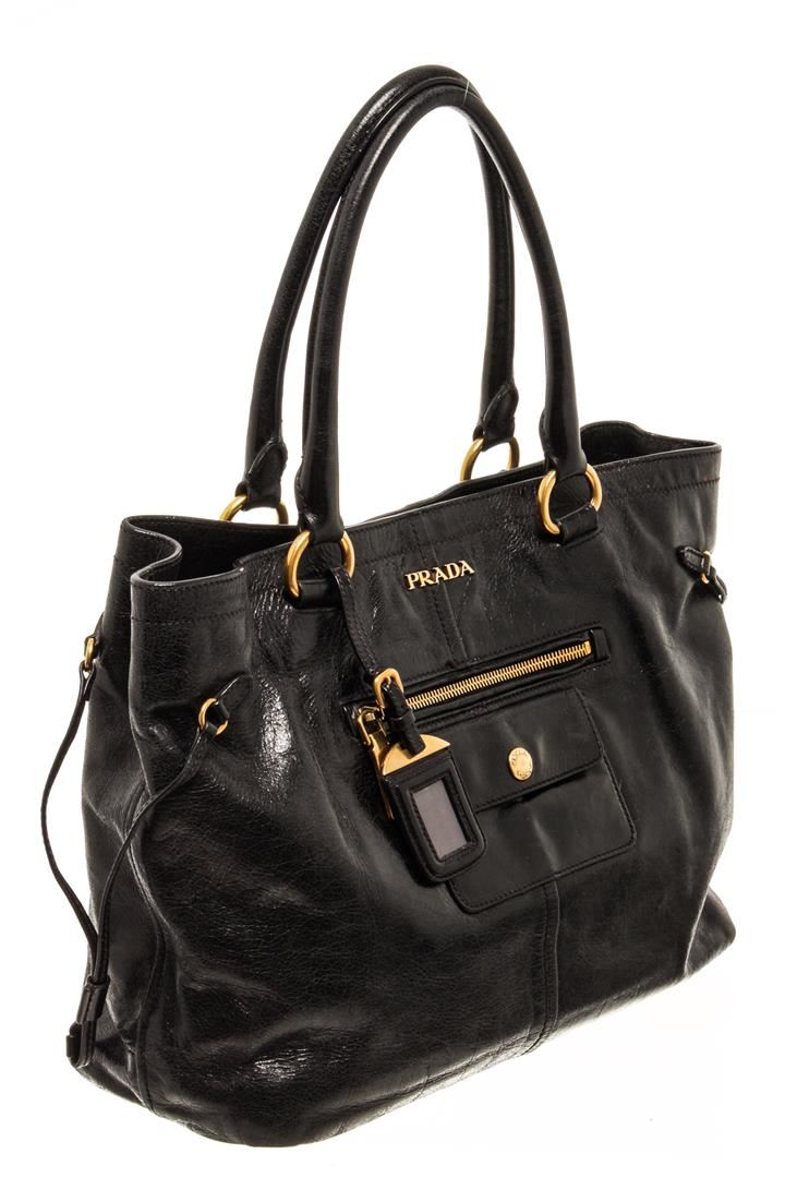 One Prada Black Leather Tote Bag. Item is sold AS-IS. All available information is listed in the description and shown in the photo. Prada black leather tote bag with gold-tone hardware, zip pocket, dual handles and logo on the front. Please note: Lining is very peely.
