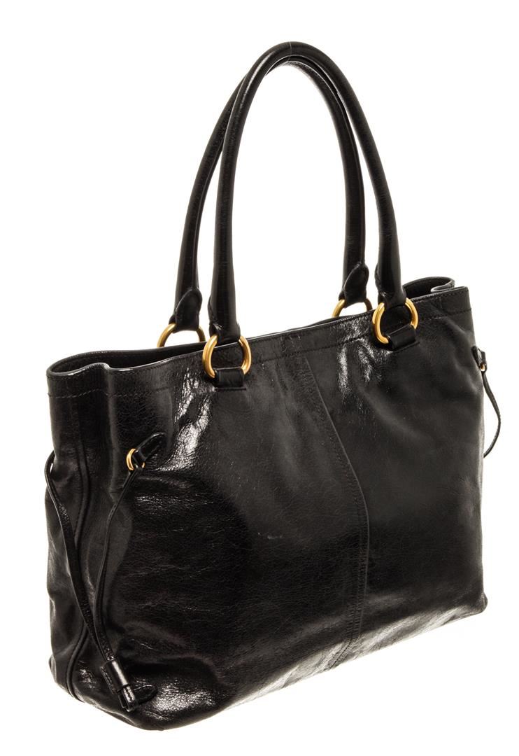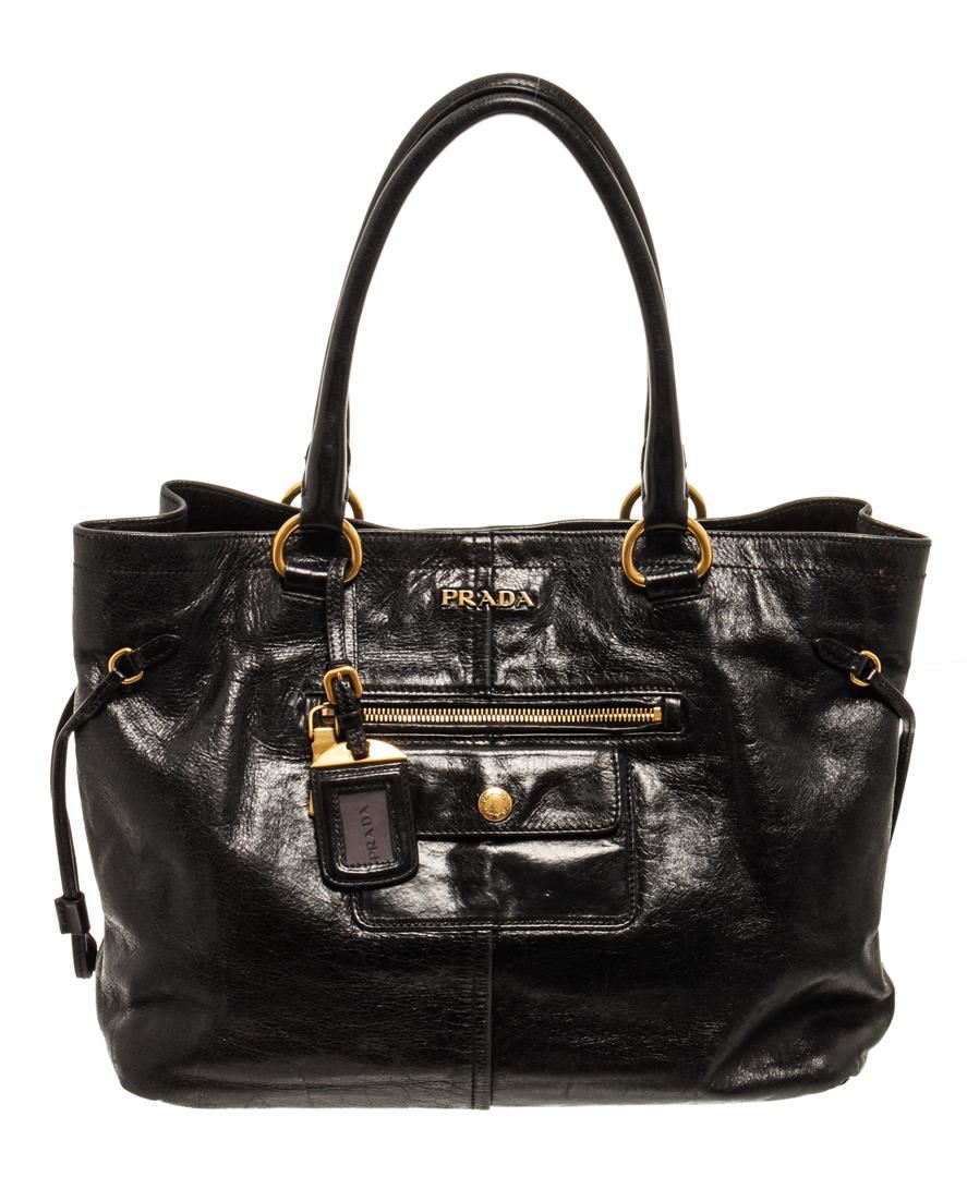 One Prada Black Leather Tote Bag. Item is sold AS-IS. All available information is listed in the description and shown in the photo. Prada black leather tote bag with gold-tone hardware, zip pocket, dual handles and logo on the front. Please note: Lining is very peely.