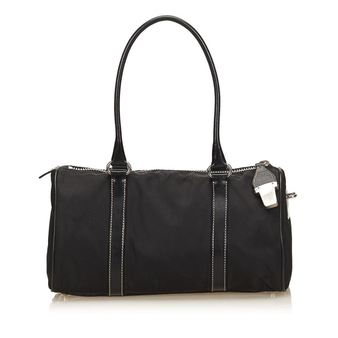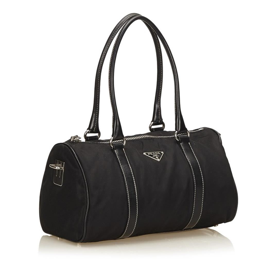 This handbag features a nylon body with leather trim, rolled leather handles, top zip closure, and interior zip pocket.