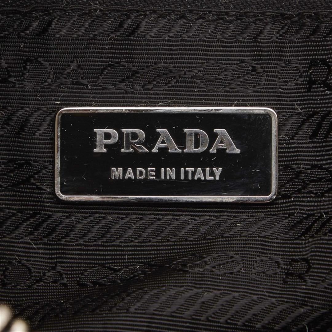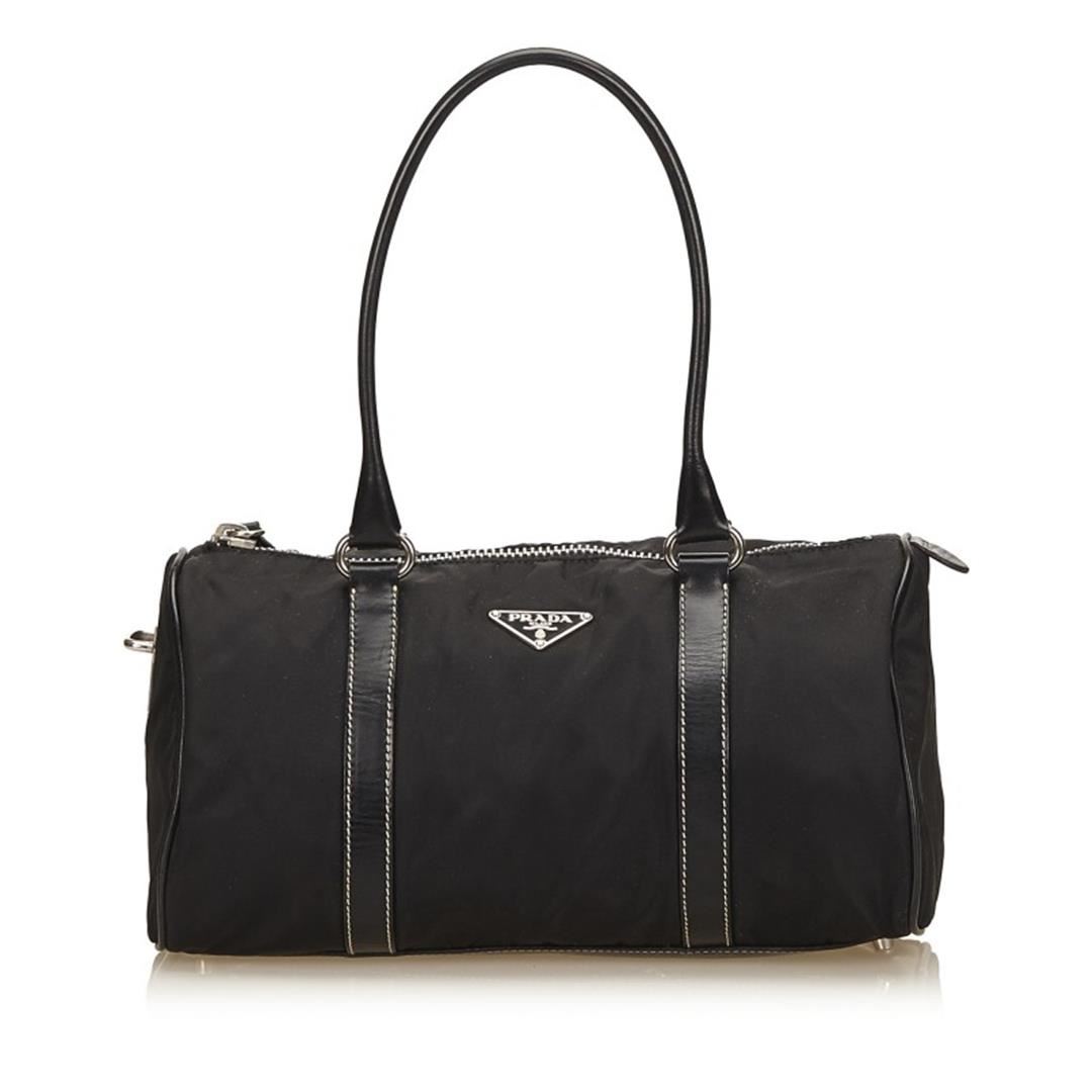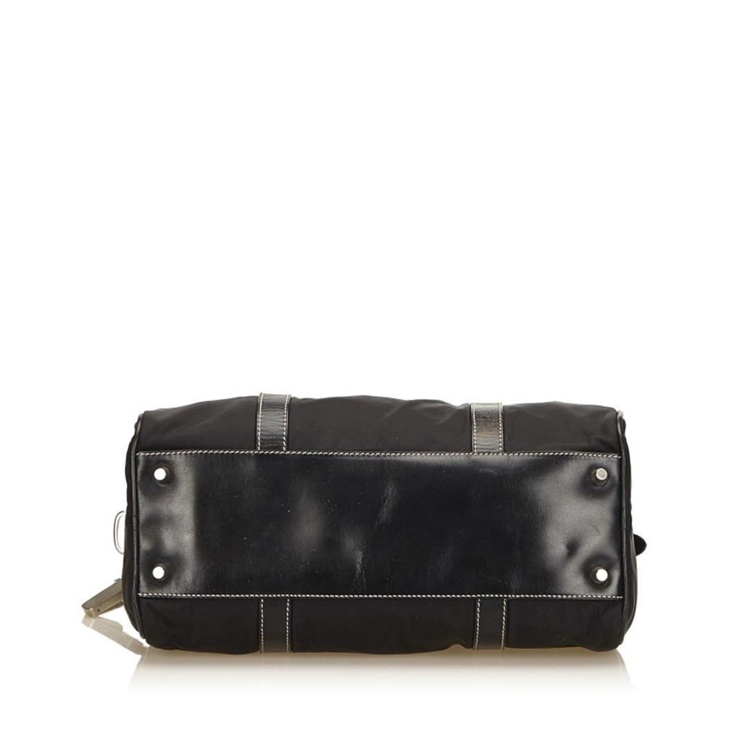 This handbag features a nylon body with leather trim, rolled leather handles, top zip closure, and interior zip pocket. Item is pre-owned.