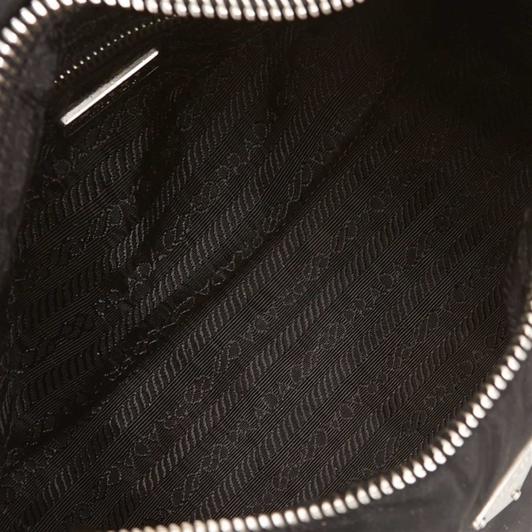This handbag features a nylon body with leather trim, rolled leather handles, top zip closure, and interior zip pocket. Item is pre-owned.
