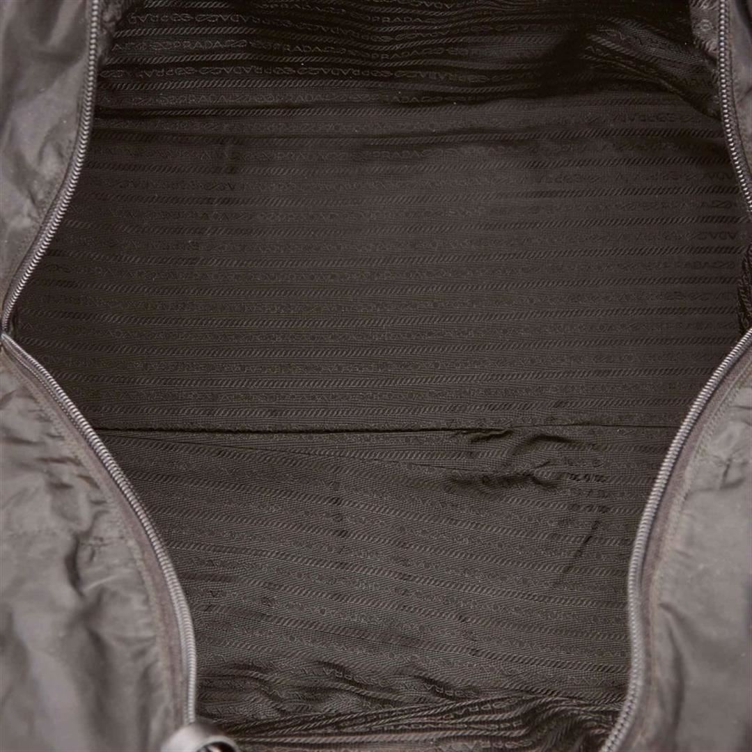 This duffel bag features a nylon body, structured leather handles, a top zip closure, and an interior zip pocket.