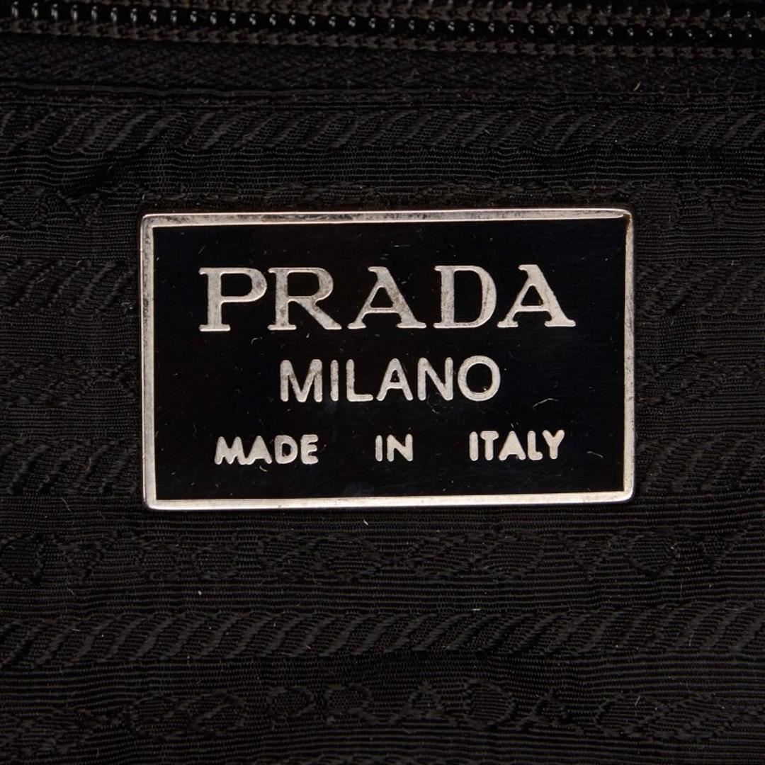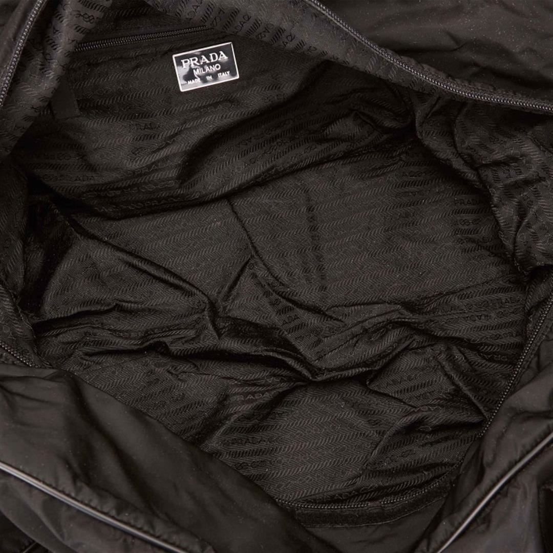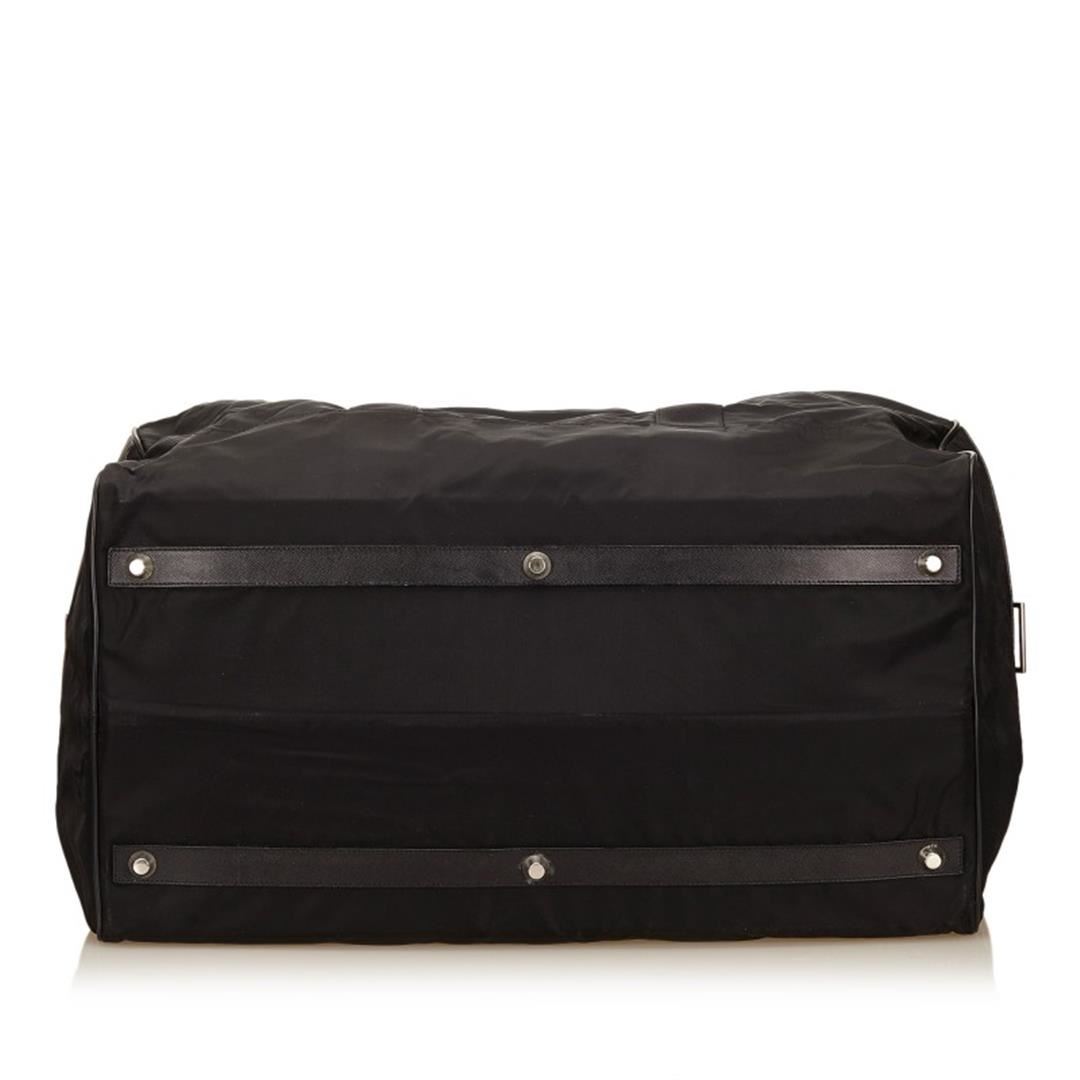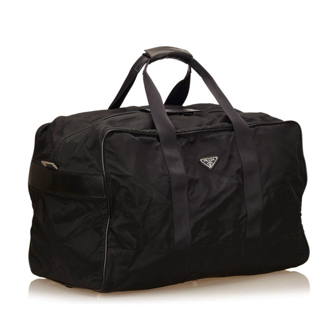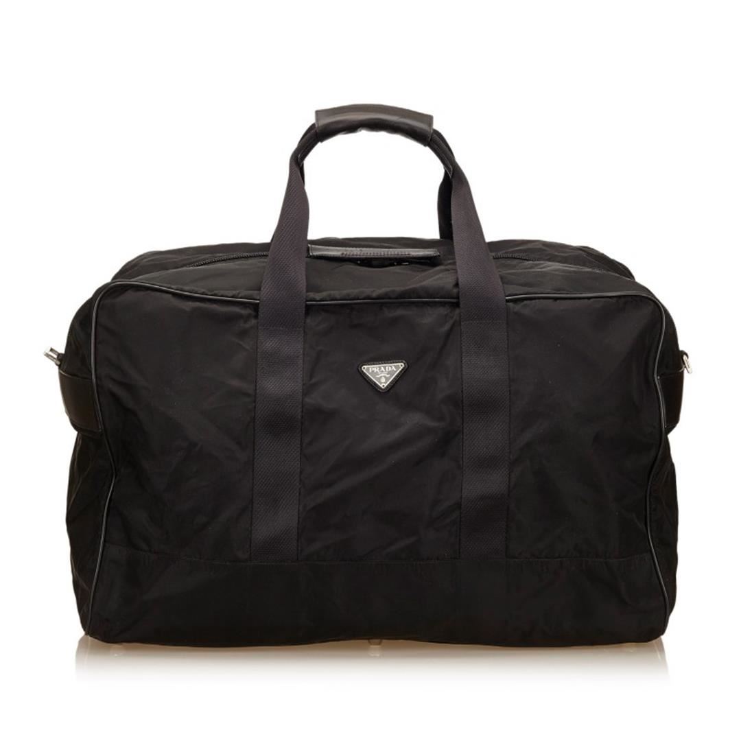 This duffel features a nylon body with leather trim, flat handles, top zip closure, and interior zip pocket. Item is pre-owned.