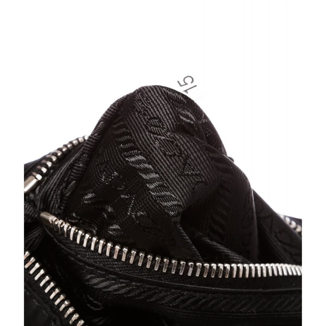 Black nylon Prada shoulder bag with silver-tone hardware, zip top closure, and leather trim. Interior contains black lining and single zip pocket at interior wall.