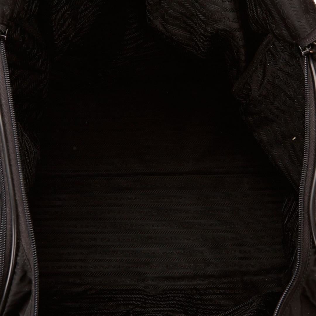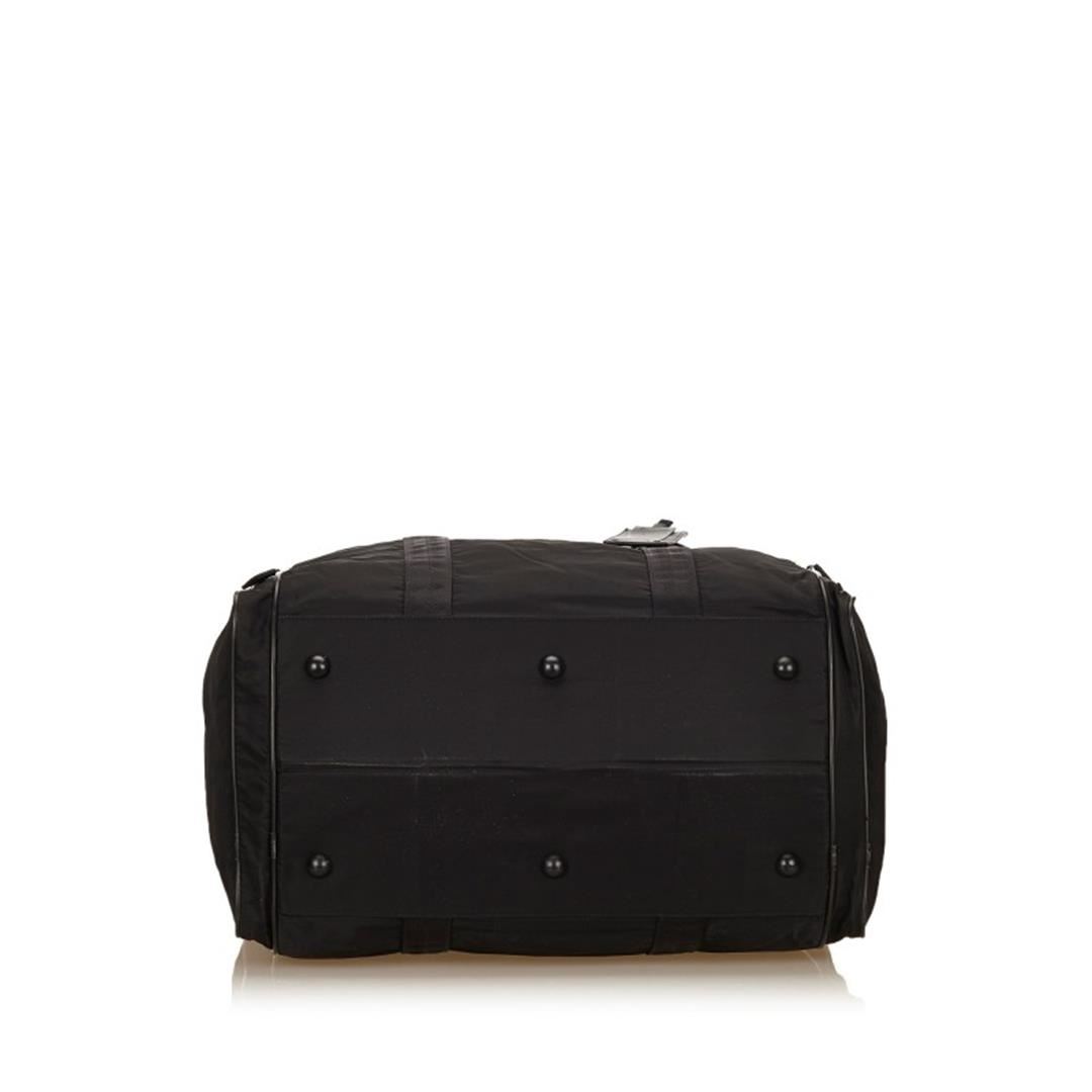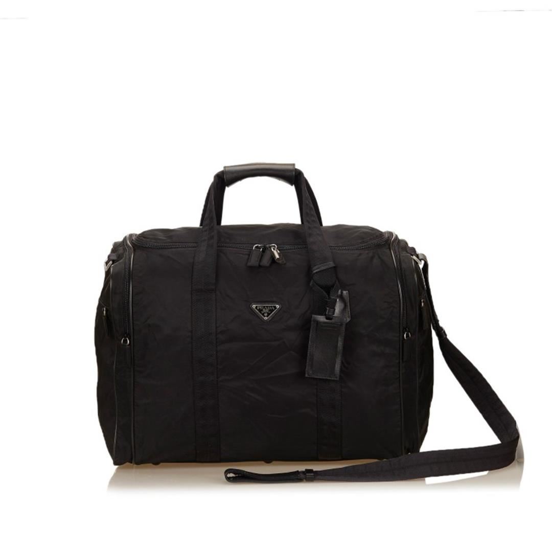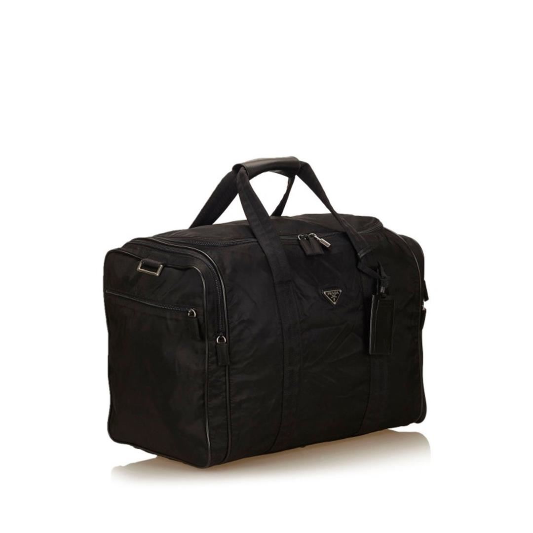 This duffel bag features a nylon body, side exterior zip pockets, flat handles, and top zip closure. Item is pre-owned.