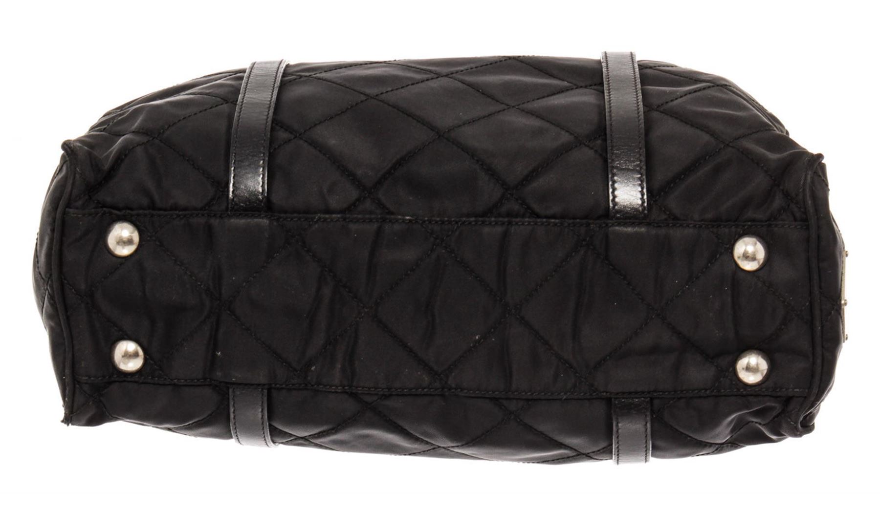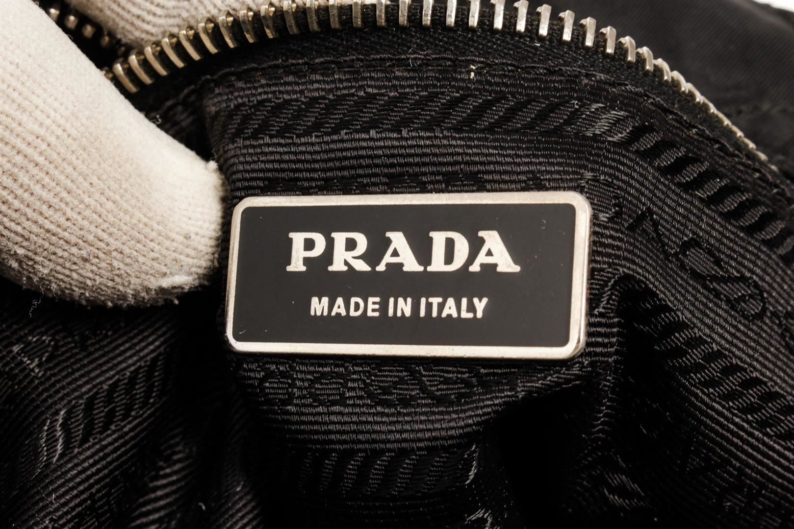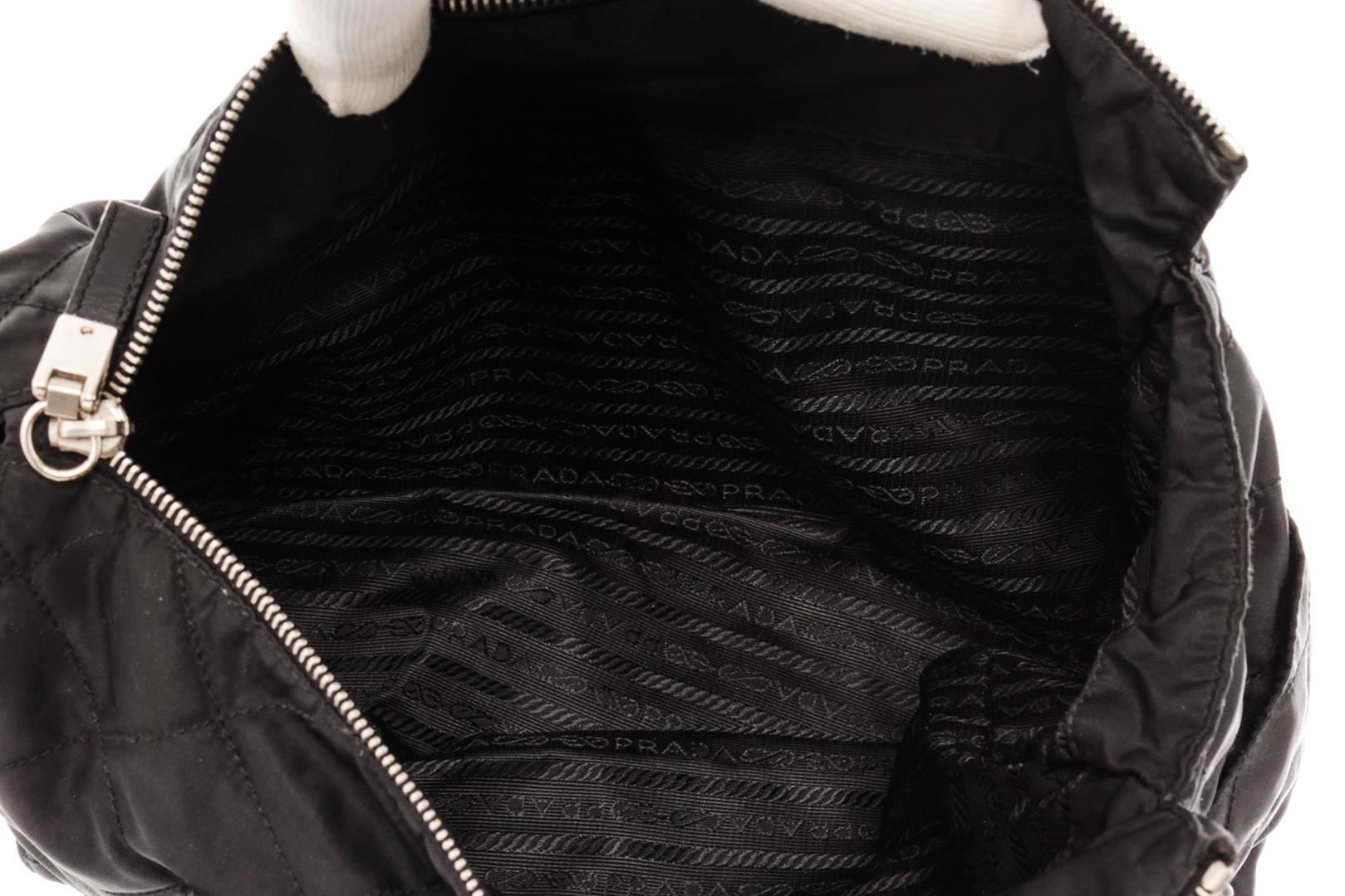 Prada Small Shoulder Bag features black quilter Tessuto nylon with silver-tone hardware, double shoulder straps with chain and leather details, two rear exterior open pockets, zipper closure and black signature Prada textile-lined interior.