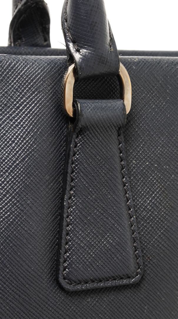 One Prada Black Saffiano 2 Way Tote Bag. Item is sold AS-IS. All available information is listed in the description and shown in the photo. Prada Black Saffiano 2 Way Tote Bag with top handle bag, clochette, fabric lining, interior pockets and silver hardware.