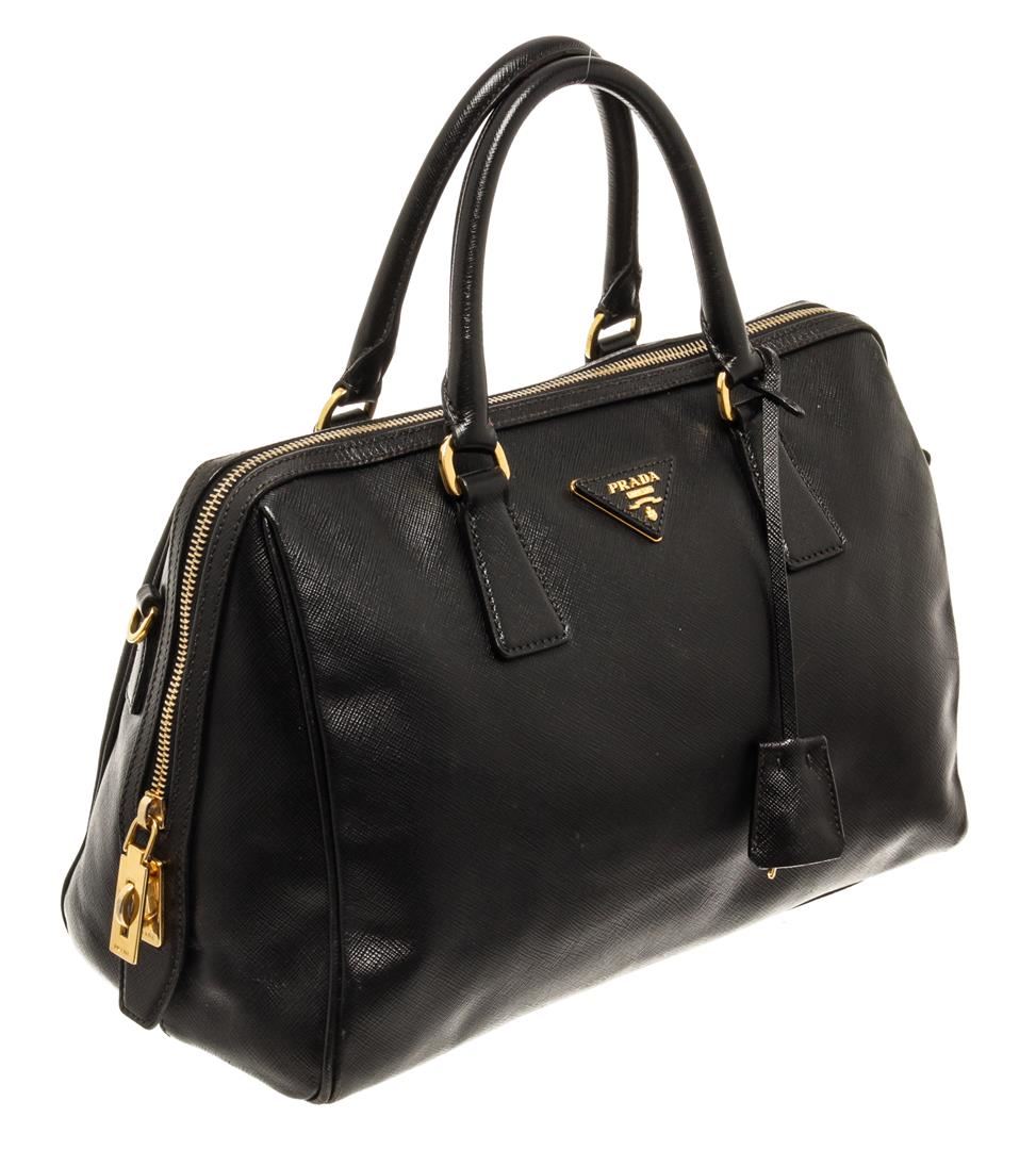 One Prada Black Saffiano Leather Top Handle Bag. Item is sold AS-IS. All available information is listed in the description and shown in the photo. Prada black Saffiano leather top handle bag with gold-tone hardware, zipper closure, and black fabric lining.