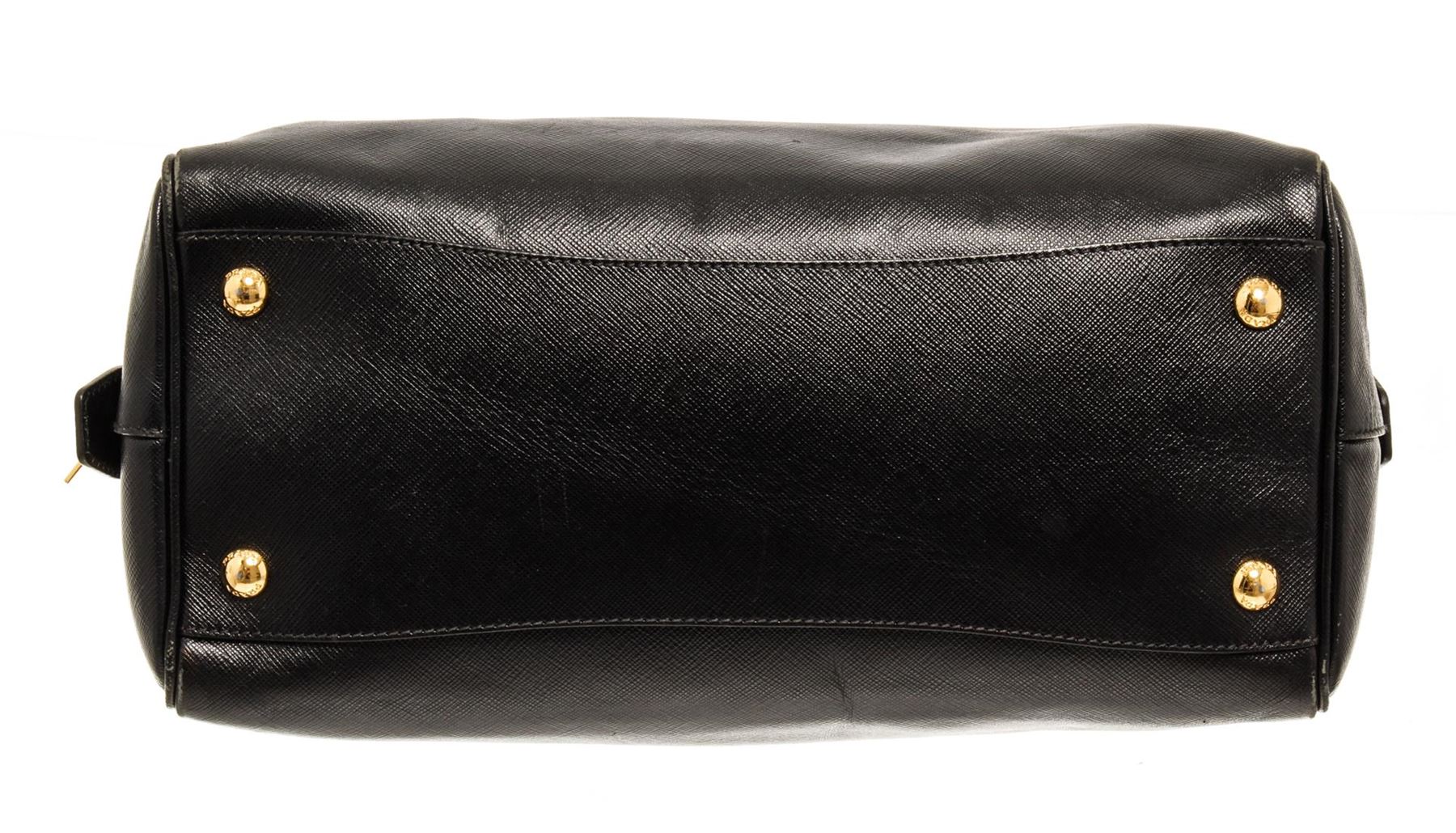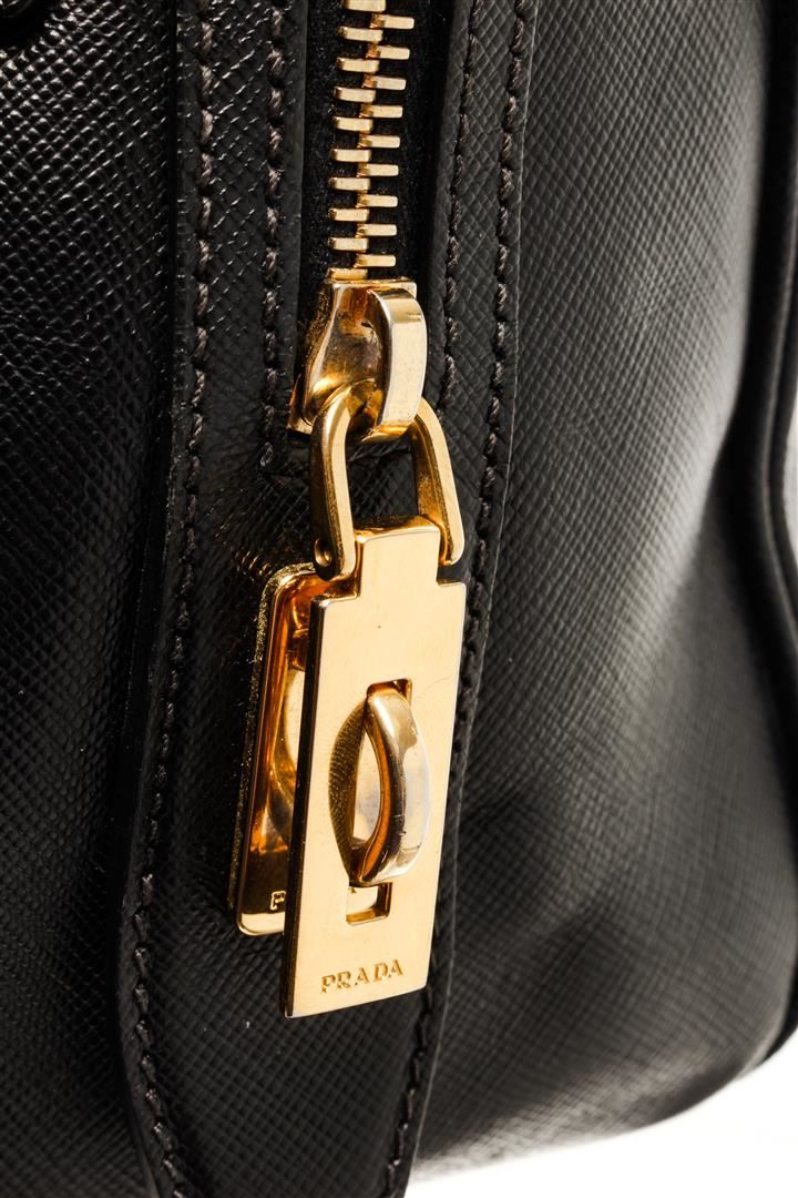 One Prada Black Saffiano Leather Top Handle Bag. Item is sold AS-IS. All available information is listed in the description and shown in the photo. Prada black Saffiano leather top handle bag with gold-tone hardware, zipper closure, and black fabric lining.