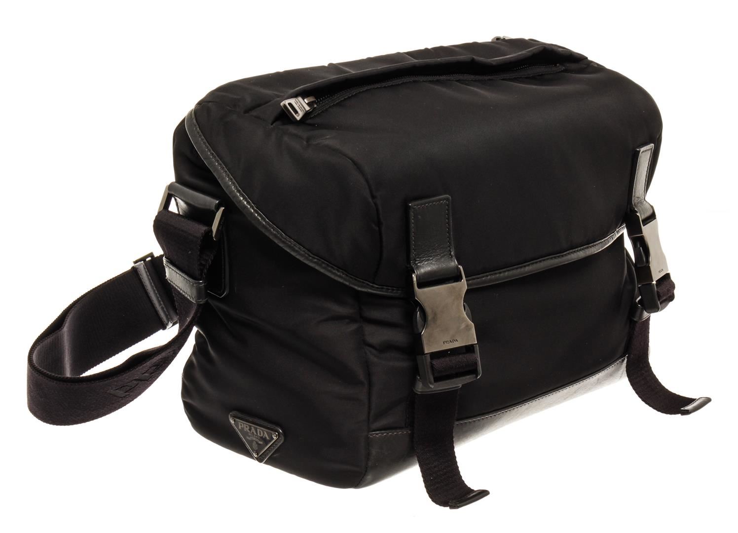 One Prada Black Tessuto Double Buckle Flap Bag. Item is sold AS-IS. All available information is listed in the description and shown in the photo. Prada Black Nylon Tessuto Double Buckle Flap Bag with silver tone hardware, black leather trim, black nylon lining, outer zipper pocket, one zipped pocket, and buckle closures.