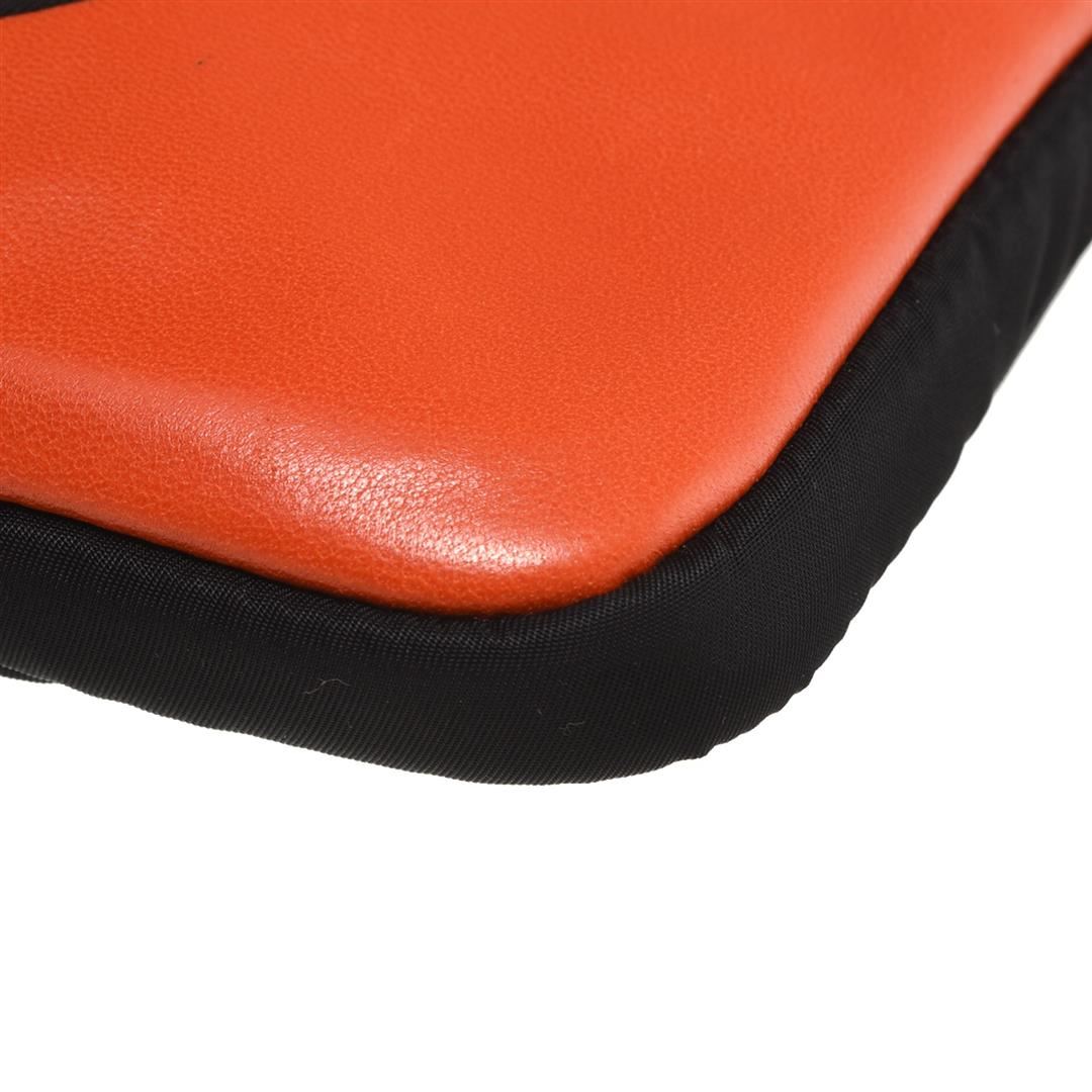 Black Tessuto nylon Prada Zip small pouch with silver-tone hardware, logo plaque at front, orang leather accent, front zip pocket, zip closure at top, orang nylon lining and one slip pocket inside. Width: 8.3 in Height: 11 in Length: 1 in