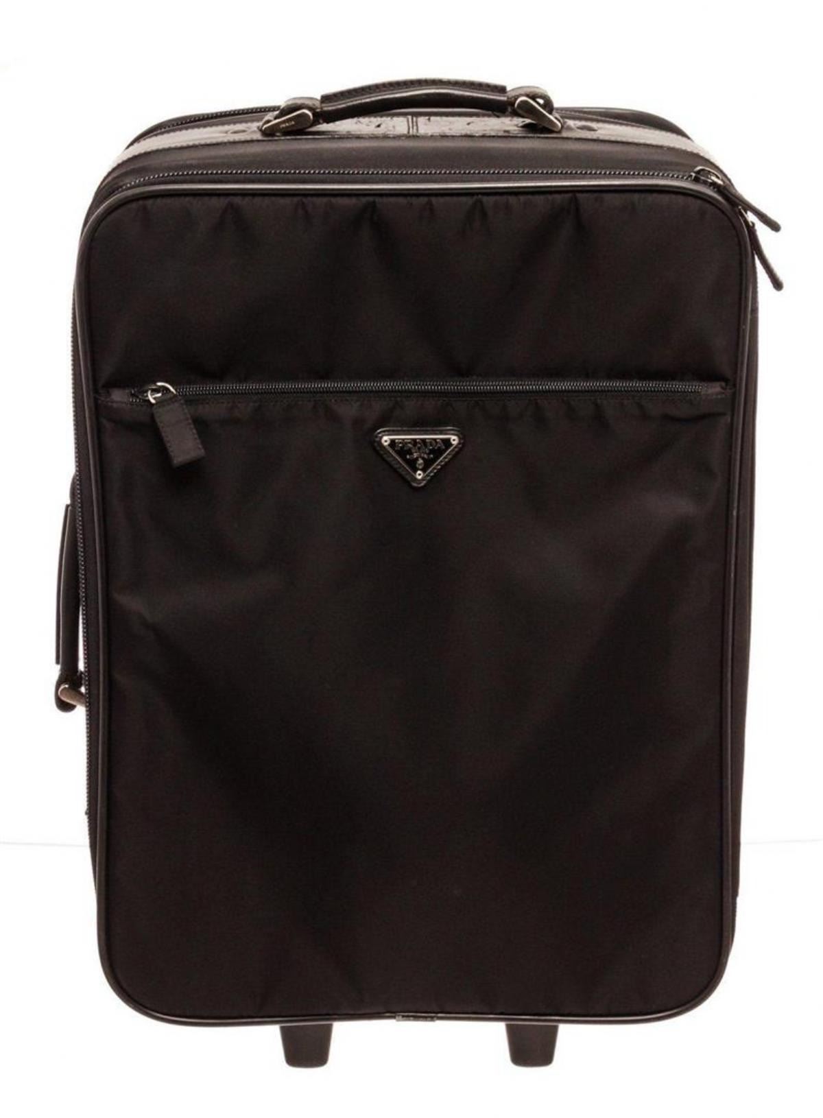Prada Black Tessuto Suit Case Travel Bag. Prada Black Tessuto Suit Case Travel Bag with gold-tone hardware, trim tan vachetta leather, leather lining, exterior zip pocket, top handle and zipper closure. MEASUREMENTS: Length 22 in / 56 cm Width 14 in /