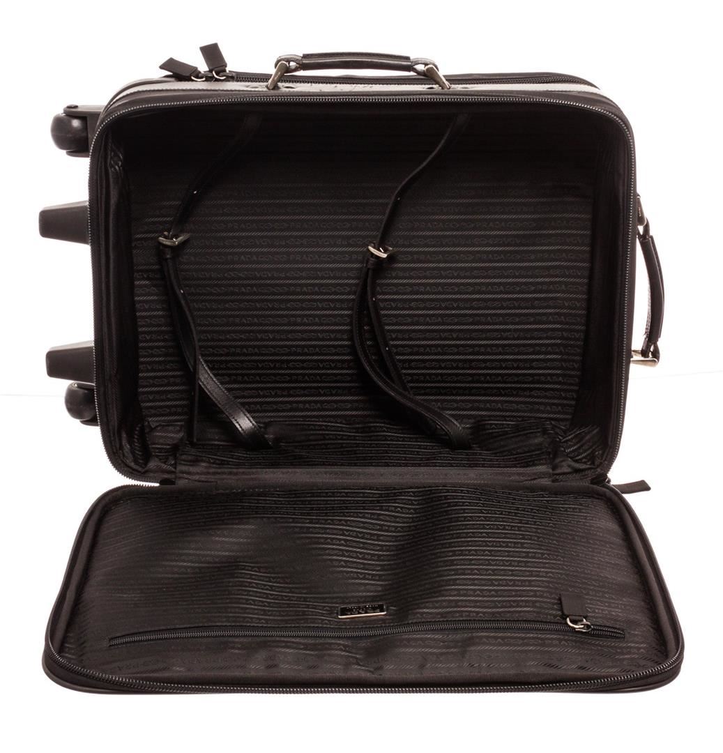Prada Black Tessuto Suit Case Travel Bag with gold-tone hardware, trim tan vachetta leather, leather lining, exterior zip pocket, top handle and zipper closure.