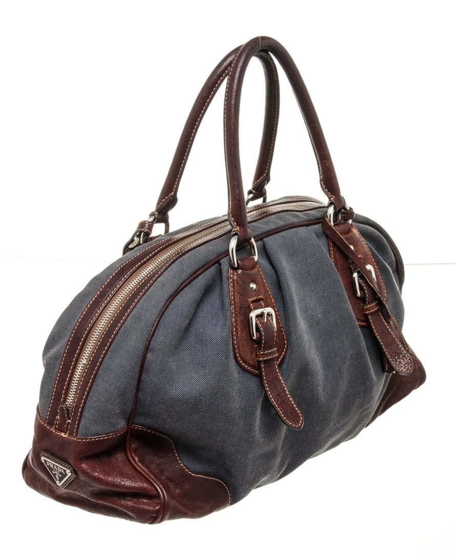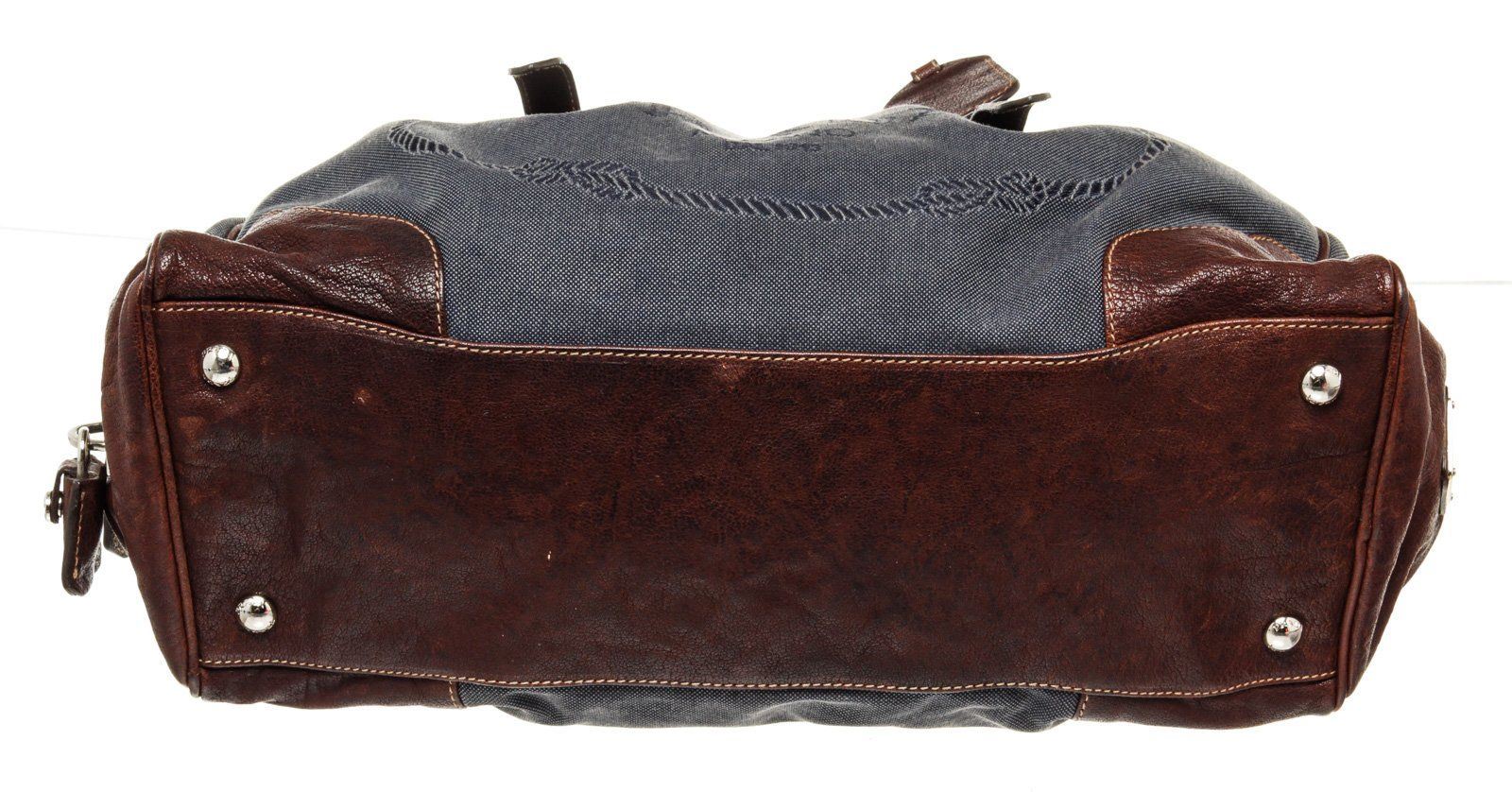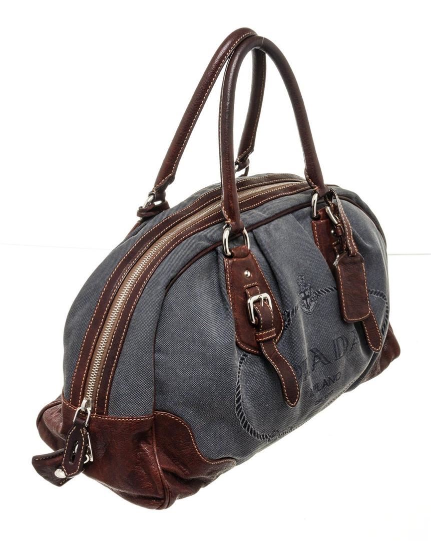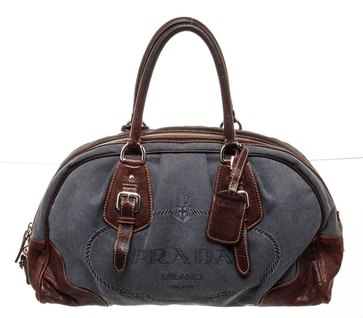 Prada Blue Denim Leather Bowler Shoulder Bag with patent bowler, gold-tone hardware, chain shoulder strap and zipper closure.