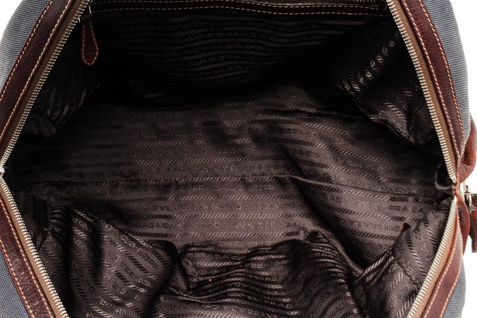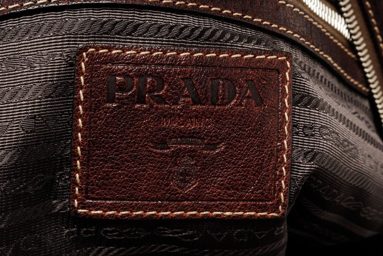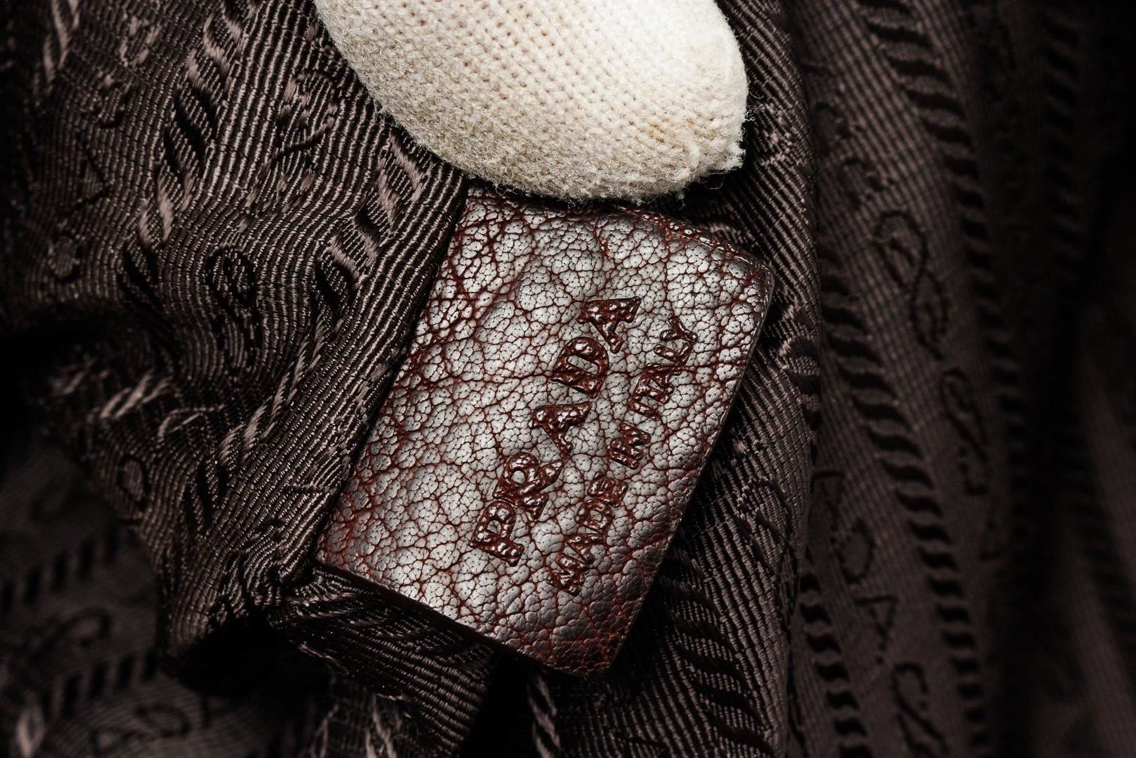 Prada Blue Denim Leather Bowler Shoulder Bag with patent bowler, gold-tone hardware, chain shoulder strap and zipper closure.