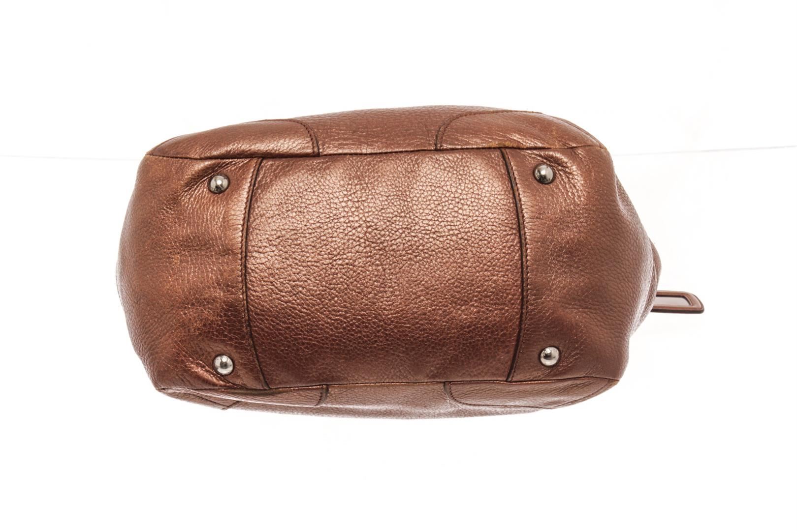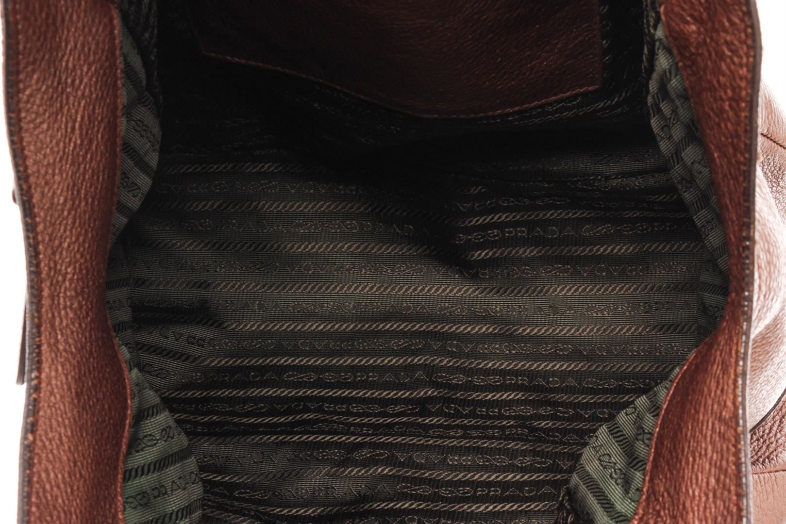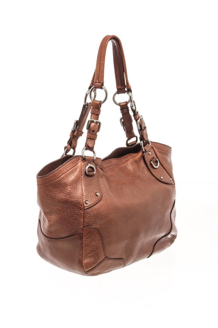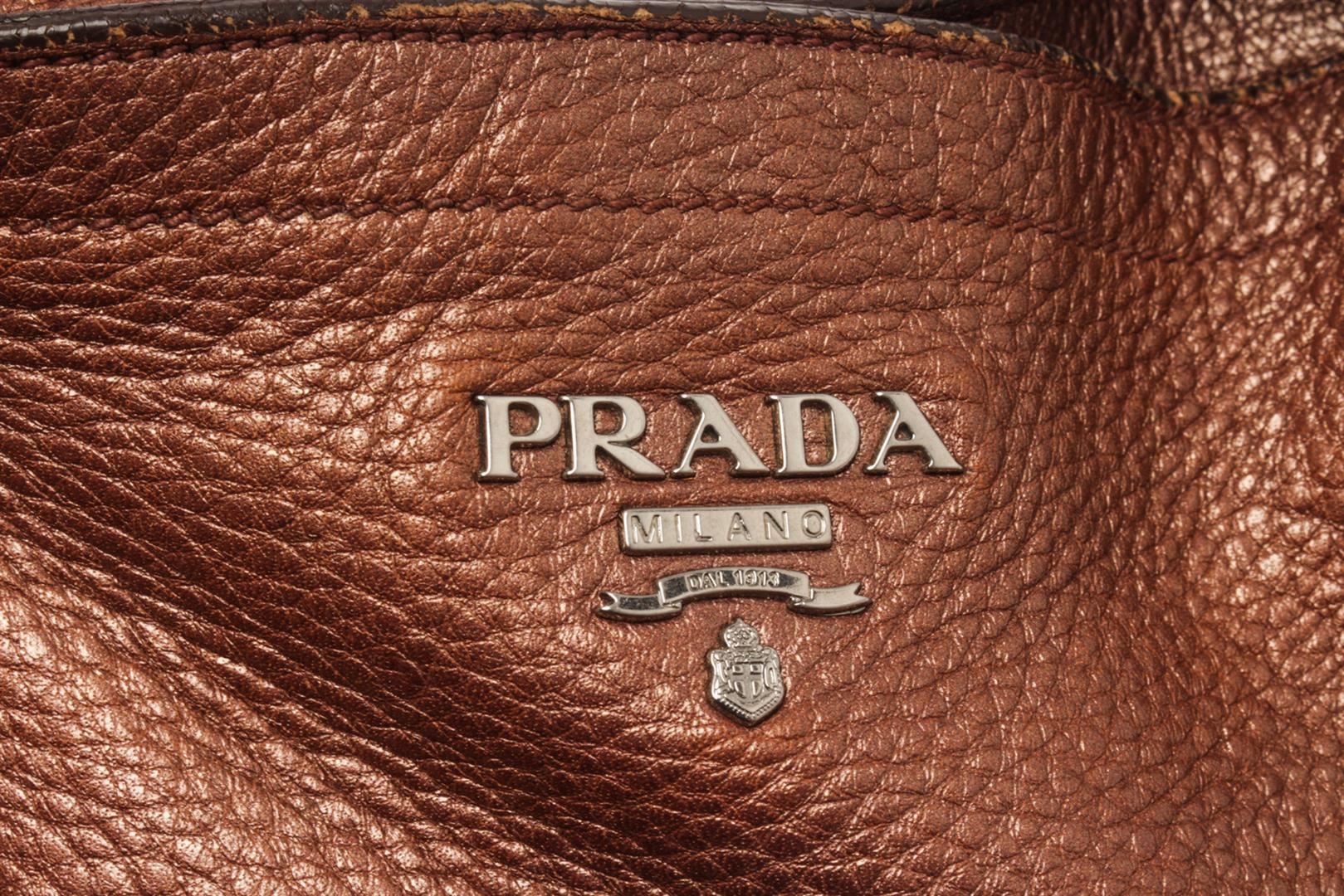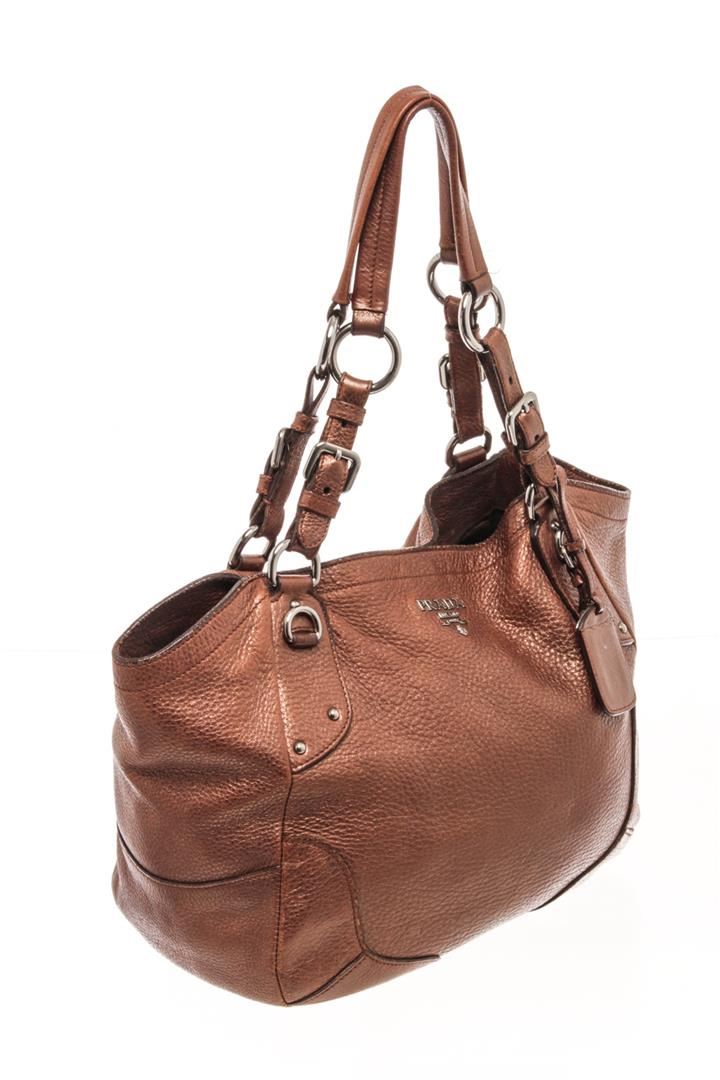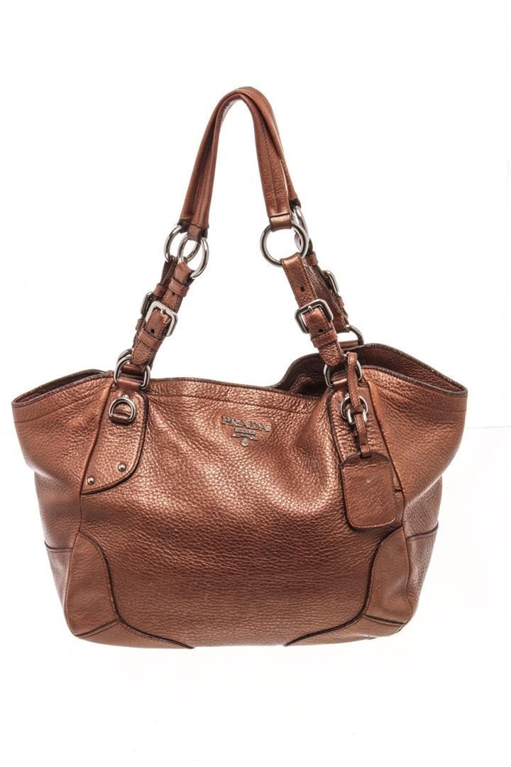 Prada Bronze Leather Buckle Strap Tote Bag. All available information is listed in the description and shown in the photos. prada bronze leather buckle strap tote bag features tall dual-flat leather straps with belt and buckle details, gunmetal studs, protective base studs, raised prada logo and gunmetal-tone hardware accents. its magnetic snap closure opens to a black fabric-lined interior with side zip and slip pockets storing daily essentials. Height: 10" Width: 12" Depth: 6", Handle Drop 9-10" / 25.4 x 30.48 x 15.24 Cm