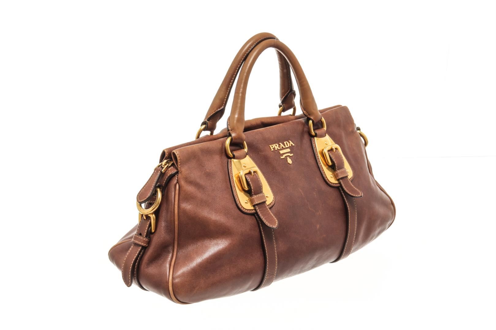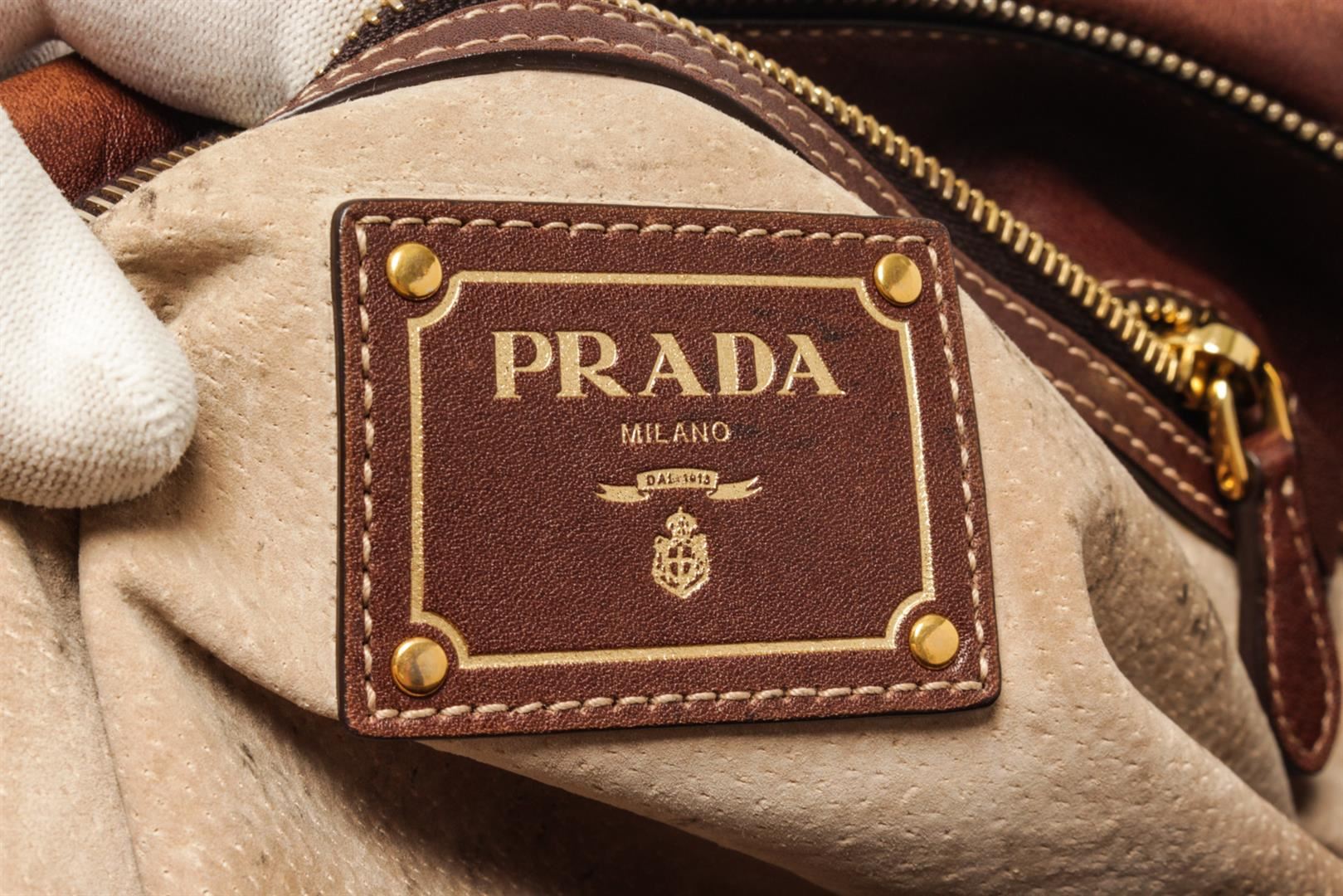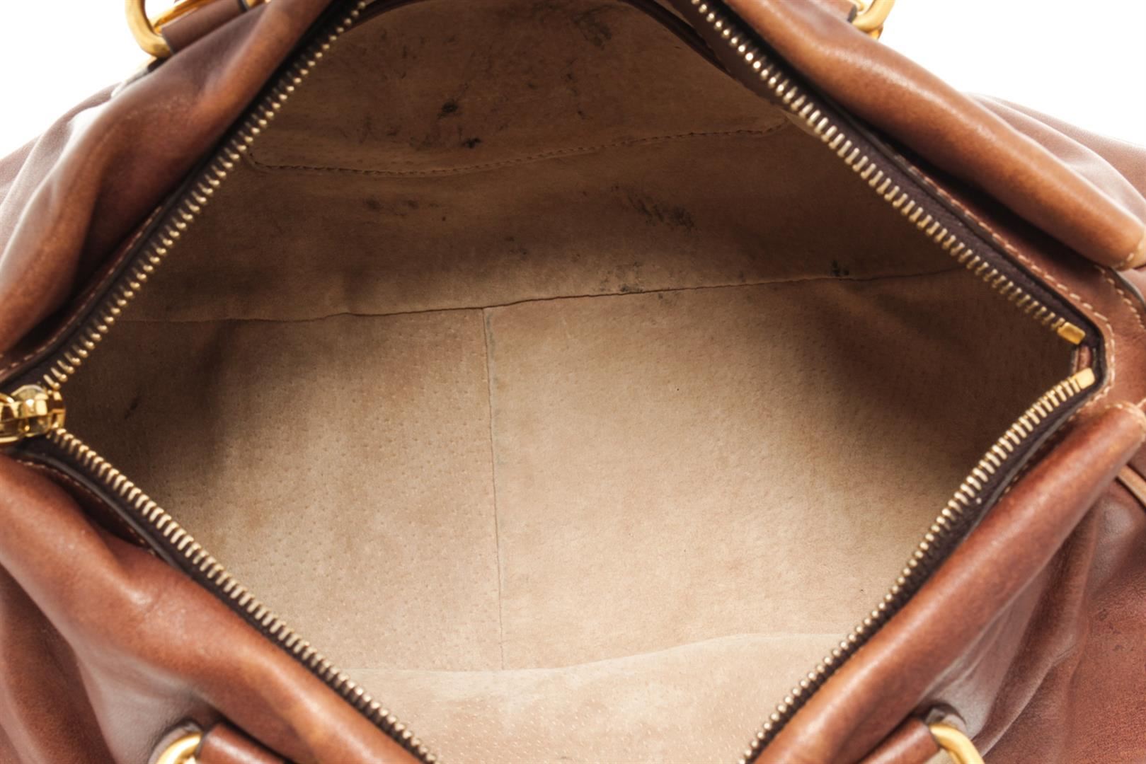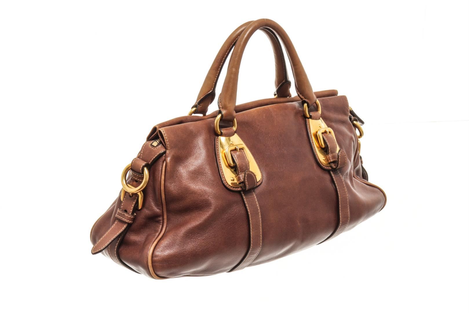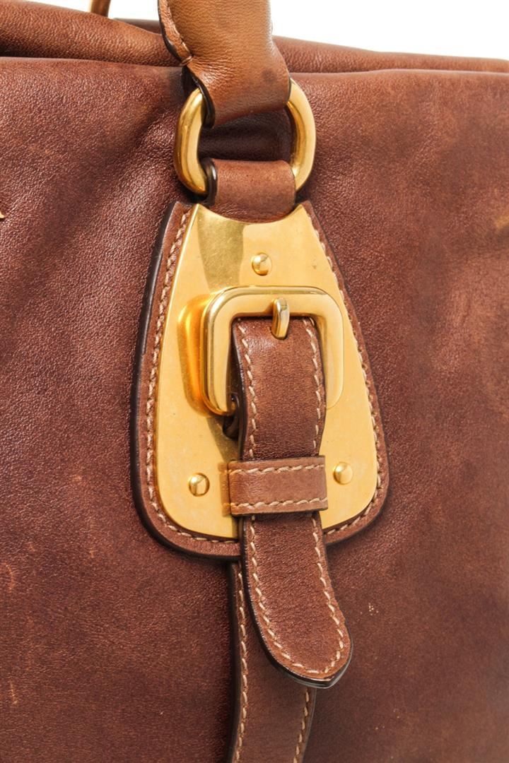 One Prada Brown Leather 2 Way Bag. Item is sold AS-IS. All available information is listed in the description and shown in the photo. Prada Brown Leather 2 Way Bag with top handle, suede lining, gold tone hardware, interior slip pockets, zip closure. There are pen markings on the suede lining. Please refer to photos.