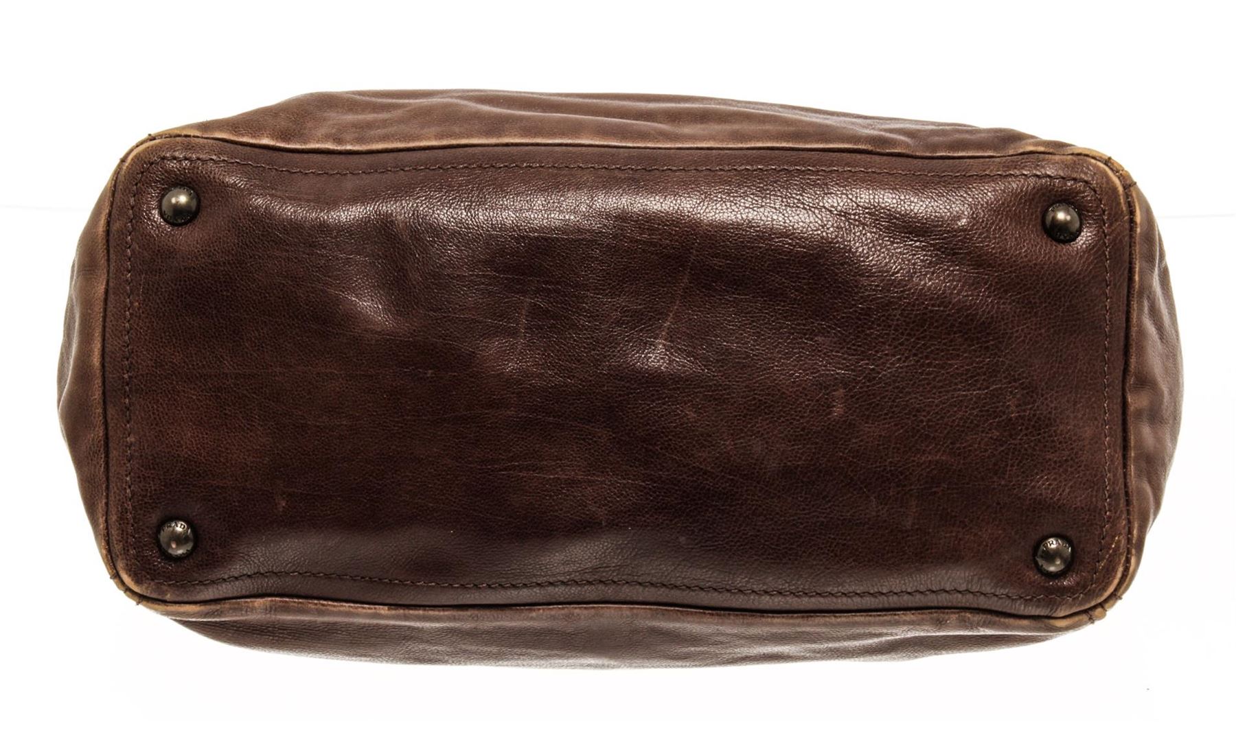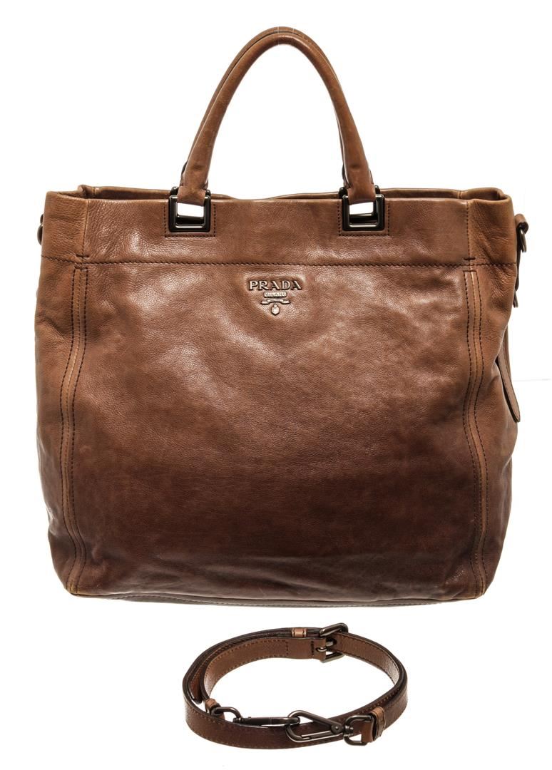 One Prada Brown Leather 2 Way Shoulder Bag. Item is sold AS-IS. All available information is listed in the description and shown in the photo. prada brown leather 2 way shoulder bag with leather body, rolled leather top handles, a detachable flat leather strap, an open top with magnetic button closure, and an interior zip and slip pockets.
