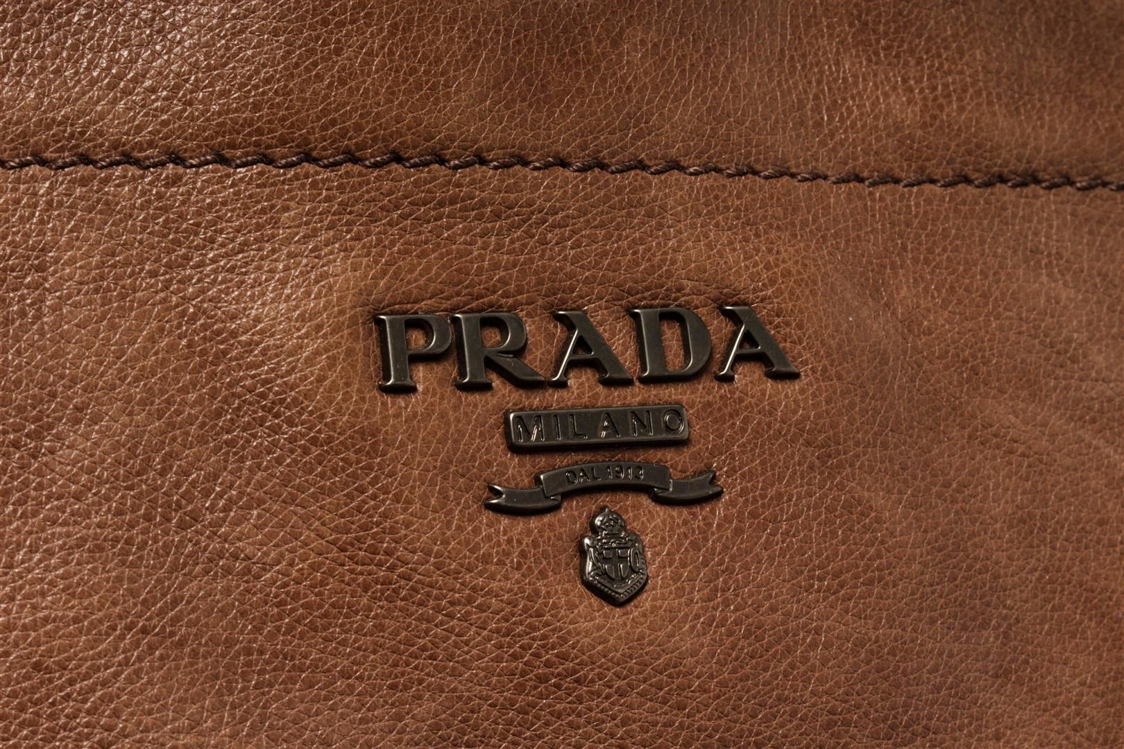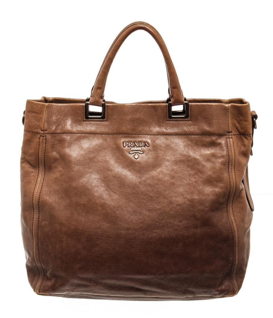 One Prada Brown Leather 2 Way Shoulder Bag. Item is sold AS-IS. All available information is listed in the description and shown in the photo. prada brown leather 2 way shoulder bag with leather body, rolled leather top handles, a detachable flat leather strap, an open top with magnetic button closure, and an interior zip and slip pockets.