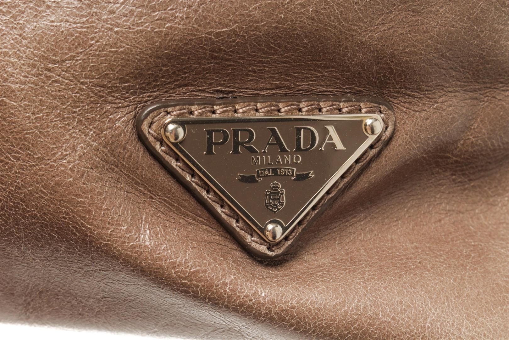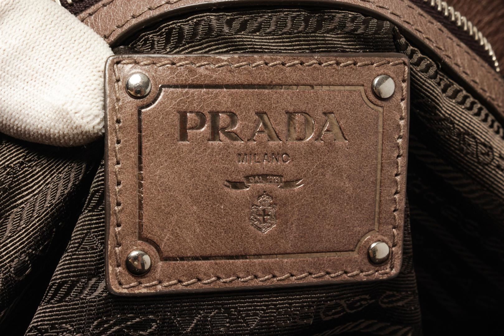 One Prada Brown Leather Vitello Shine Shoulder Bag. Item is sold AS-IS. All available information is listed in the description and shown in the photo. Prada Brown Leather Vitello Shine Shoulder Bag with top handle, detachable shoulder strap, Prada fabric lining, interior pocket, silver hardware, snap closure. There are some creases on the leather and corners are worn. Please refer to photos.