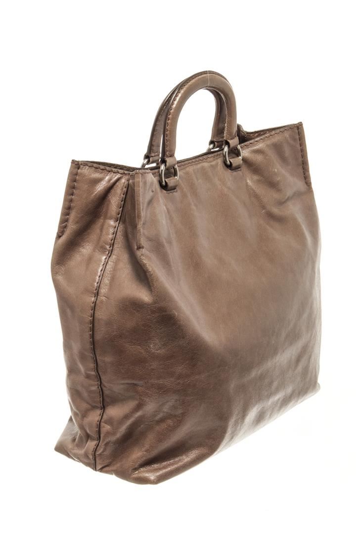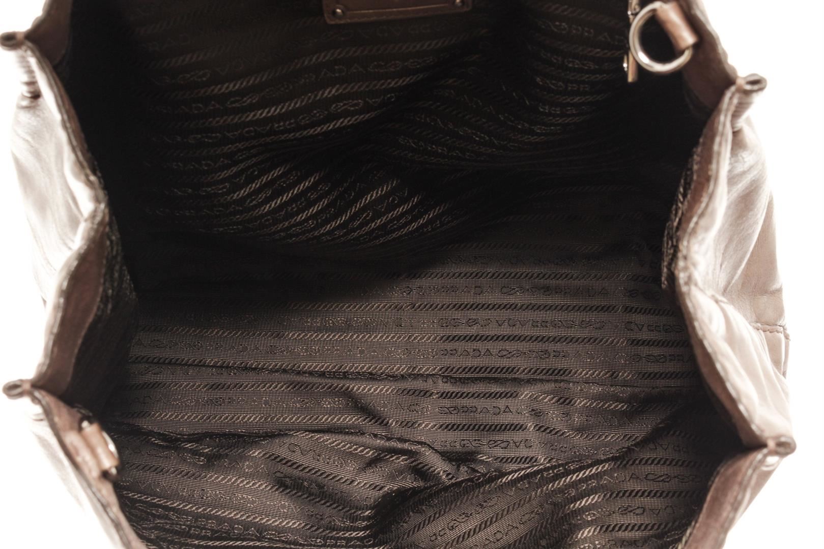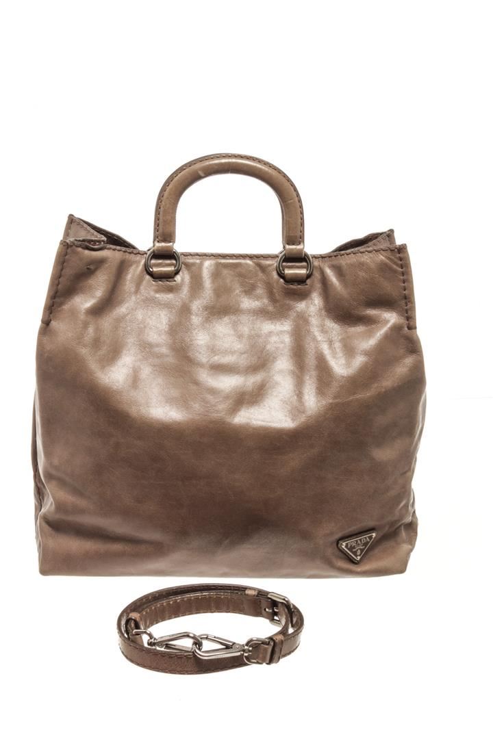 One Prada Brown Leather Vitello Shine Shoulder Bag. Item is sold AS-IS. All available information is listed in the description and shown in the photo. Prada Brown Leather Vitello Shine Shoulder Bag with top handle, detachable shoulder strap, Prada fabric lining, interior pocket, silver hardware, snap closure. There are some creases on the leather and corners are worn. Please refer to photos.
