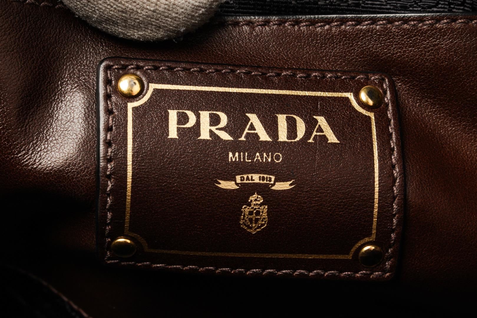 Prada Brown Nero Glace Calf Leather Double Tote Bag. All available information is listed in the description and shown in the photos. Prada Brown Nero Glace Calf Leather Double Tote Bag with gold-tone hardware, logo jacquard lining, snap closure at top. Height: 9.5", Width: 12", Depth: 7.5" / 24.13 x 30.48 x 19.05 CM