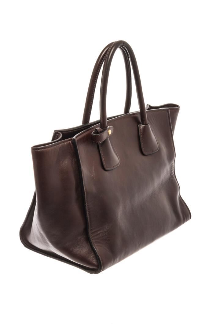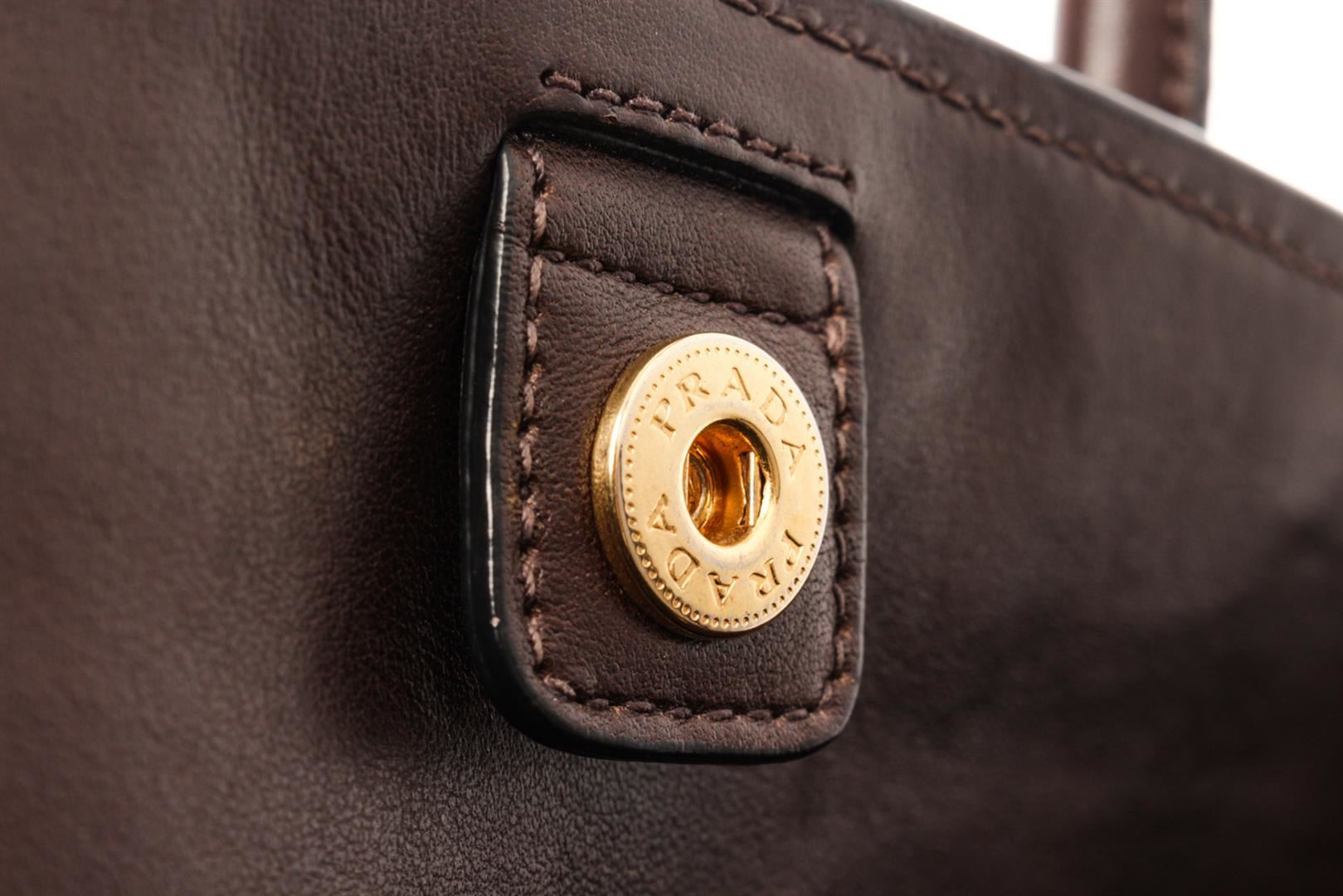 Prada Brown Nero Glace Calf Leather Double Tote Bag. All available information is listed in the description and shown in the photos. Prada Brown Nero Glace Calf Leather Double Tote Bag with gold-tone hardware, logo jacquard lining, snap closure at top. Height: 9.5", Width: 12", Depth: 7.5" / 24.13 x 30.48 x 19.05 CM