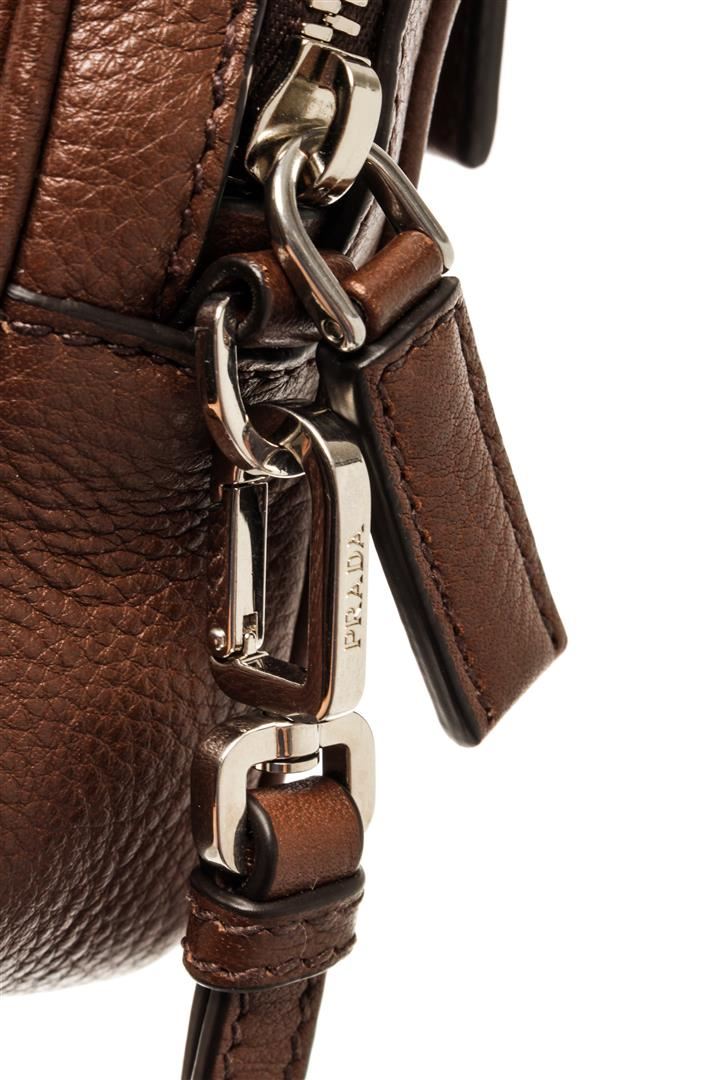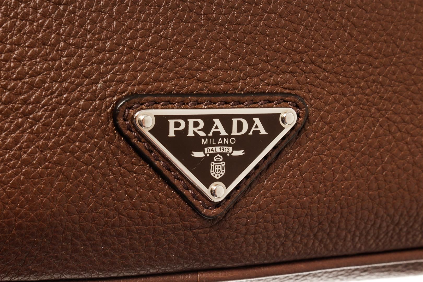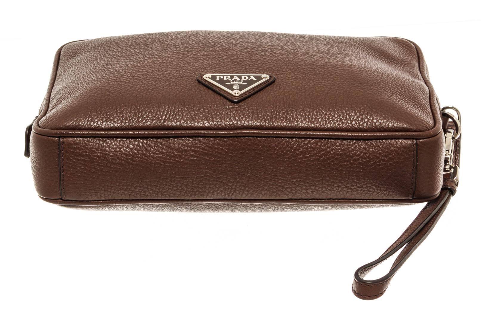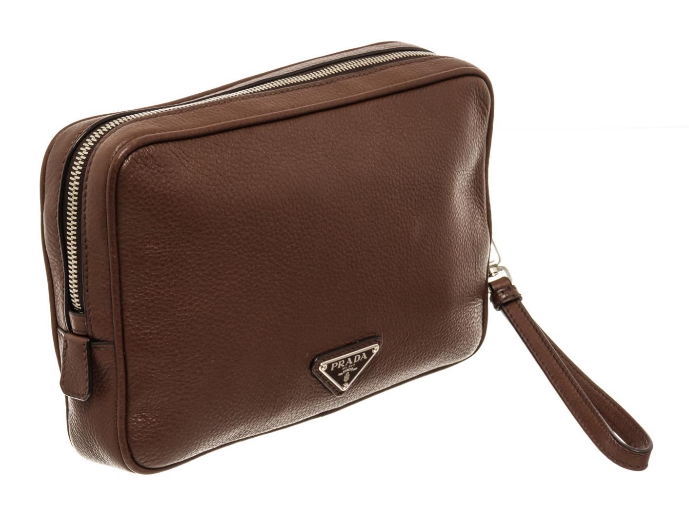 One Prada Brown Vitello City Leather Wristlet Zip Pouch. Item is sold AS-IS. All available information is listed in the description and shown in the photo. Prada Brown Vitello City Leather Wristlet Zip Pouch features silver-tone hardware, black canvas lining, single exterior and interior zip pocket, interior brown leather card holders, and zip closure.