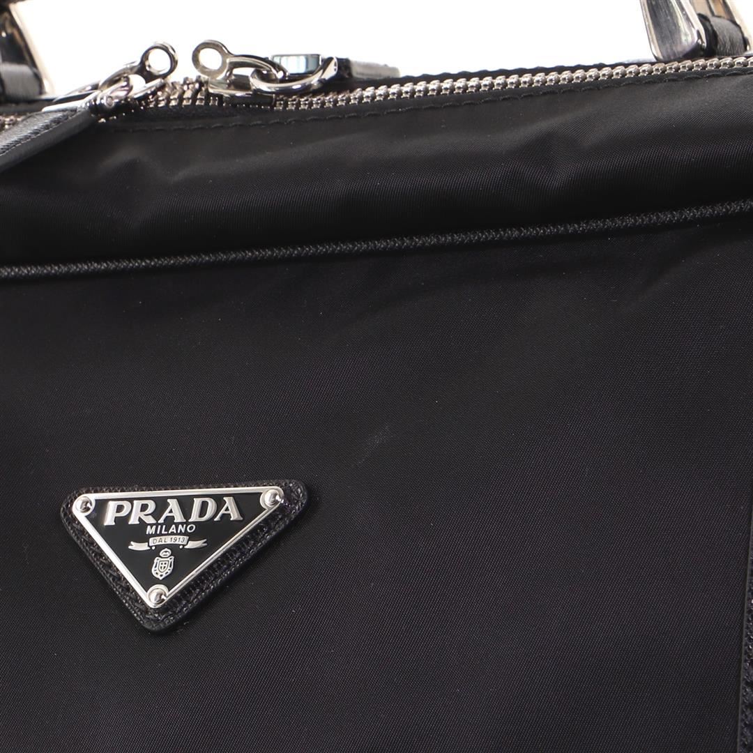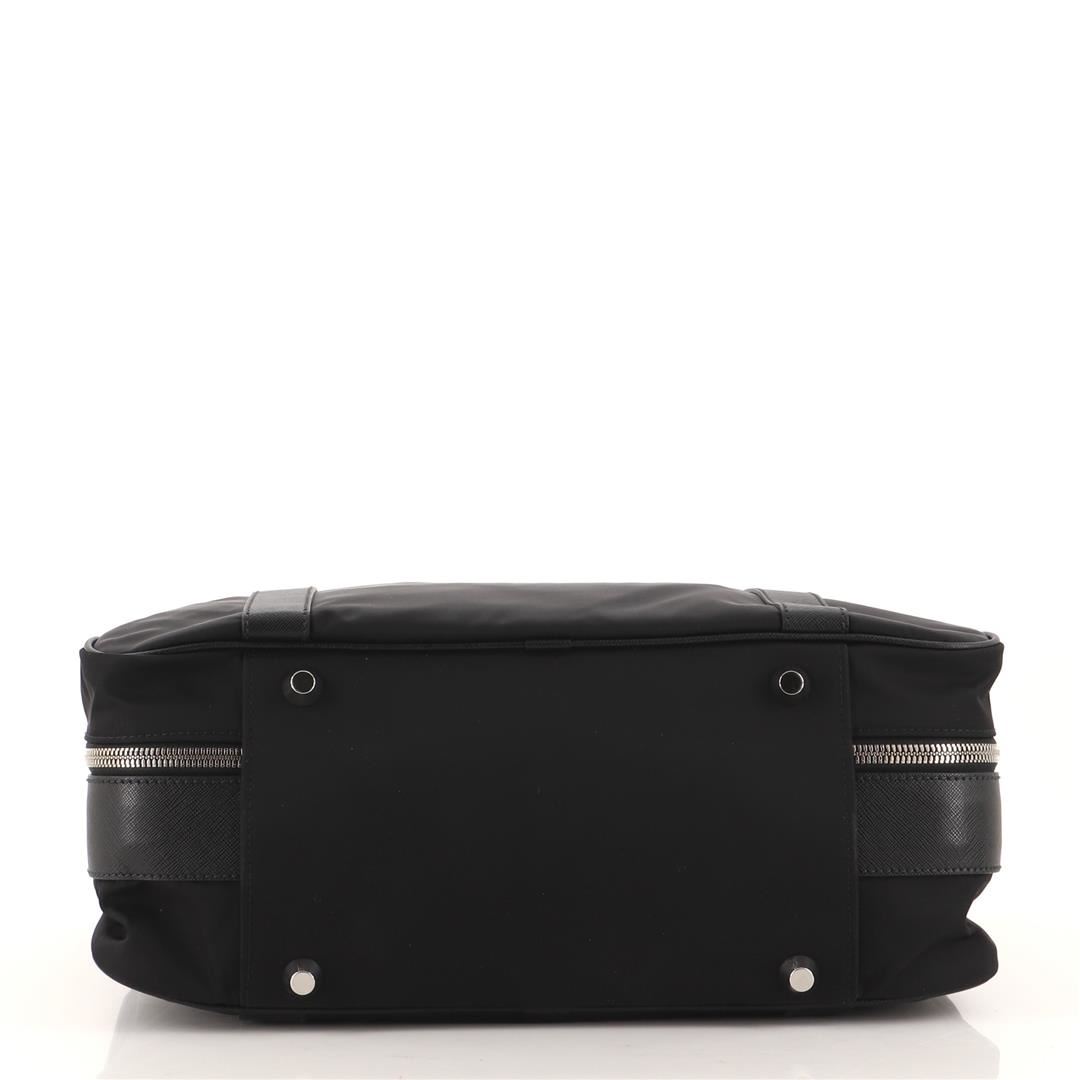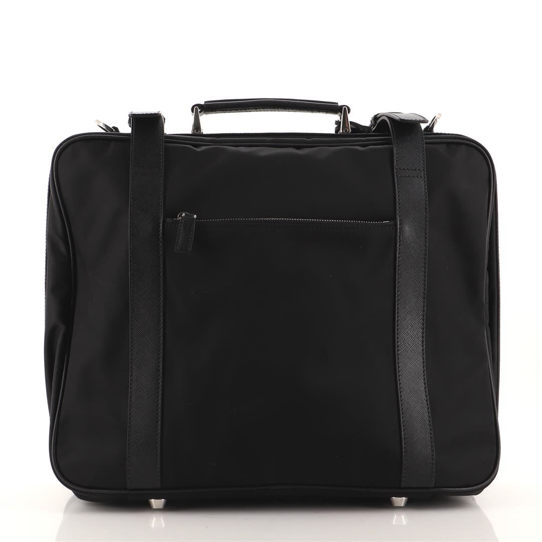 One Prada Convertible Buckle Suitcase Tessuto and Saffiano Leather. Item is sold AS-IS. All available information is listed in the description and shown in the photo. Prada Convertible Buckle Suitcase Tessuto and Saffiano Leather. Creasing, minor wear and marks on exterior, scratches and tarnish on hardware.