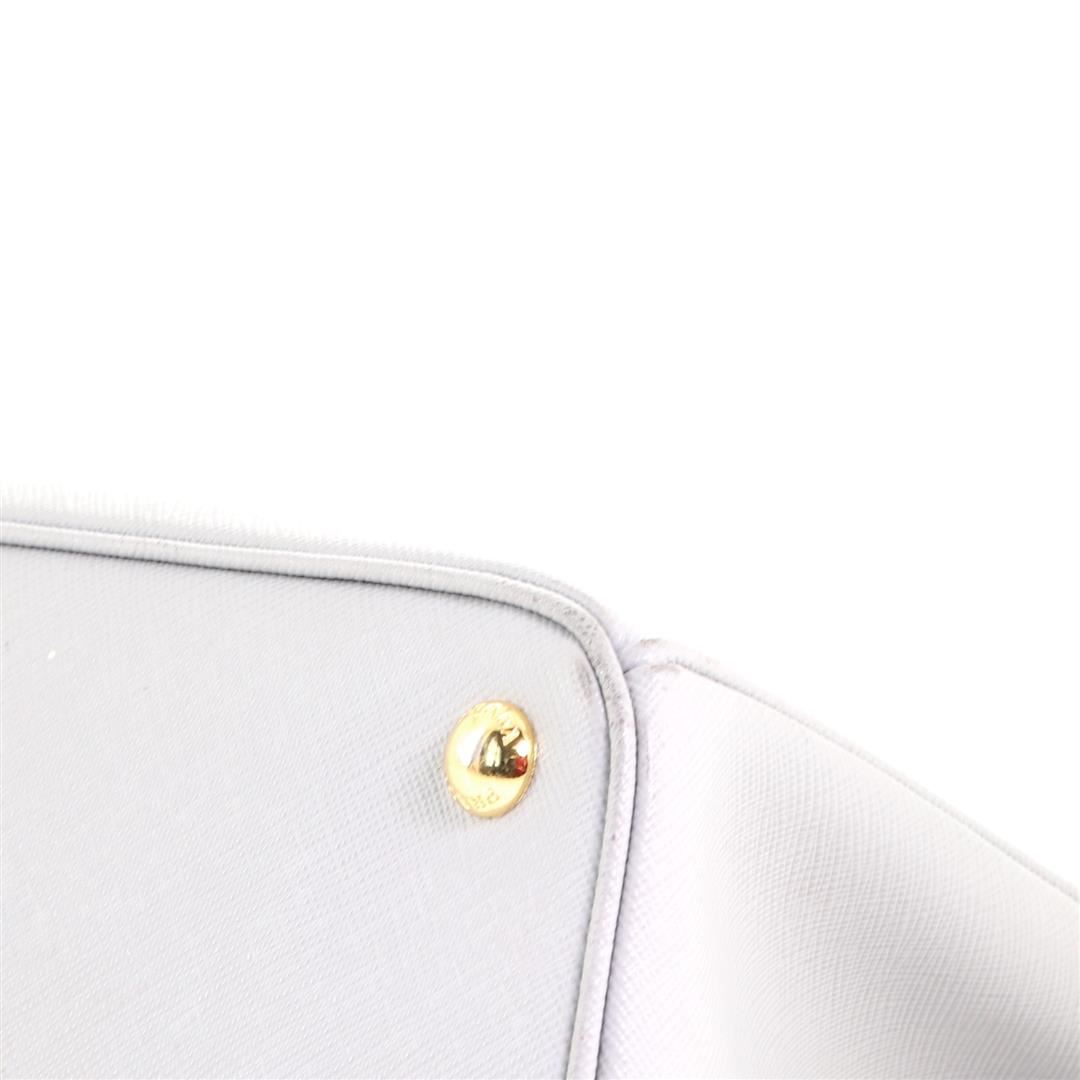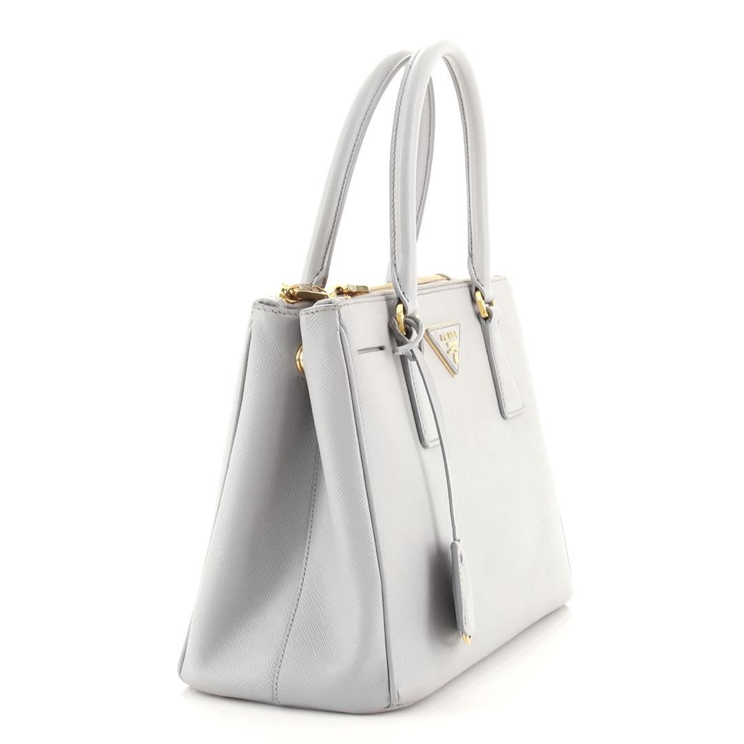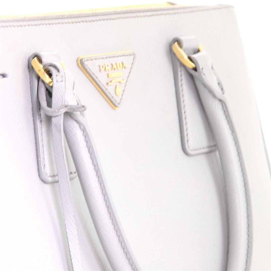 Prada Galleria Double Zip Tote Saffiano Leather Medium. Heavy wear and darkening on base corners, heavy cracking, splitting and peeling on opening wax edges. Glue stains on strap, splitting on strap base wax edge, scratches on hardware.