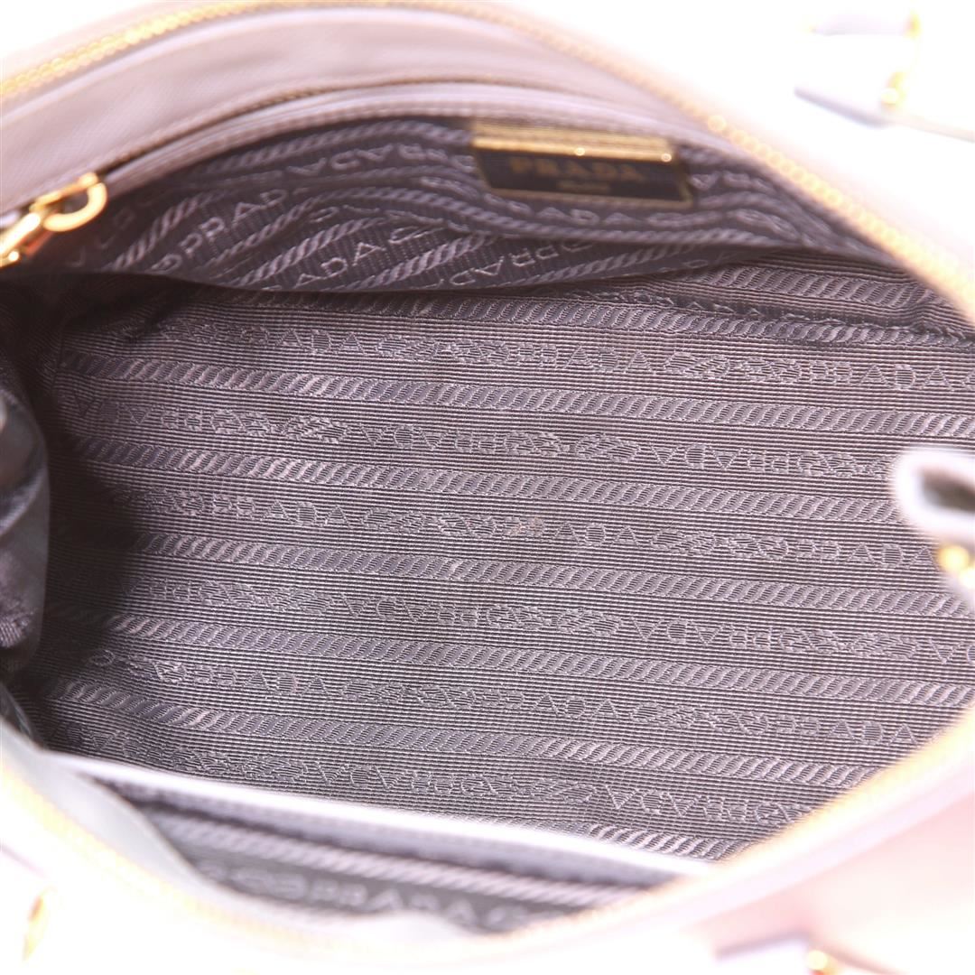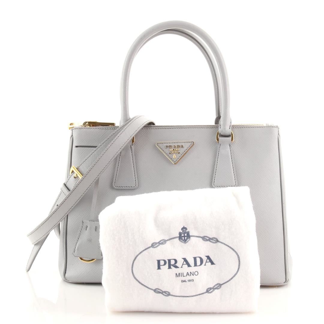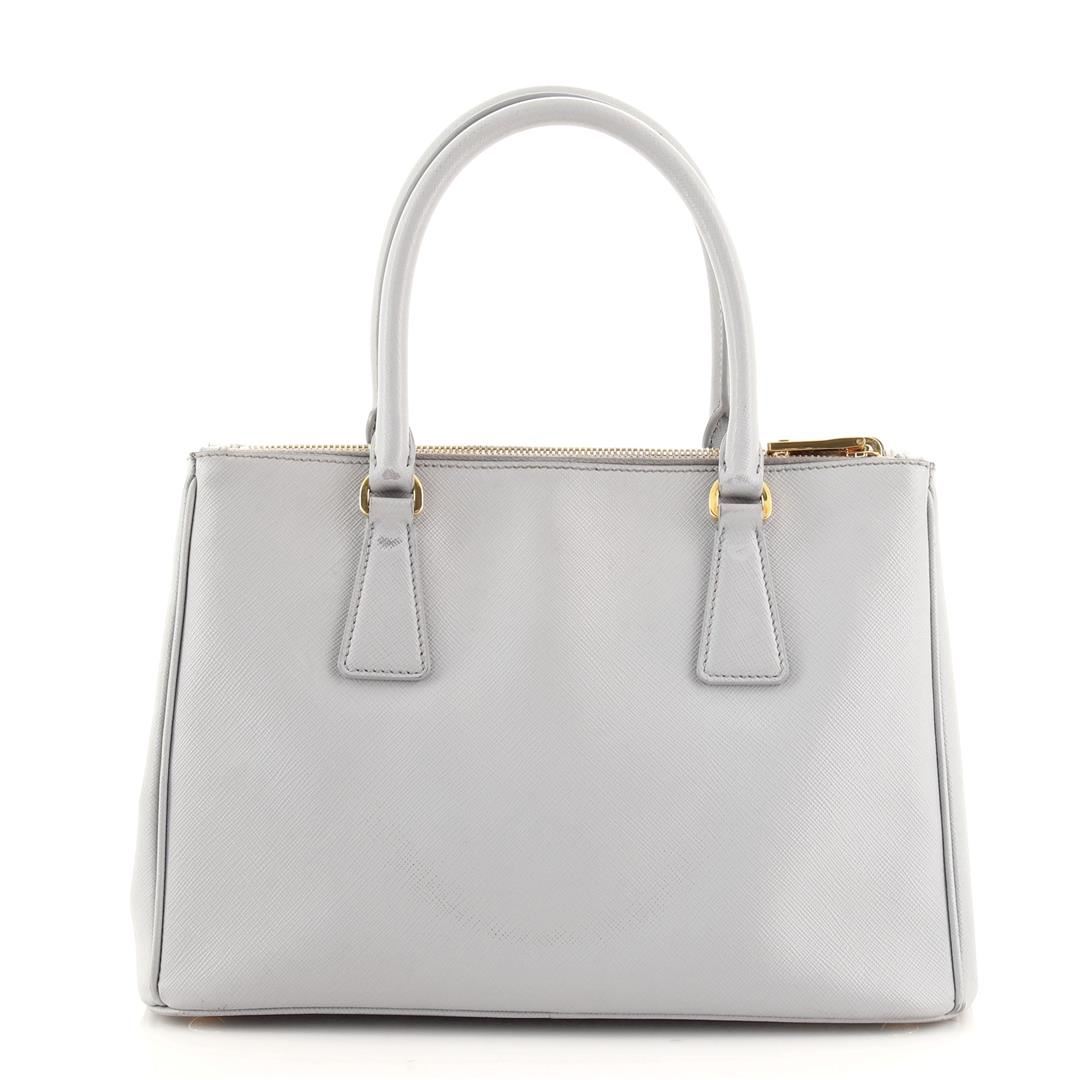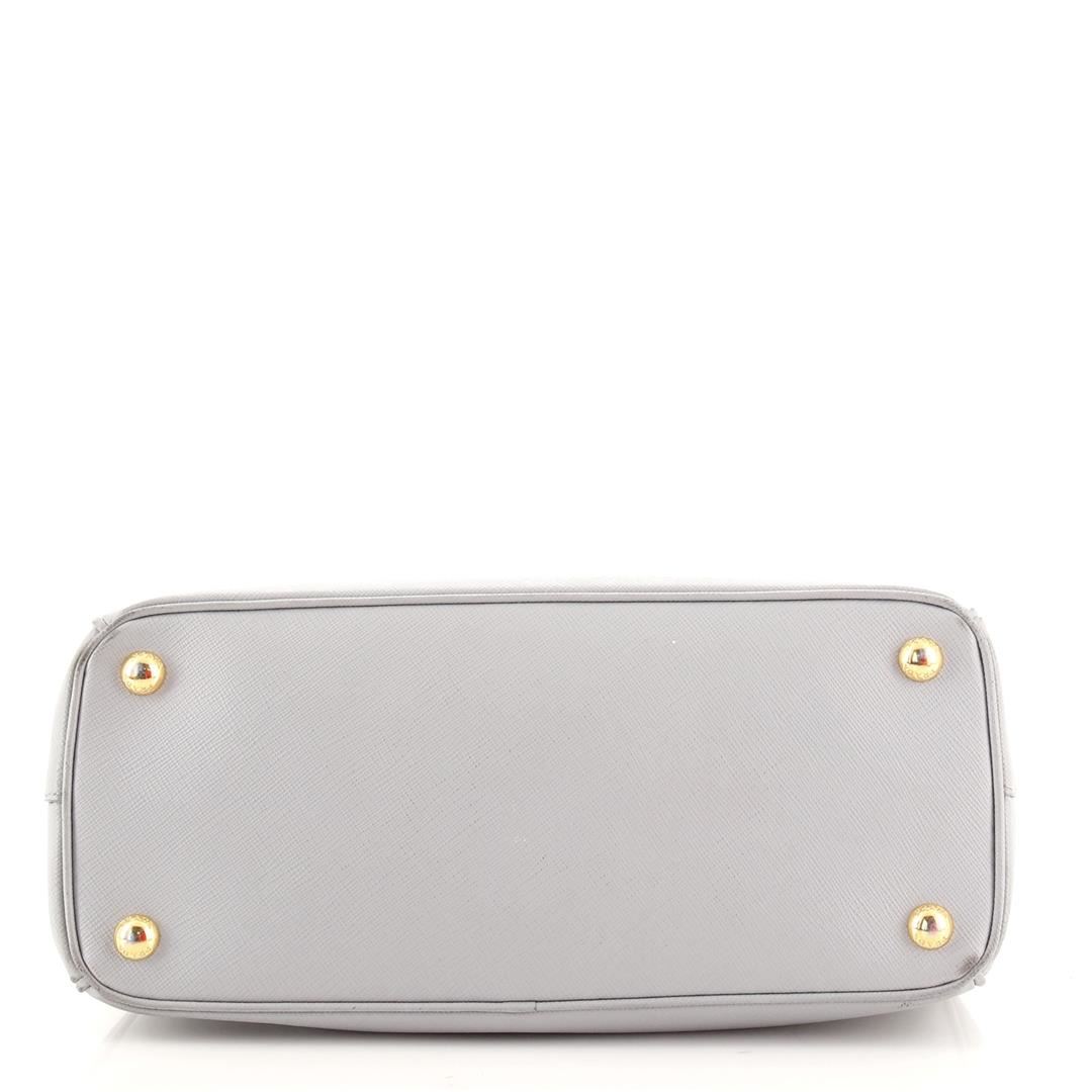 Prada Galleria Double Zip Tote Saffiano Leather Medium. Heavy wear and darkening on base corners, heavy cracking, splitting and peeling on opening wax edges. Glue stains on strap, splitting on strap base wax edge, scratches on hardware.