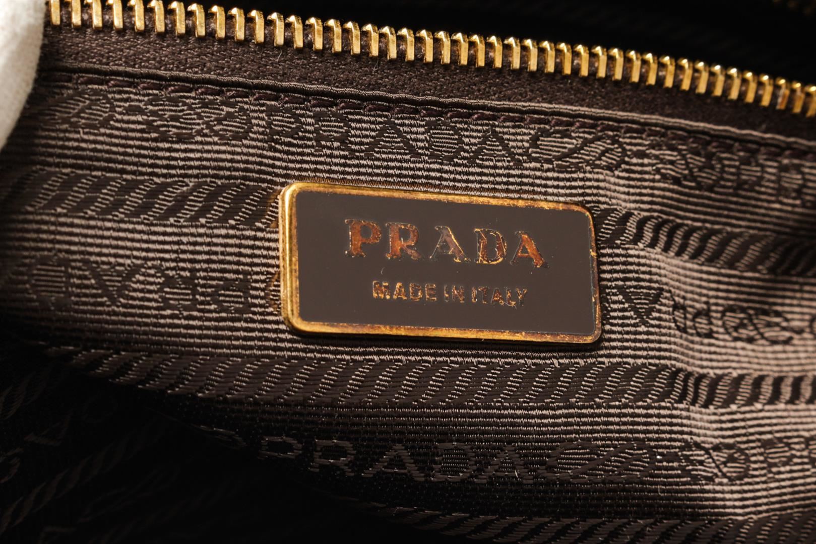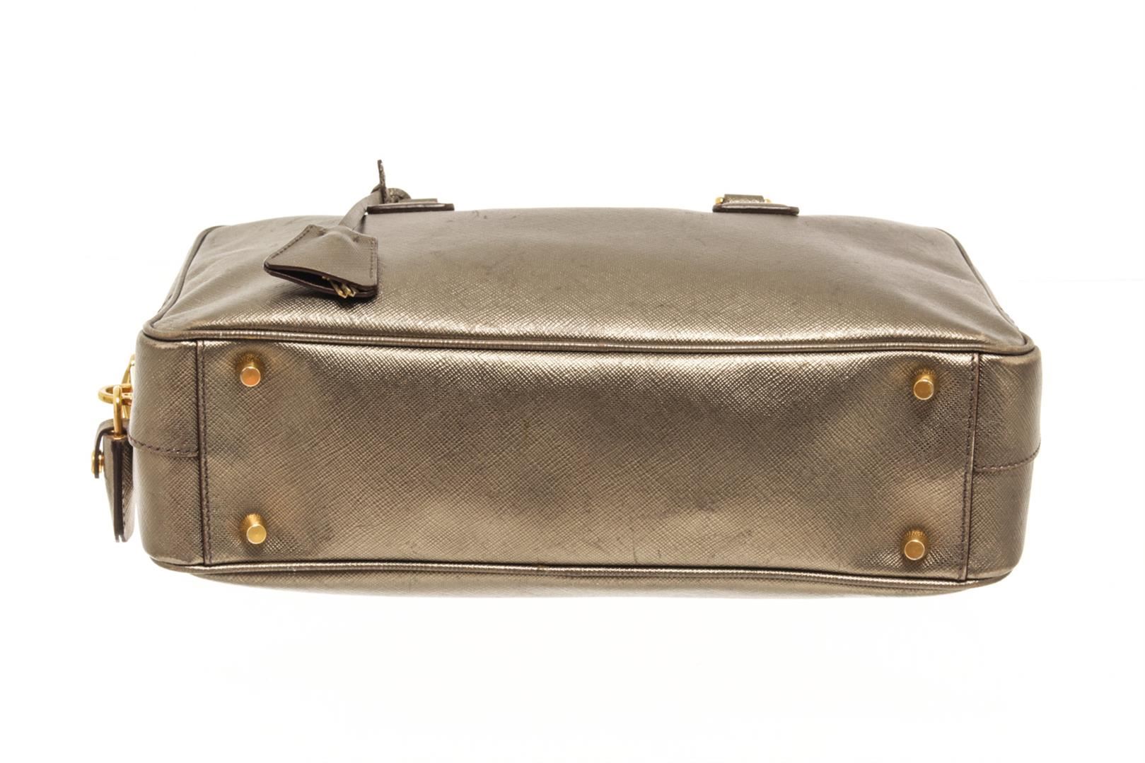 One Prada Gold Saffiano Lux Leather Bauletto Satchel Bag. Item is sold AS-IS. All available information is listed in the description and shown in the photo. Prada Gold Saffiano Lux Leather Bauletto Satchel Bag with the beautiful bag features splendid details in the form of the gleaming golden hue, dual top handles, a dangling leather clochette, and protective metal feet in gold-tone. the top zip closure opens to a nylon-lined interior. There is a stain on the back of the bag, some white marks and scratches. Please refer to photos. Height: 6.29" Width: 3.54" Depth: 10.03", Handle Drop: 3.54" / 16 x 9 x 25.5 Cm