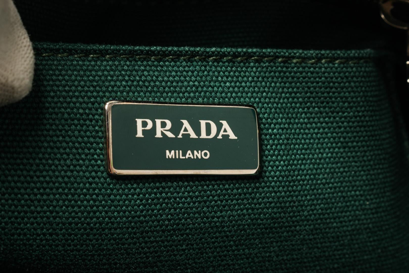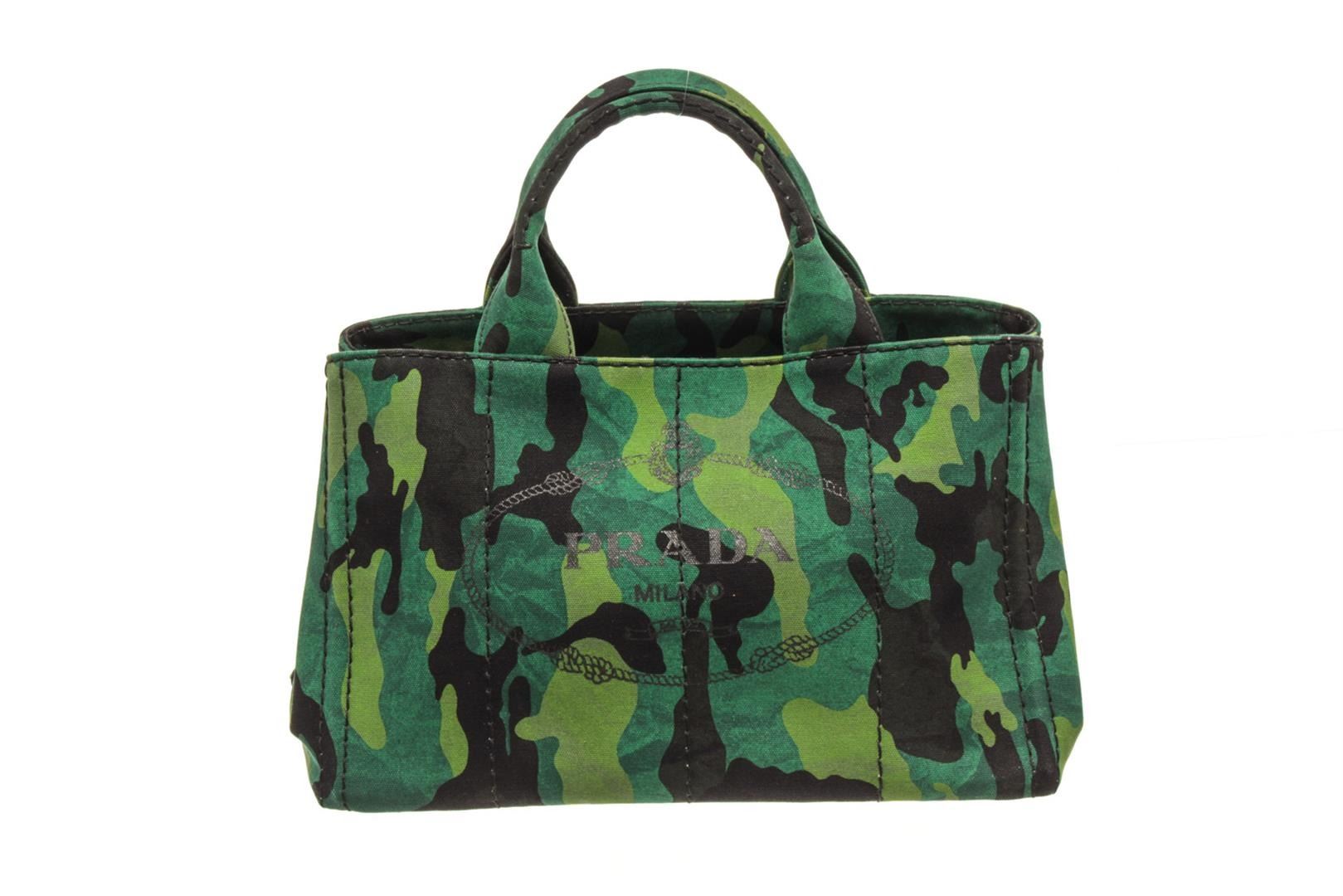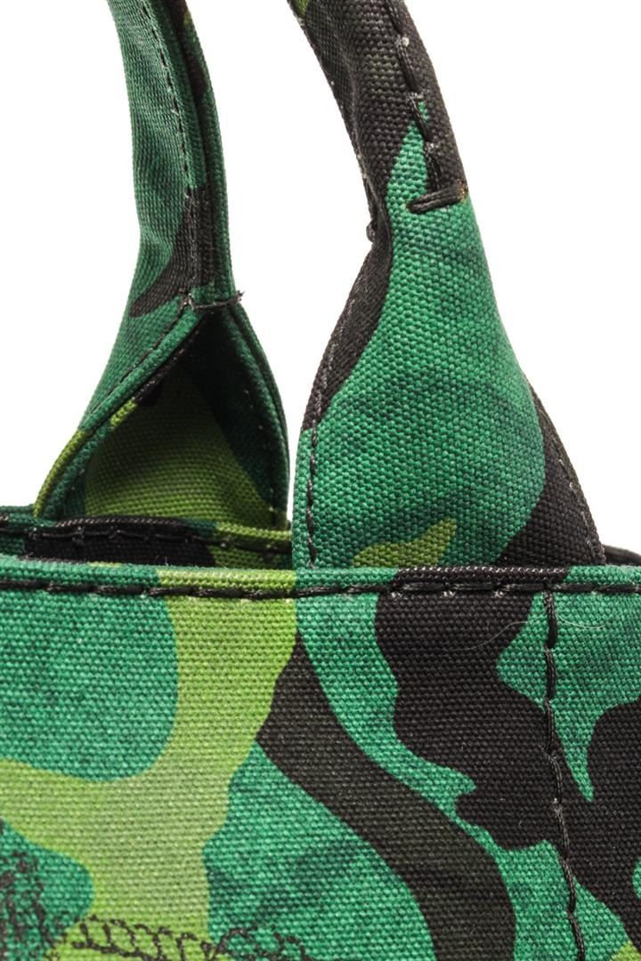 One Prada Green Camo Canvas Canapa Tote Bag. Item is sold AS-IS. All available information is listed in the description and shown in the photo. Prada Green Camo Canvas Canapa Tote Bag with top handle, canvas lining, interior zipper pocket, silver tone hardware. Height: 8.66" Width: 14.56" Depth: 9.44", Handle Drop: 4.92" / 22 x 37 x 24 Cm