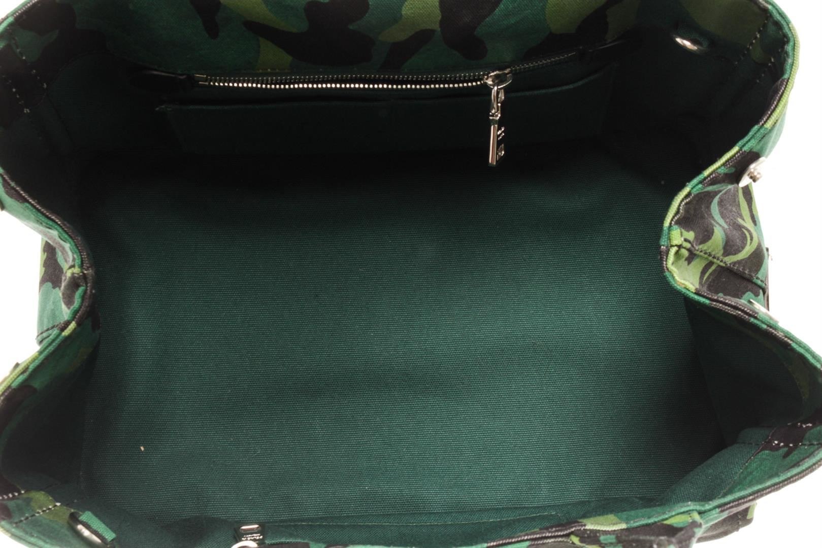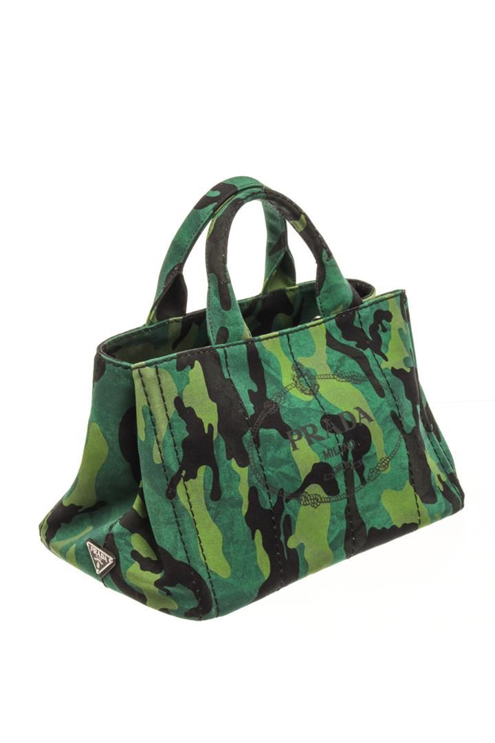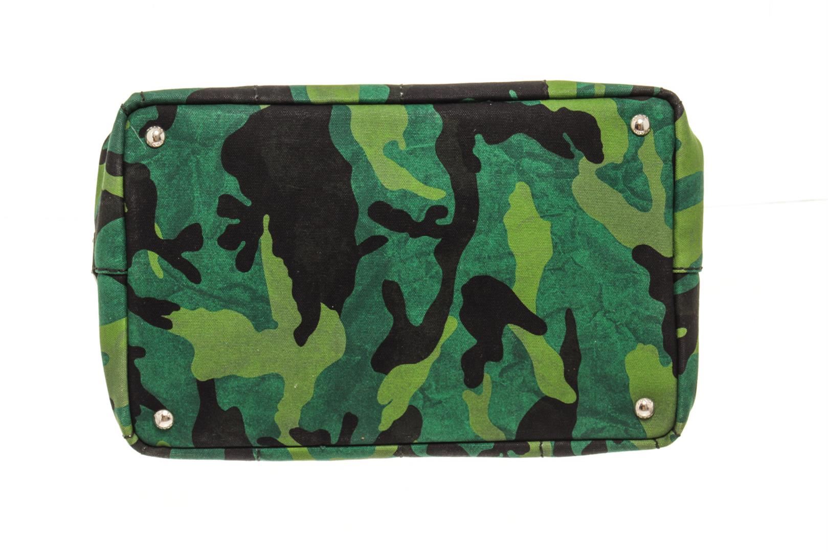 One Prada Green Camo Canvas Canapa Tote Bag. Item is sold AS-IS. All available information is listed in the description and shown in the photo. Prada Green Camo Canvas Canapa Tote Bag with top handle, canvas lining, interior zipper pocket, silver tone hardware. Height: 8.66" Width: 14.56" Depth: 9.44", Handle Drop: 4.92" / 22 x 37 x 24 Cm