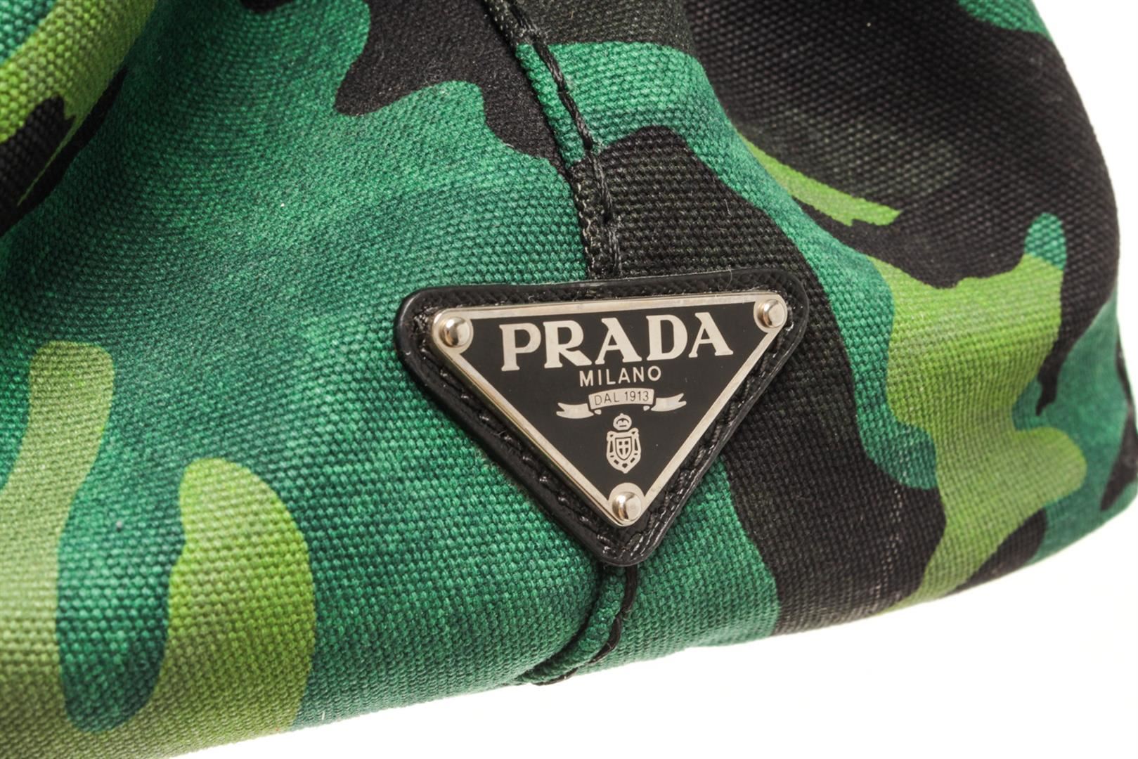 One Prada Green Camo Canvas Canapa Tote Bag. Item is sold AS-IS. All available information is listed in the description and shown in the photo. Prada Green Camo Canvas Canapa Tote Bag with top handle, canvas lining, interior zipper pocket, silver tone hardware. Height: 8.66" Width: 14.56" Depth: 9.44", Handle Drop: 4.92" / 22 x 37 x 24 Cm