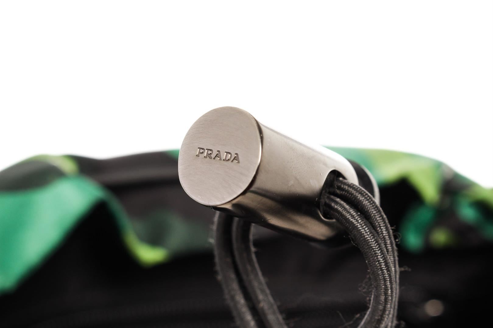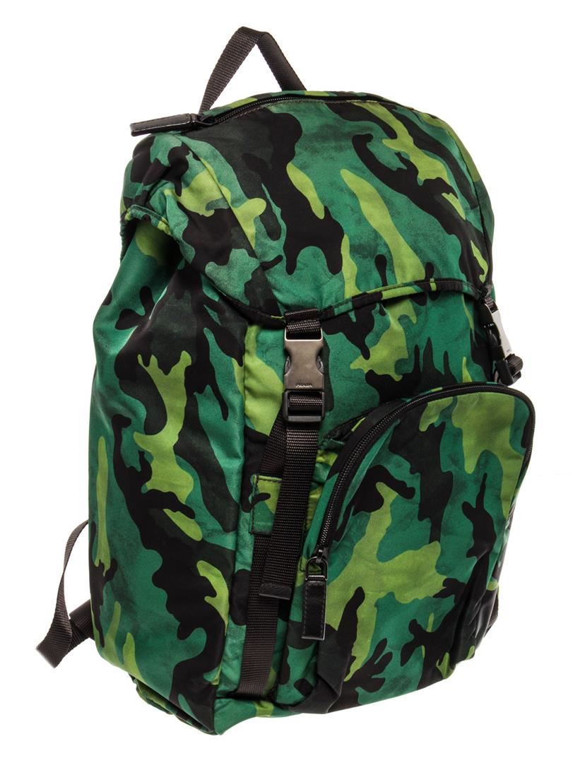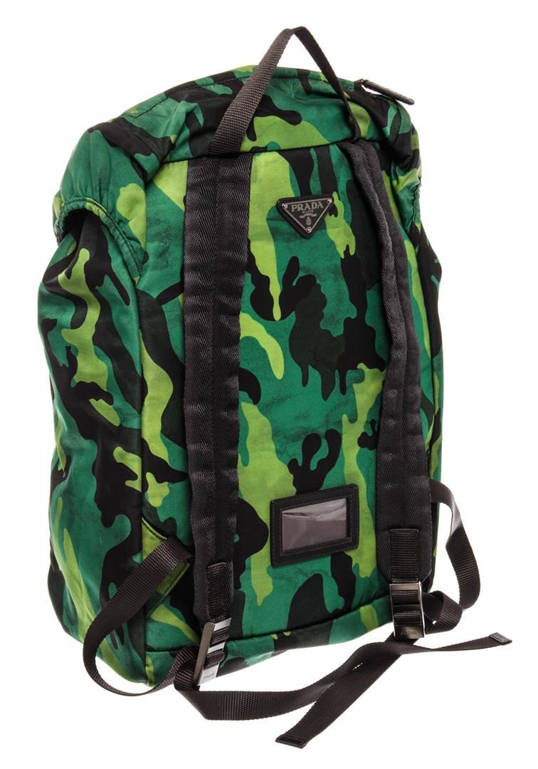 One Prada Green Printed Camo Tessuto Large Front Pocket Double Buckle Backpack. Item is sold AS-IS. All available information is listed in the description and shown in the photo. Prada Large Backpack features green multicolor camouflage Tessuto nylon, black nylon top handle, front pocket with zipper, two black padded shoulder strap that can be adjusted, silver-tone hardware, drawstring closure for the main compartment with flap on top completed with double buckles and black canvas lining. Height 14", Width 10.5", Depth 6", Strap Drop 6-18"