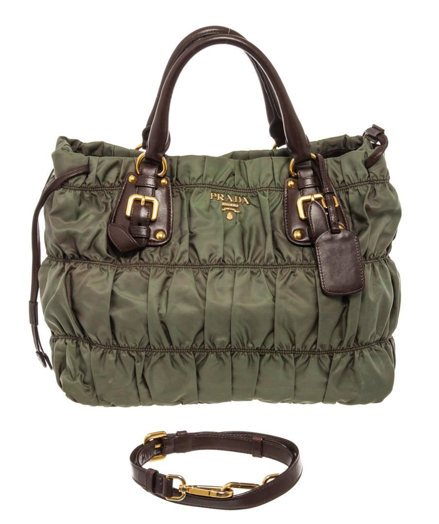 Prada Gaufre tote bag features a gathered green nylon body, two rolled leather handles, gold-tone hardware, a detachable flat leather strap, a top magnetic closure, side laces that cinch, brown Jacquard canvas lining and slip pockets inside. Length:,