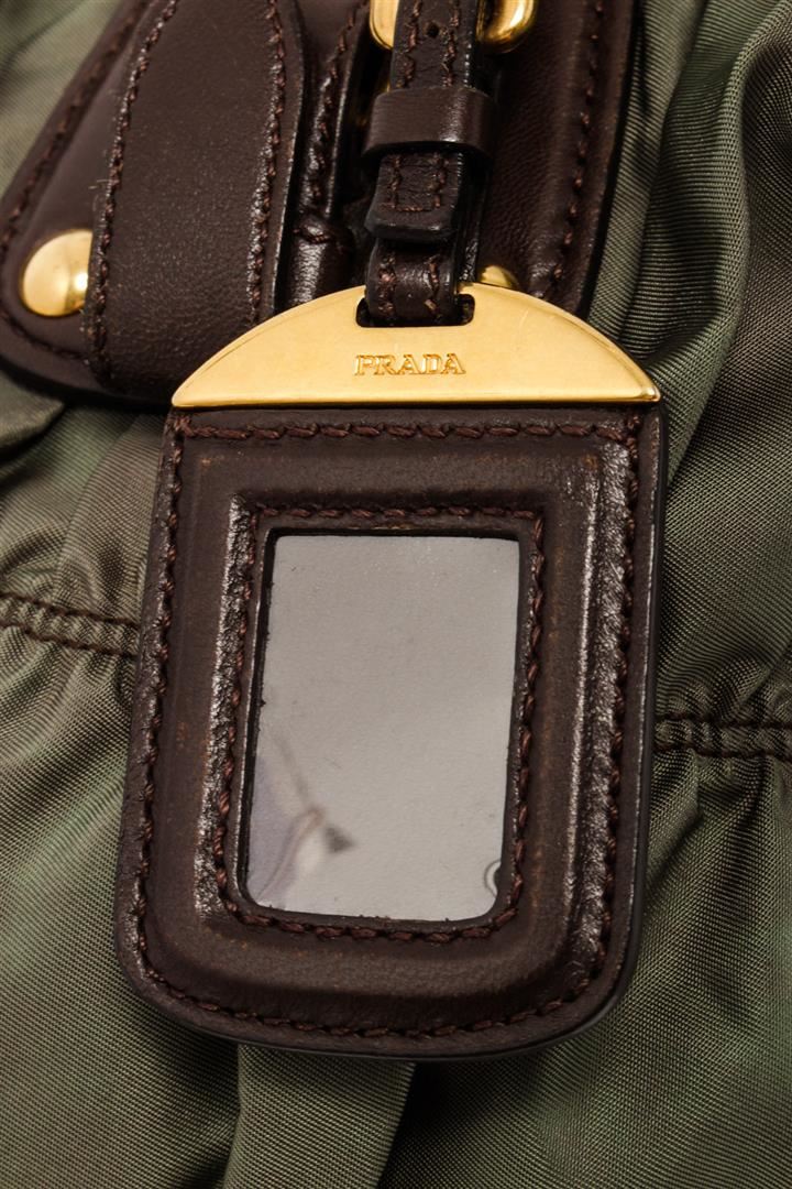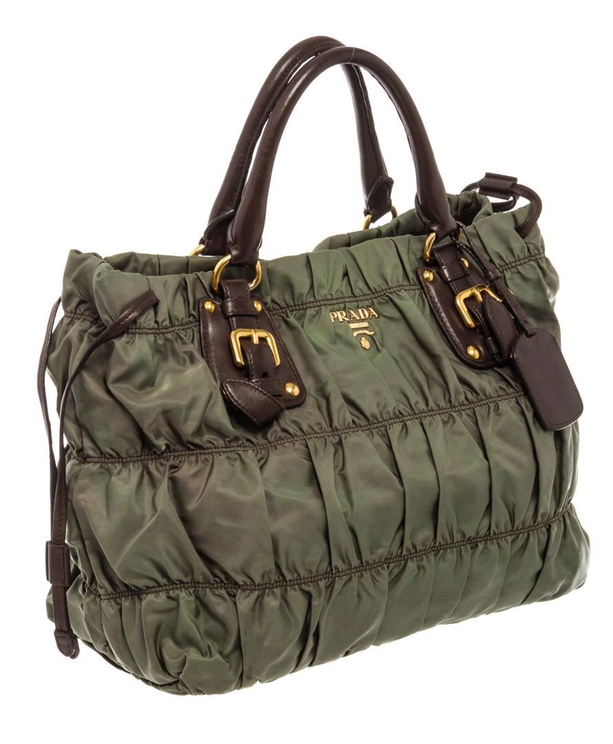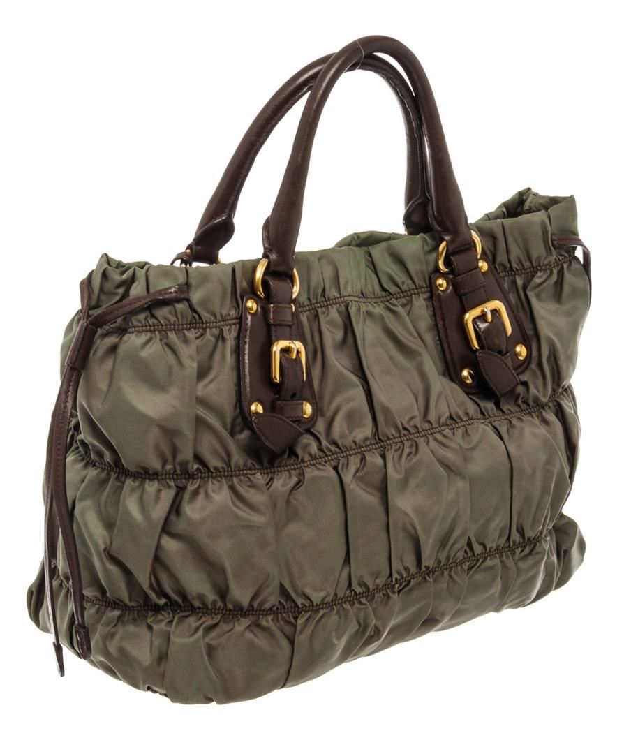Prada Gaufre tote bag features a gathered green nylon body, two rolled leather handles, gold-tone hardware, a detachable flat leather strap, a top magnetic closure, side laces that cinch, brown Jacquard canvas lining and slip pockets inside. Length:,