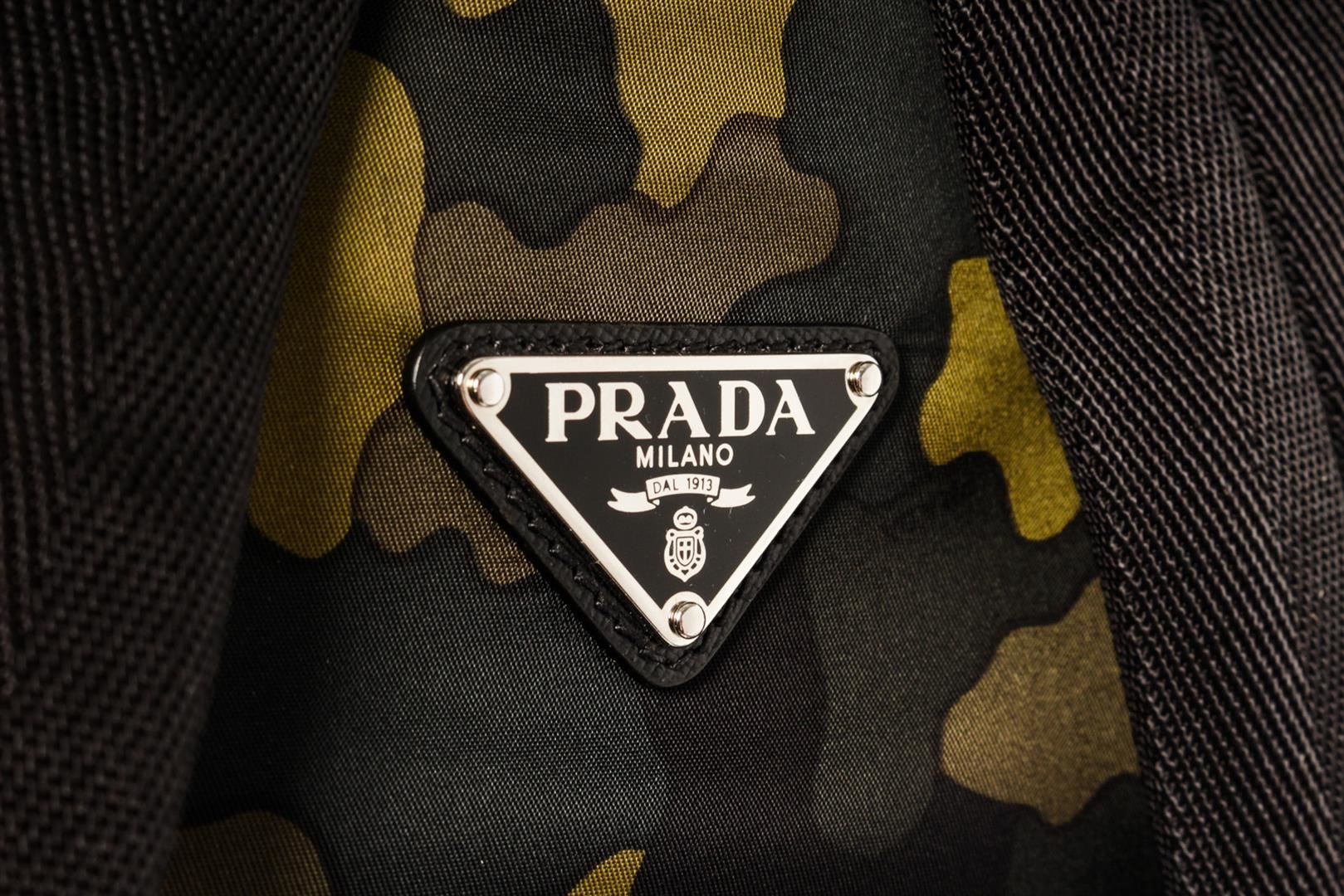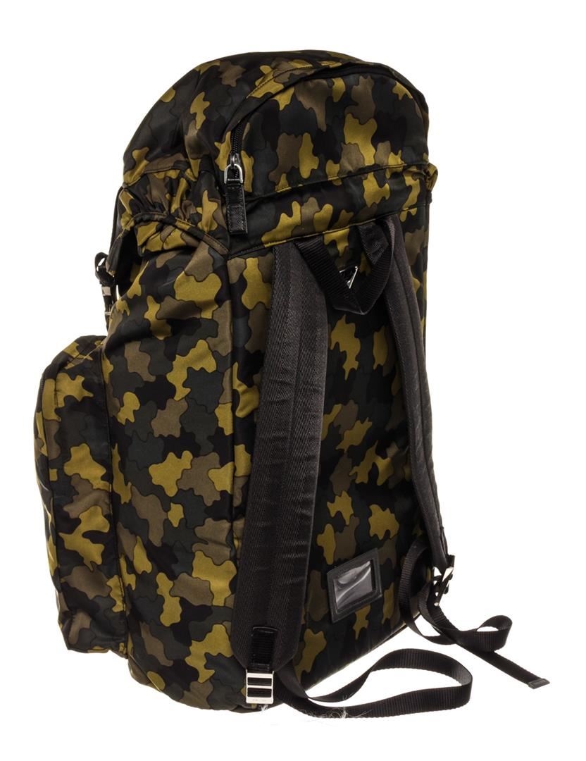 One Prada Green Yellow Multicolor Printed Camo Tessuto Nylon Double Pocket Buckle Large Backpack. Item is sold AS-IS. All available information is listed in the description and shown in the photo. Prada Large Backpack features yellow multicolor camouflage Tessuto nylon with two front zipper pockets with zippers, black nylon top handle, two black padded shoulder strap that can be adjusted, silver-tone hardware, flap over main compartment and black canvas lining. Height 22", Width 13", Depth 6", Strap Drop 8-20"